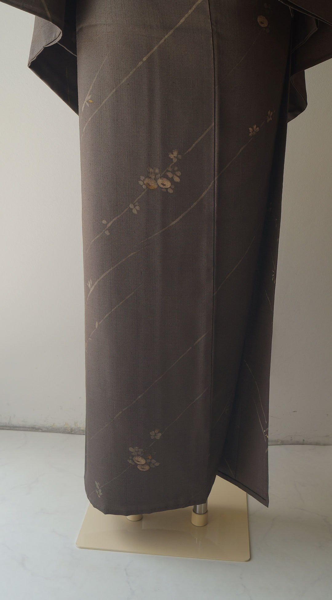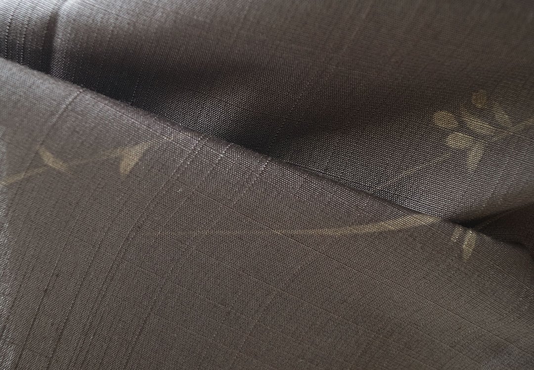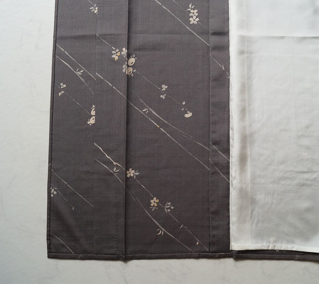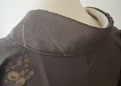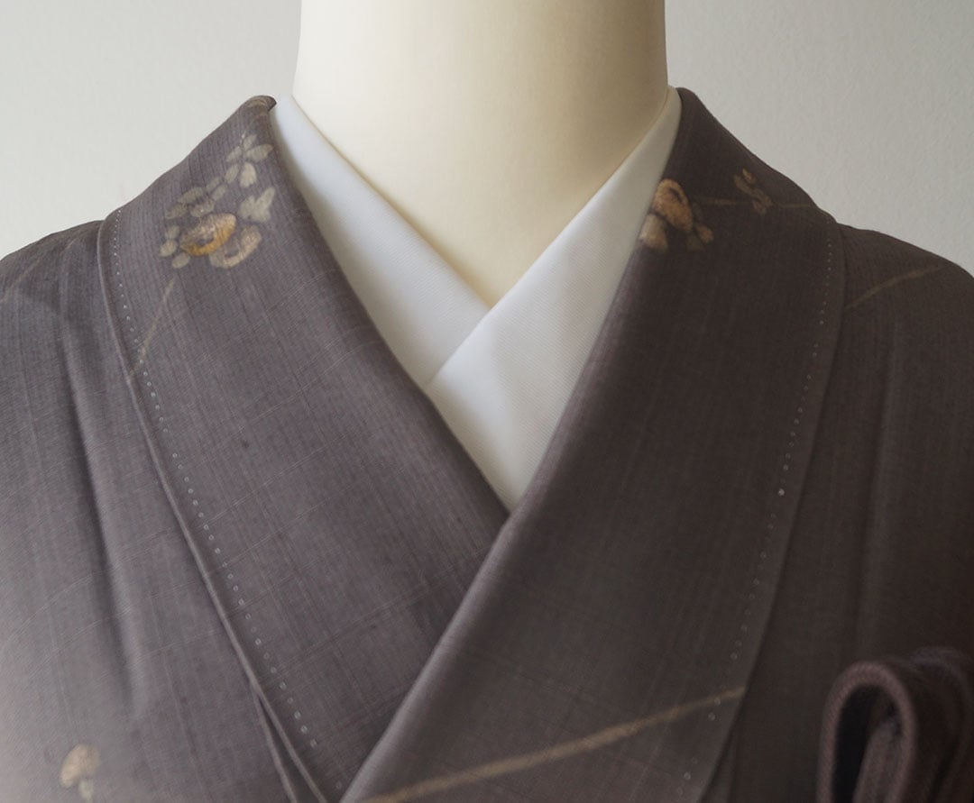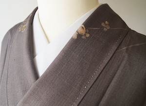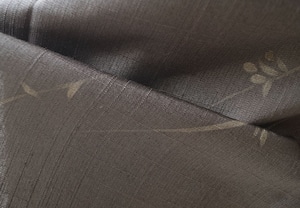 【単衣】 涅色 ラインに花文 染め紬