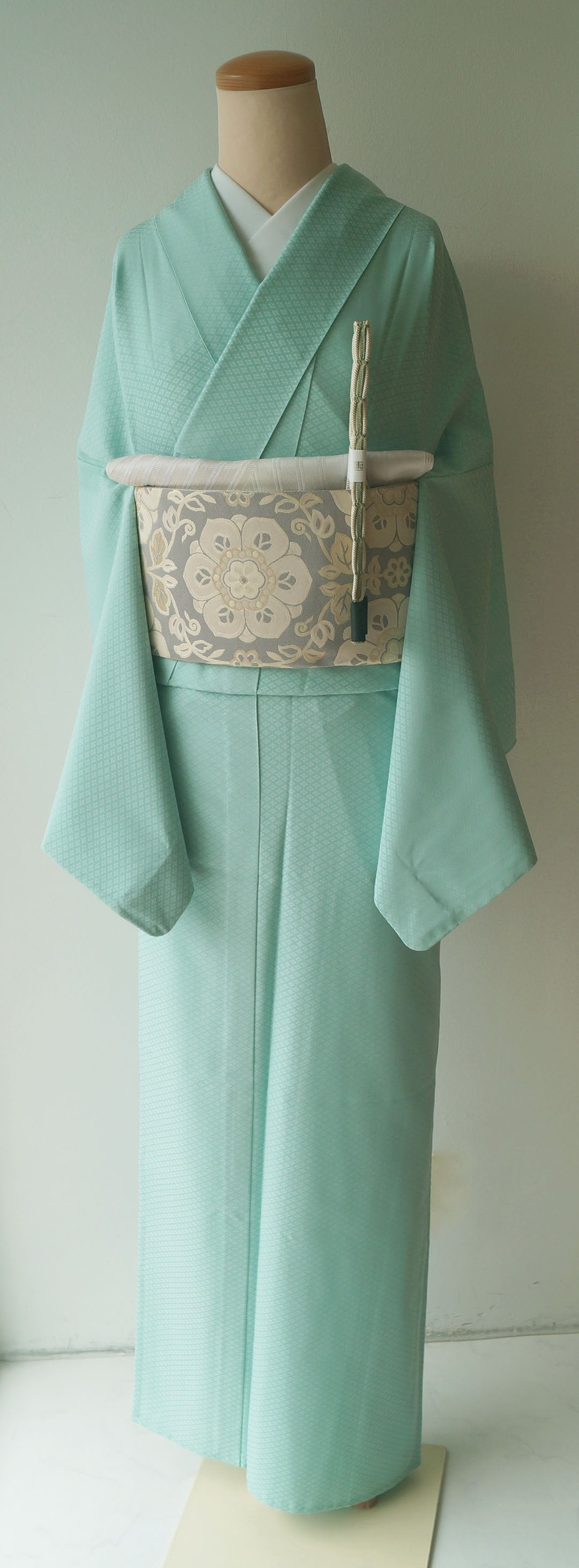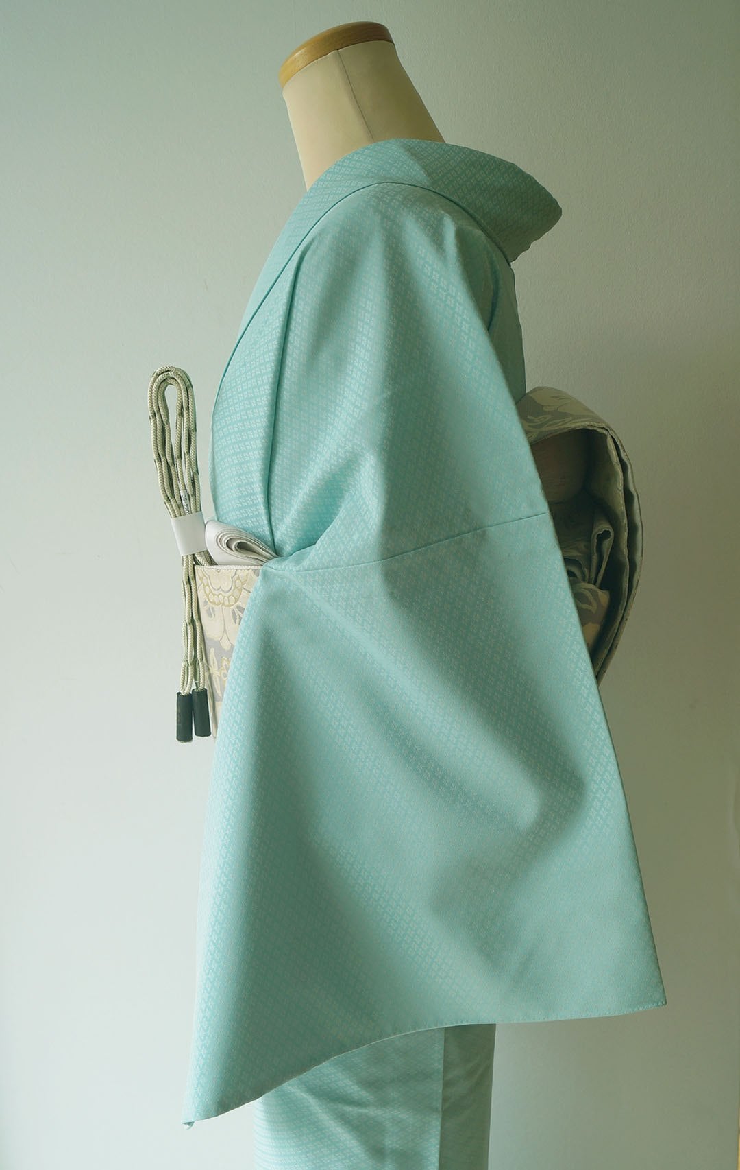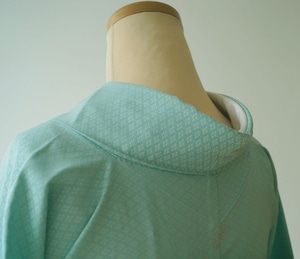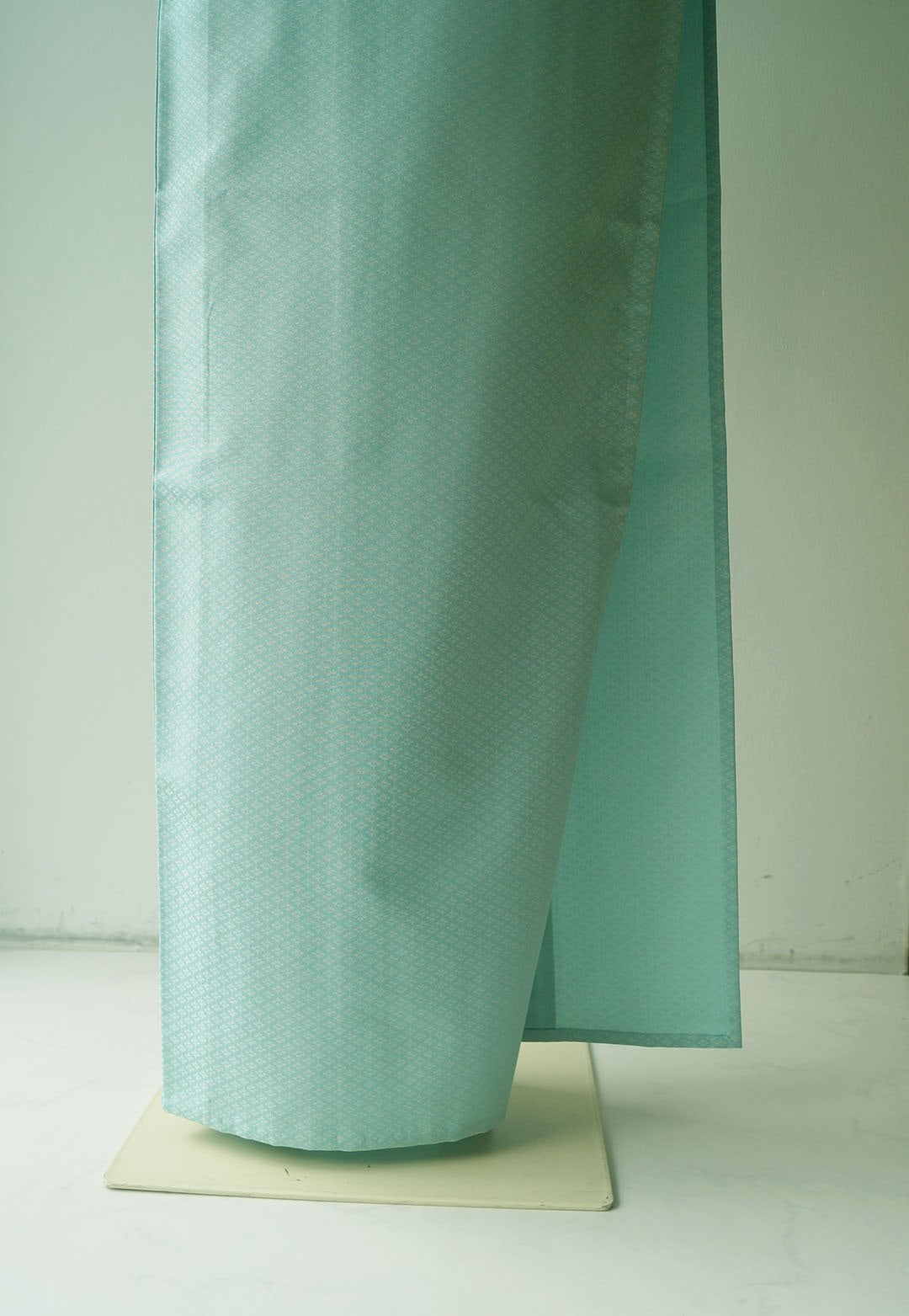 【単衣】 ゆとりサイズ ターコイズ色 五百機小紋 縫いの一つ紋