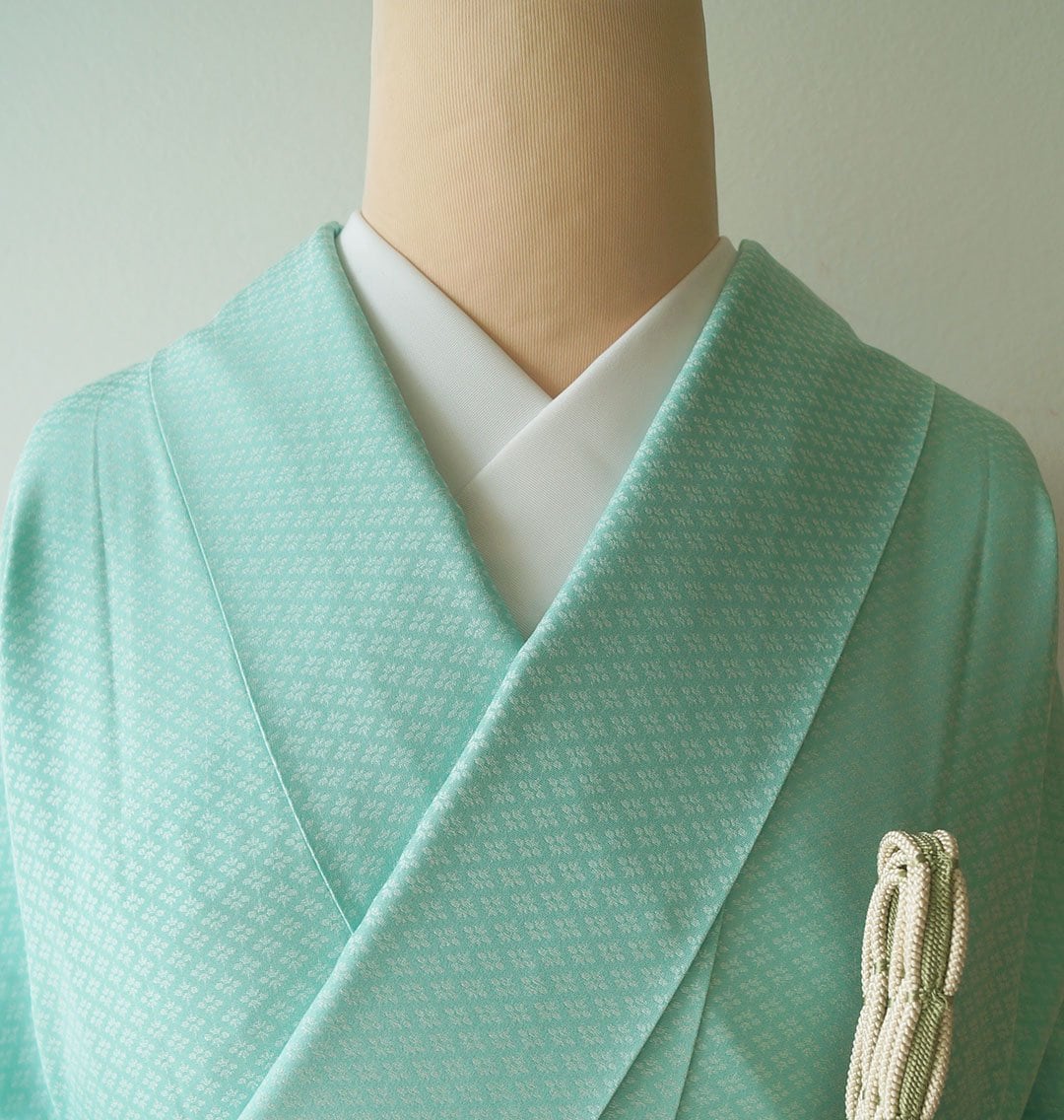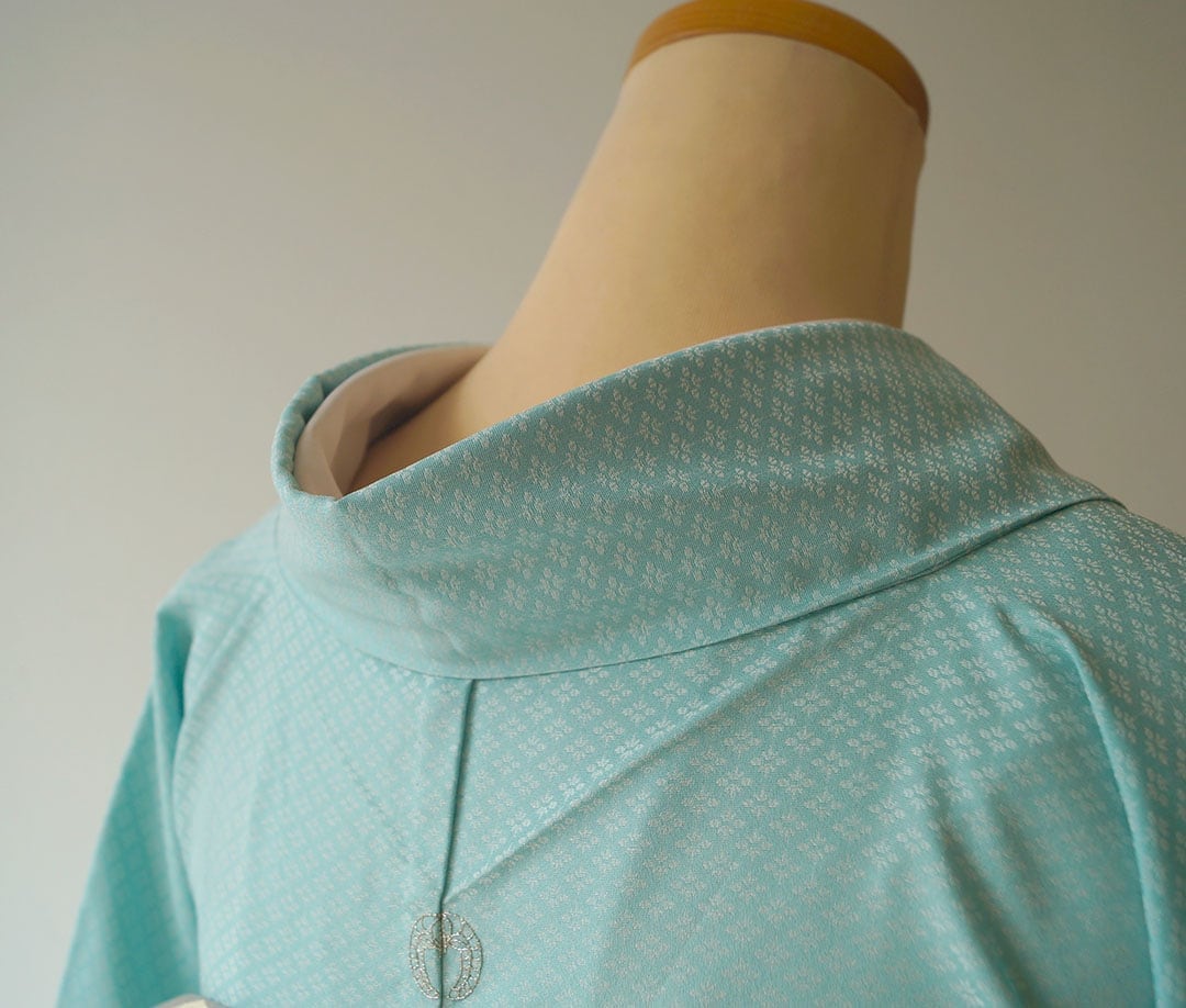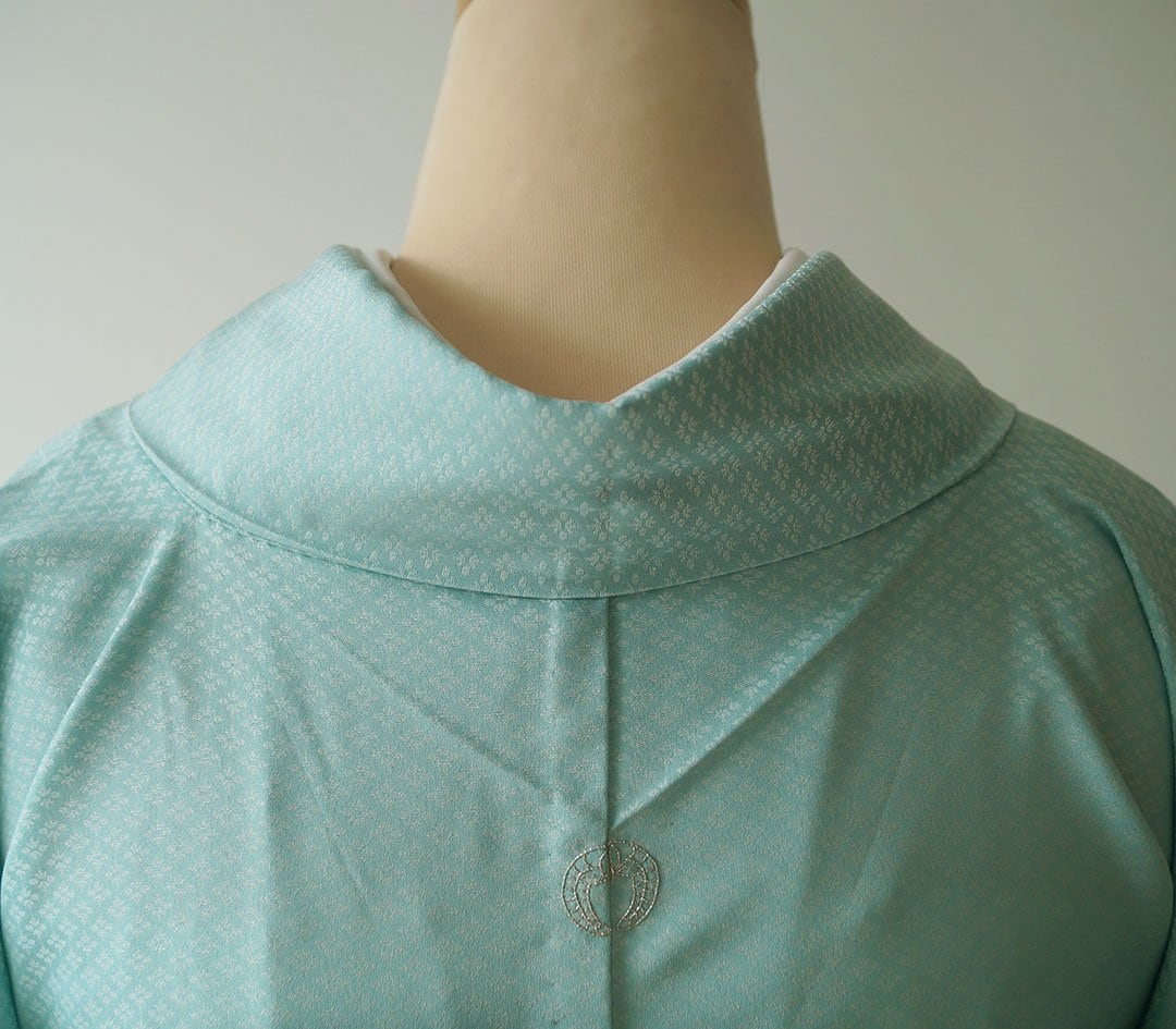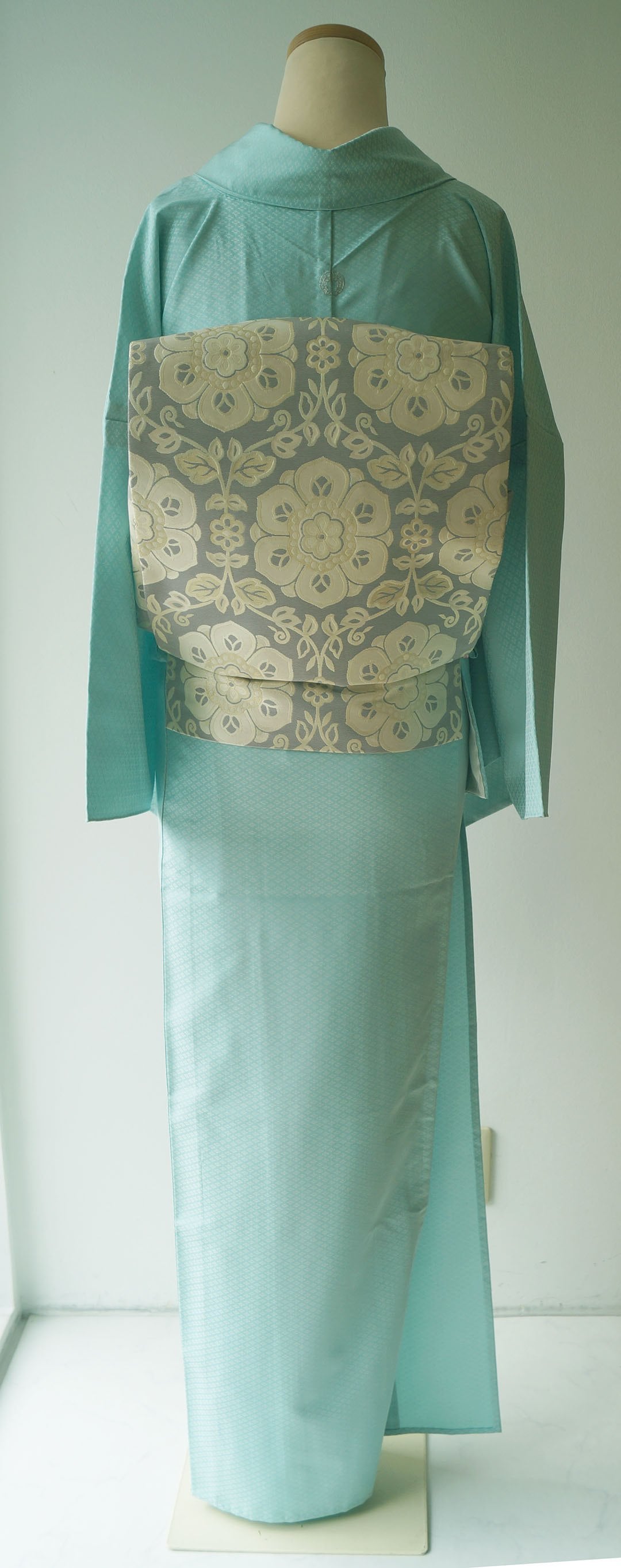 【単衣】 ゆとりサイズ ターコイズ色 五百機小紋 縫いの一つ紋