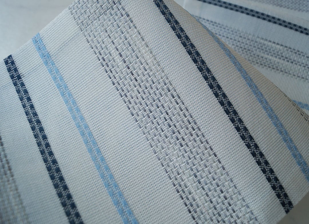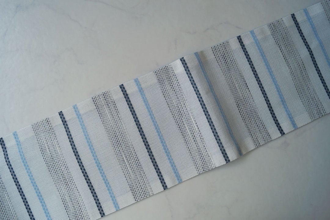 【半幅帯】オフホワイト×褐返色×勿忘草色 変わり縞柄 麻半幅帯 No.250130④