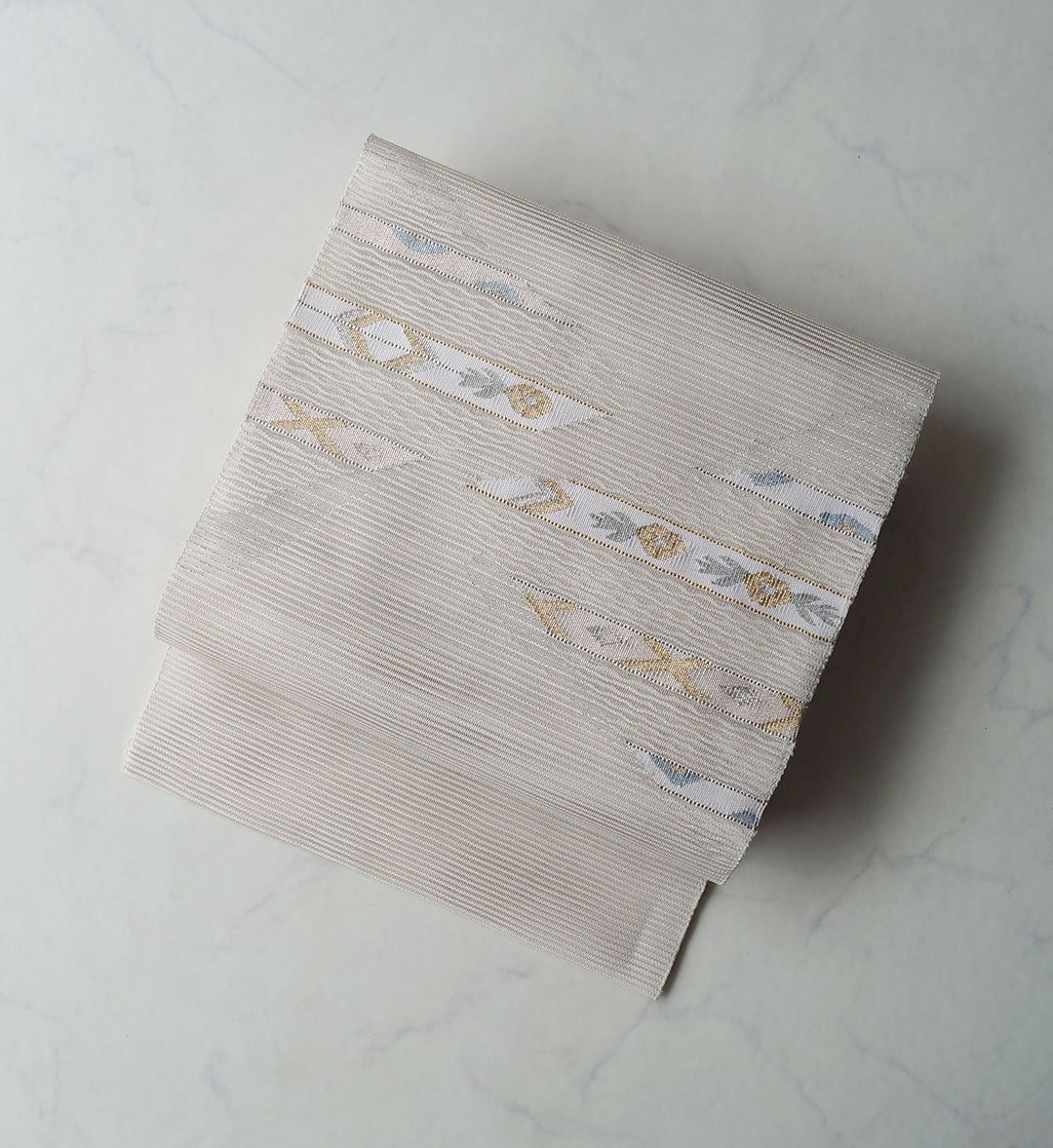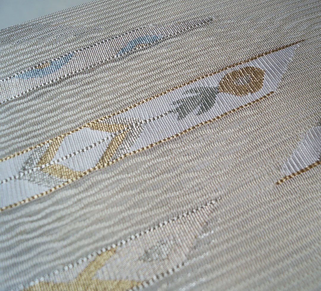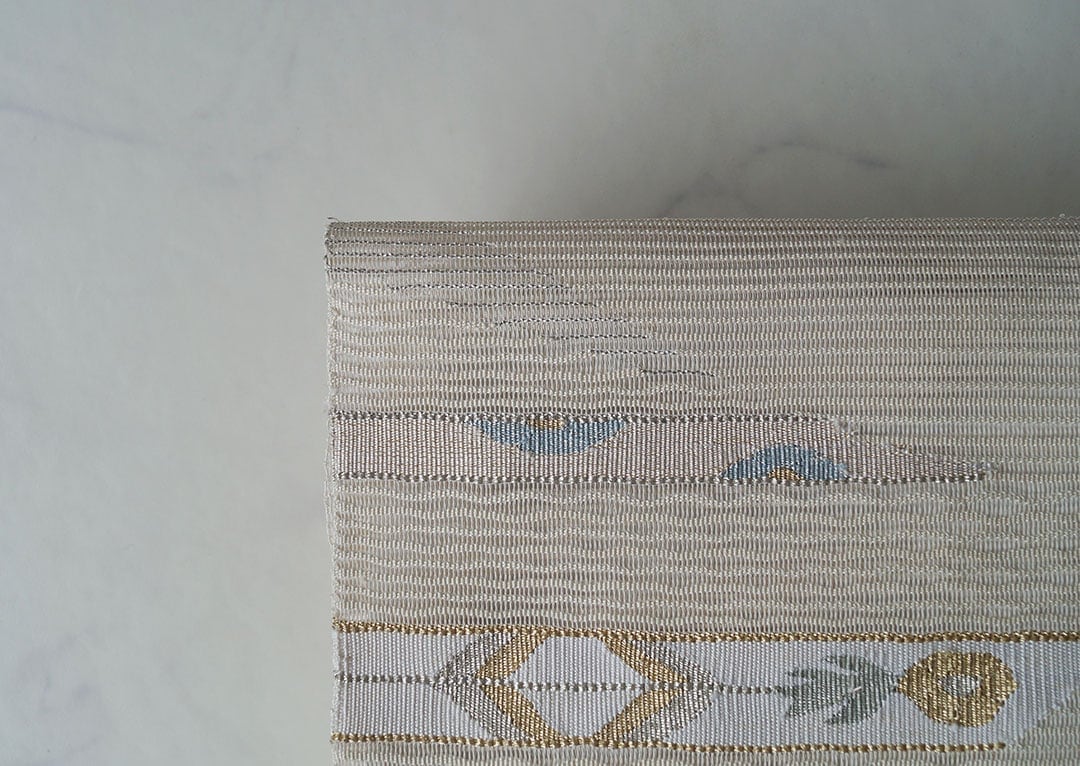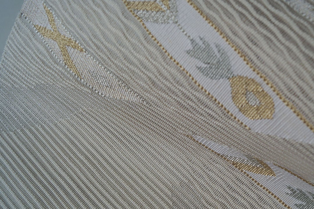 【夏なごや帯】生成り地 幾何学に花文 絽綴れ 開きなごや帯