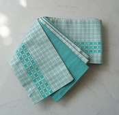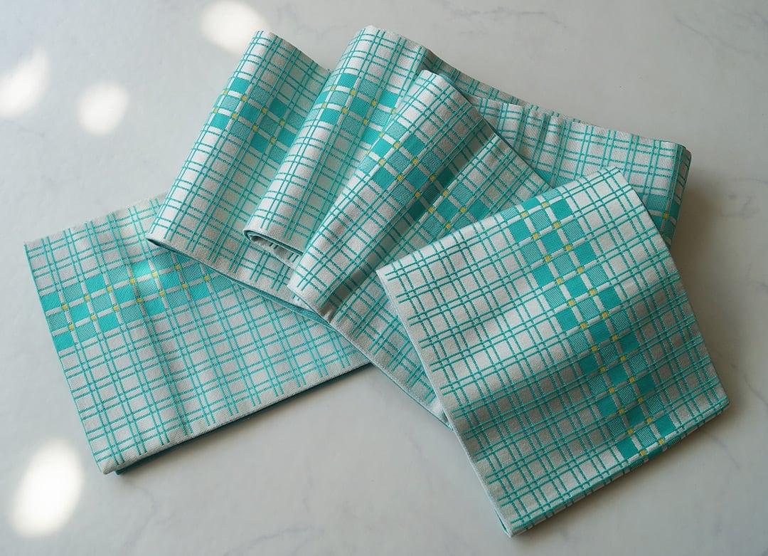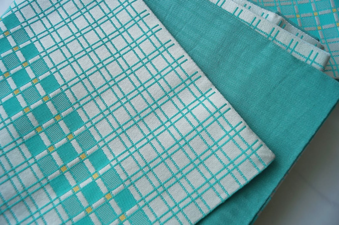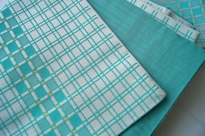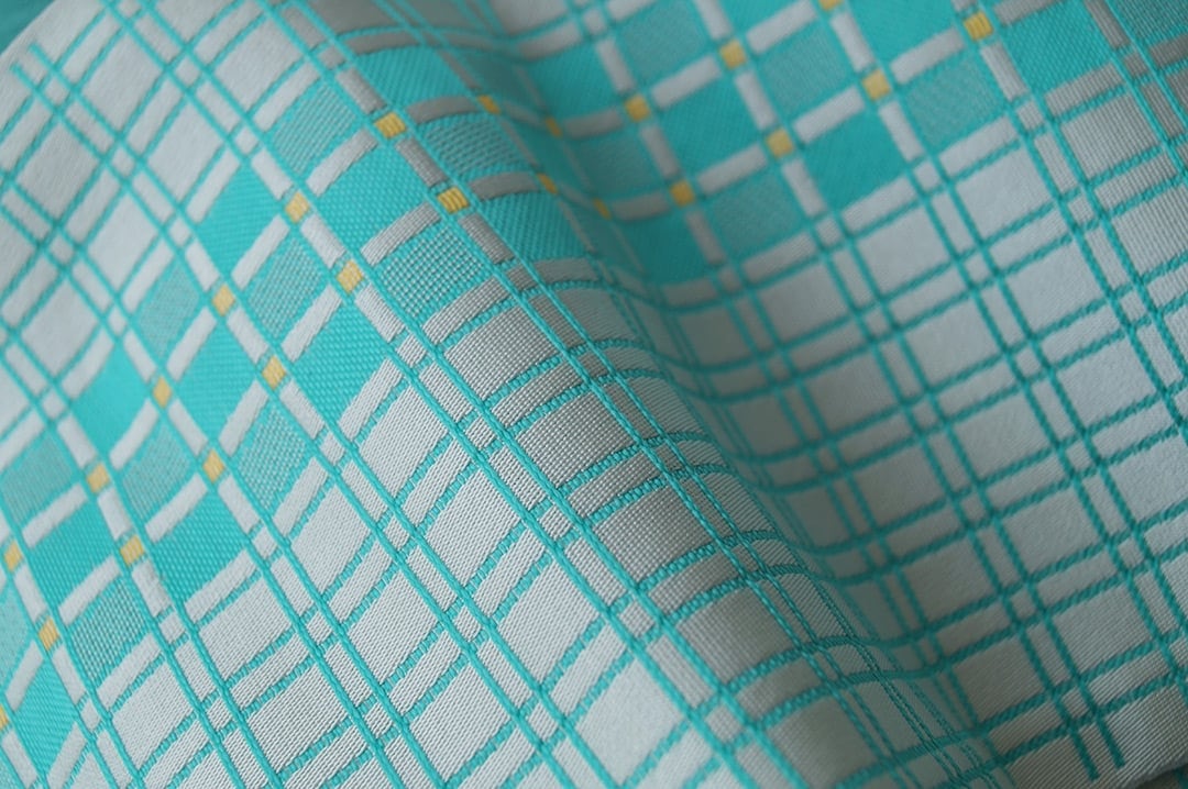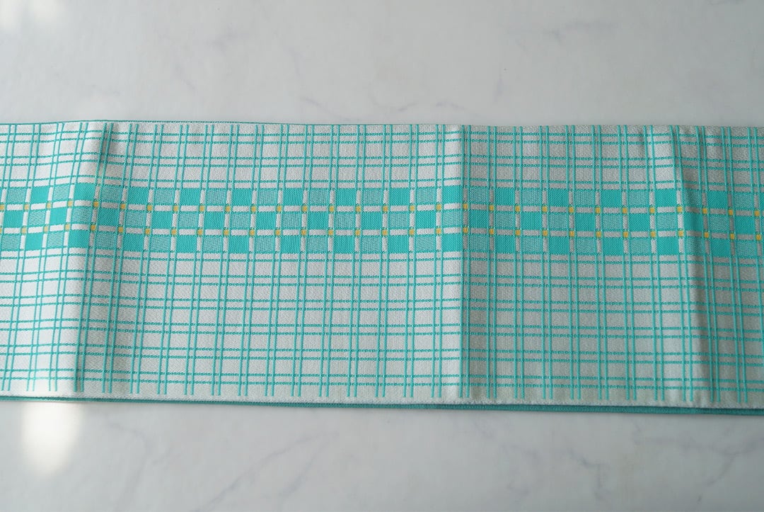 翡翠色と胡粉色の格子柄半幅帯です。