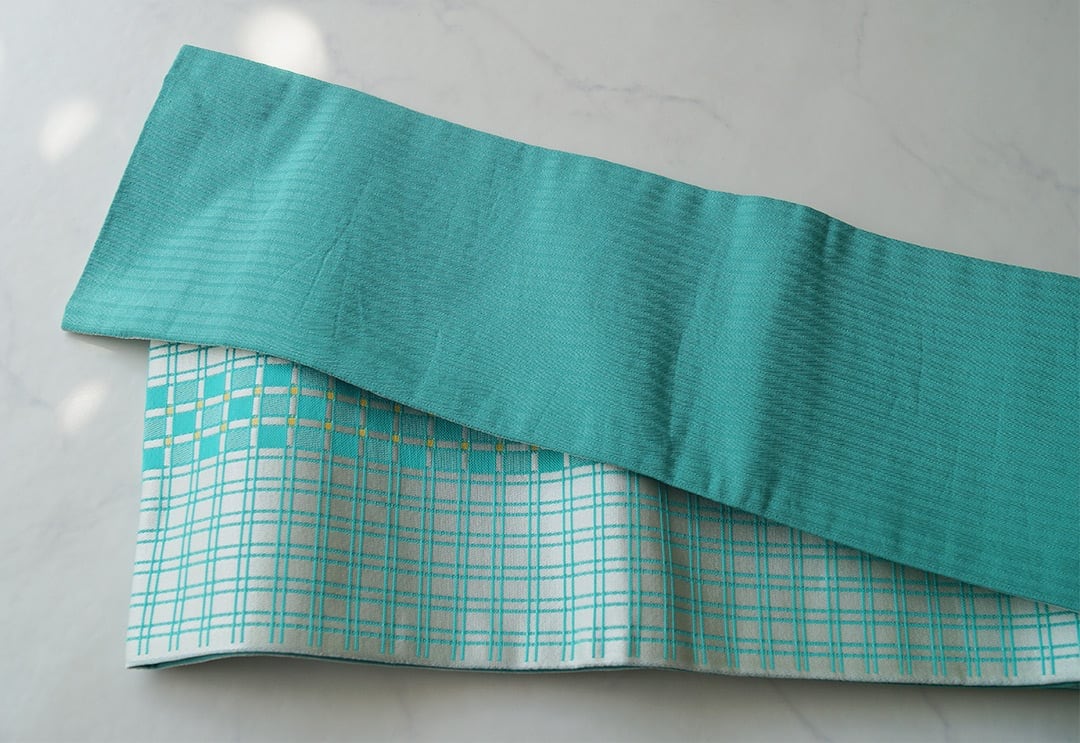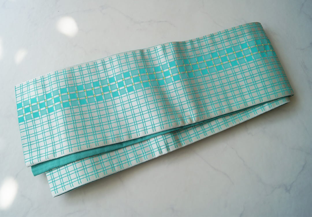 【半幅帯】翡翠色×胡粉色 格子 化繊半幅帯