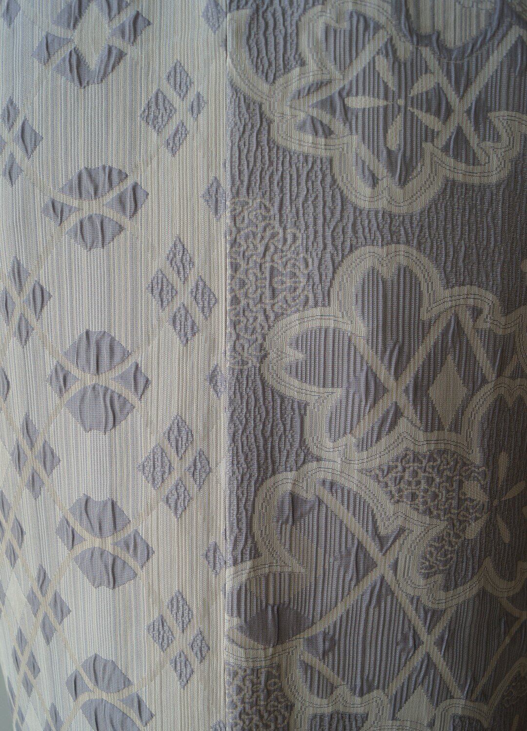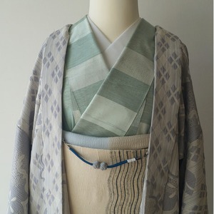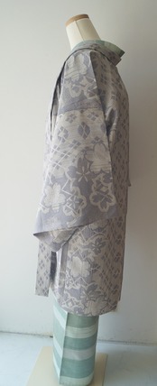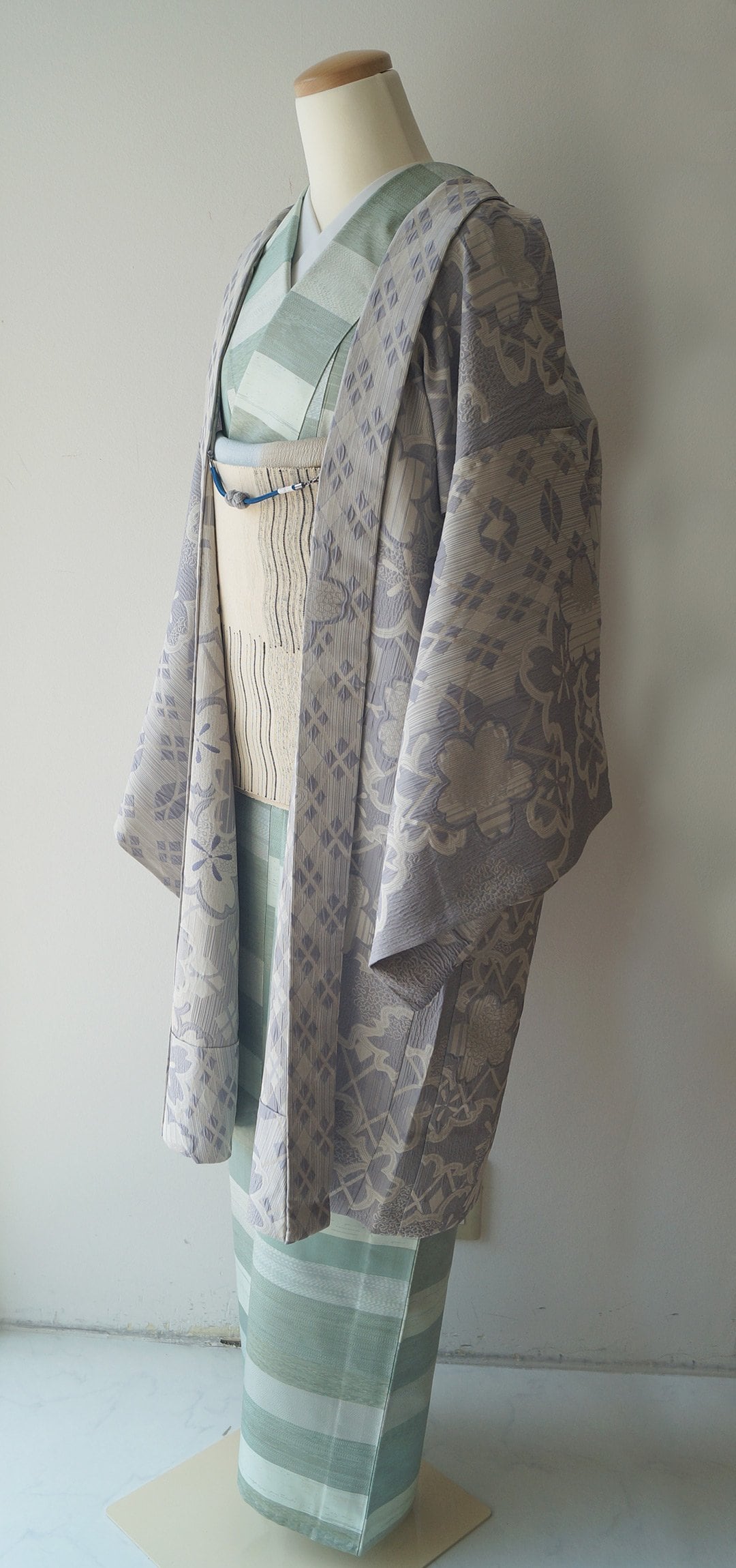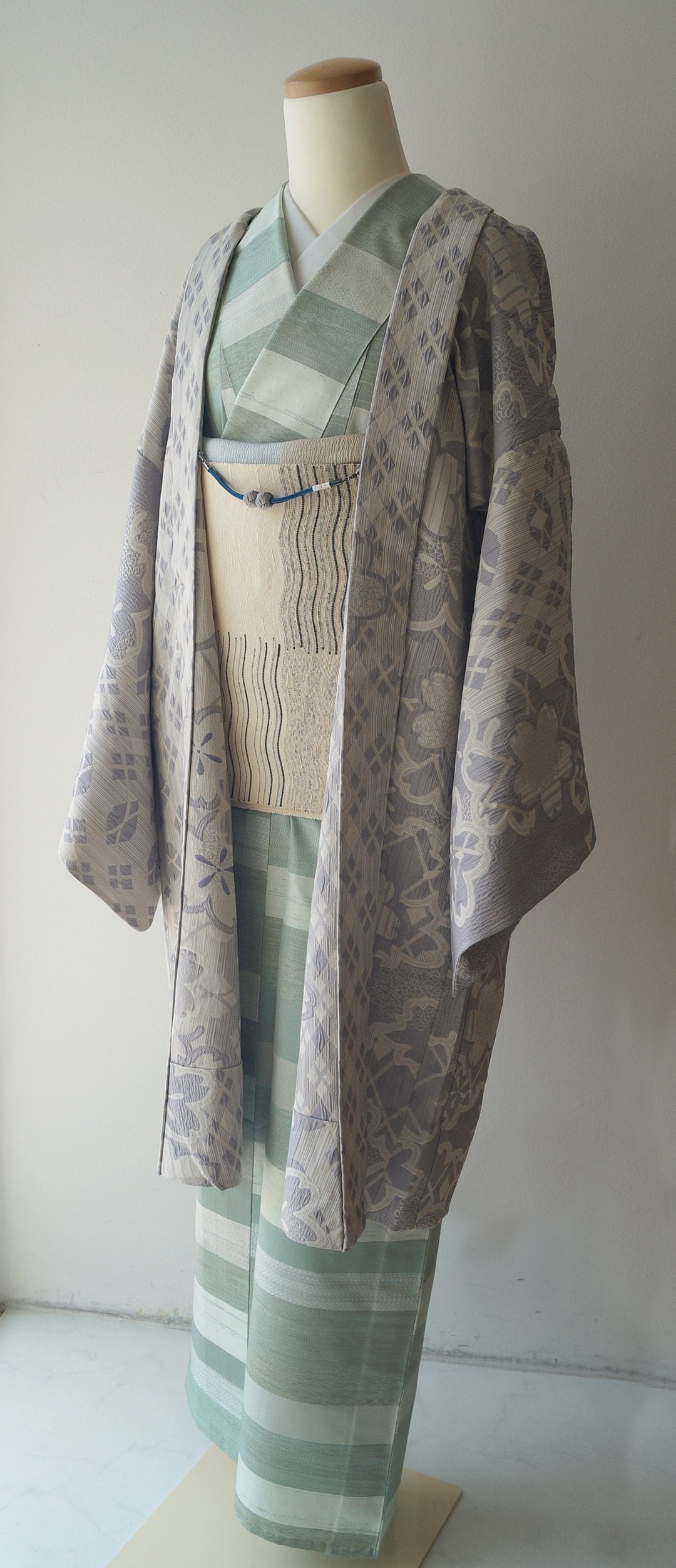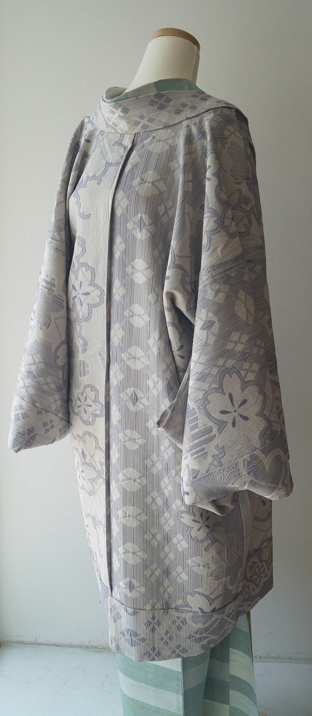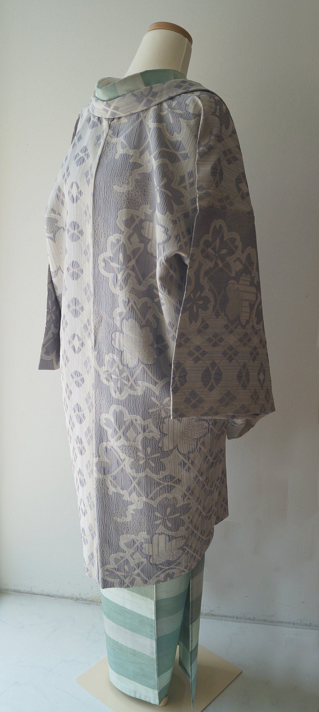 【単衣羽織】白藤色×白練色 桜と菱の幾何学文 お召し単衣羽織