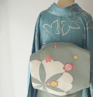 【なごや帯】錆青磁地 桜尽くし文様 型染めなごや帯