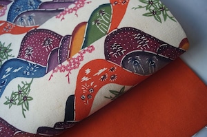【難あり・なごや帯】 生成り色×朱色系 遠山文 型染め 紬なごや帯