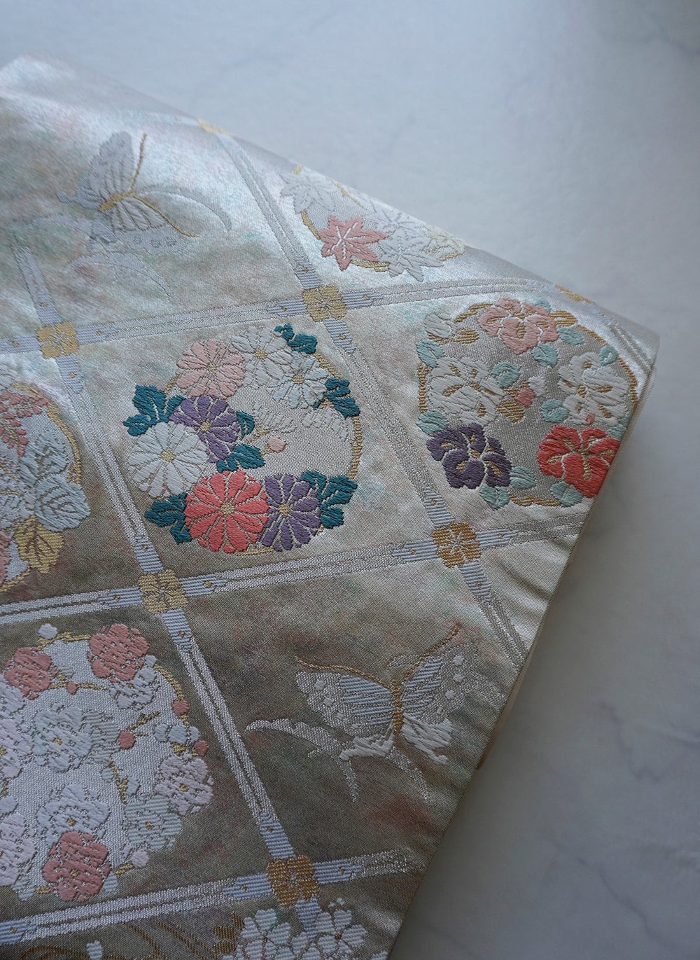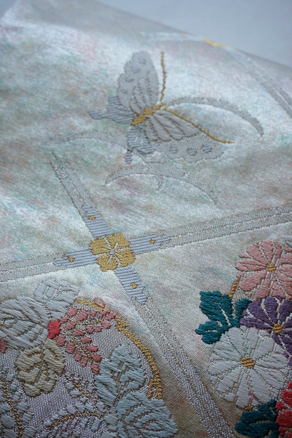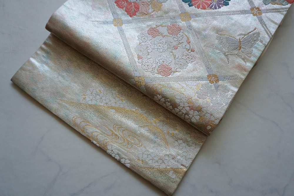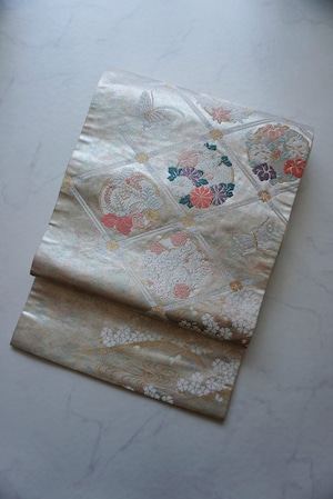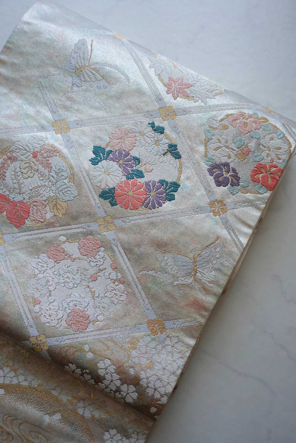 四季の花丸文に蝶々などが織り込まれた箔帯。
