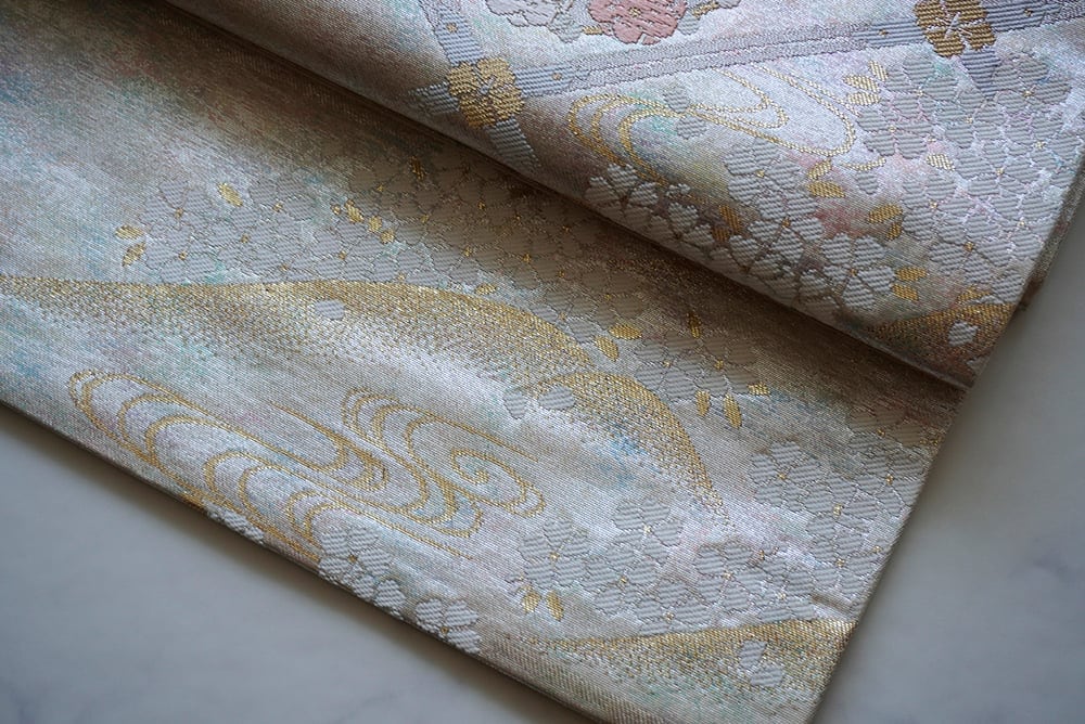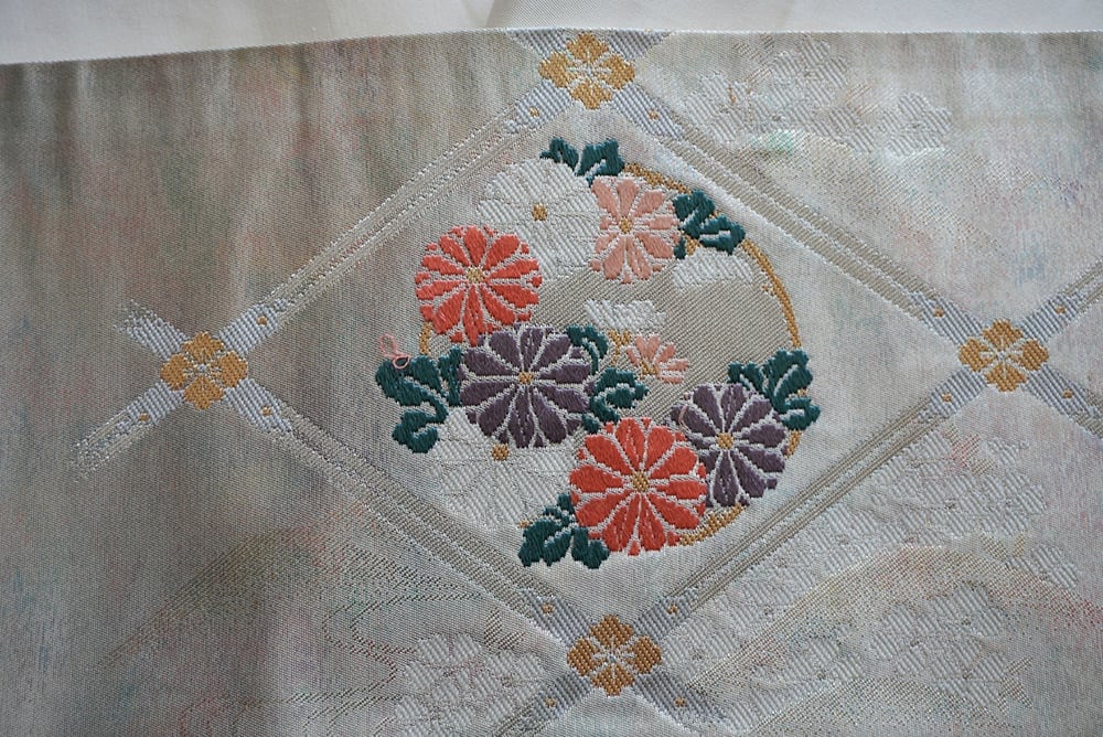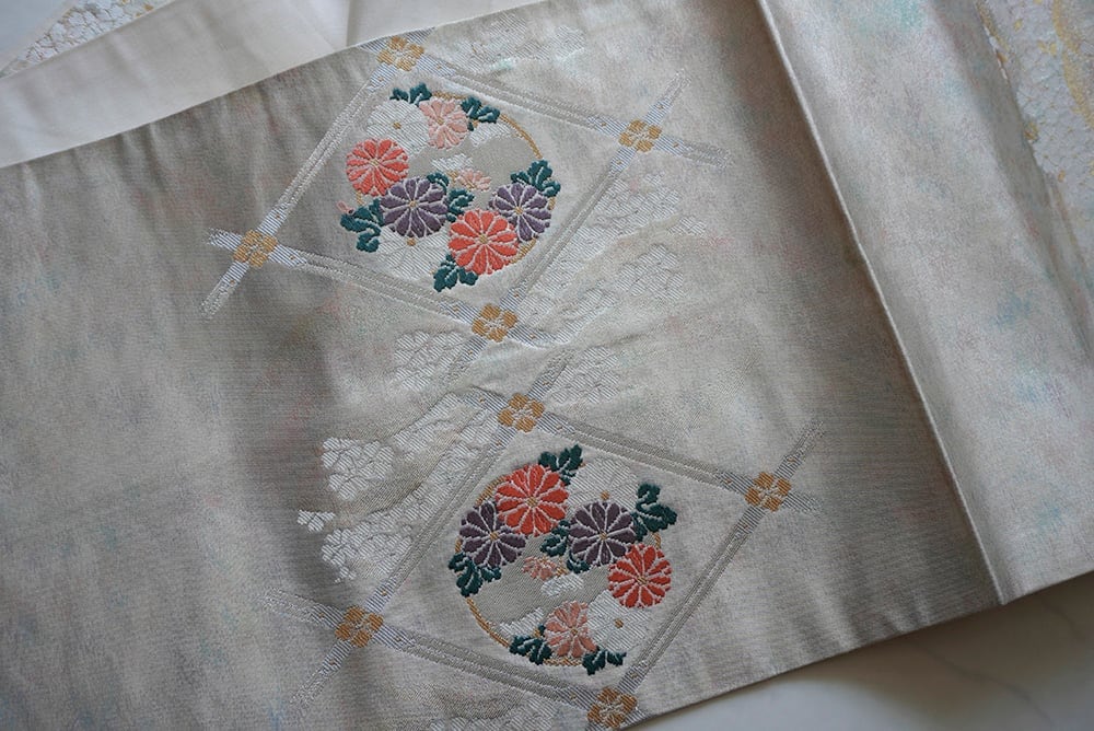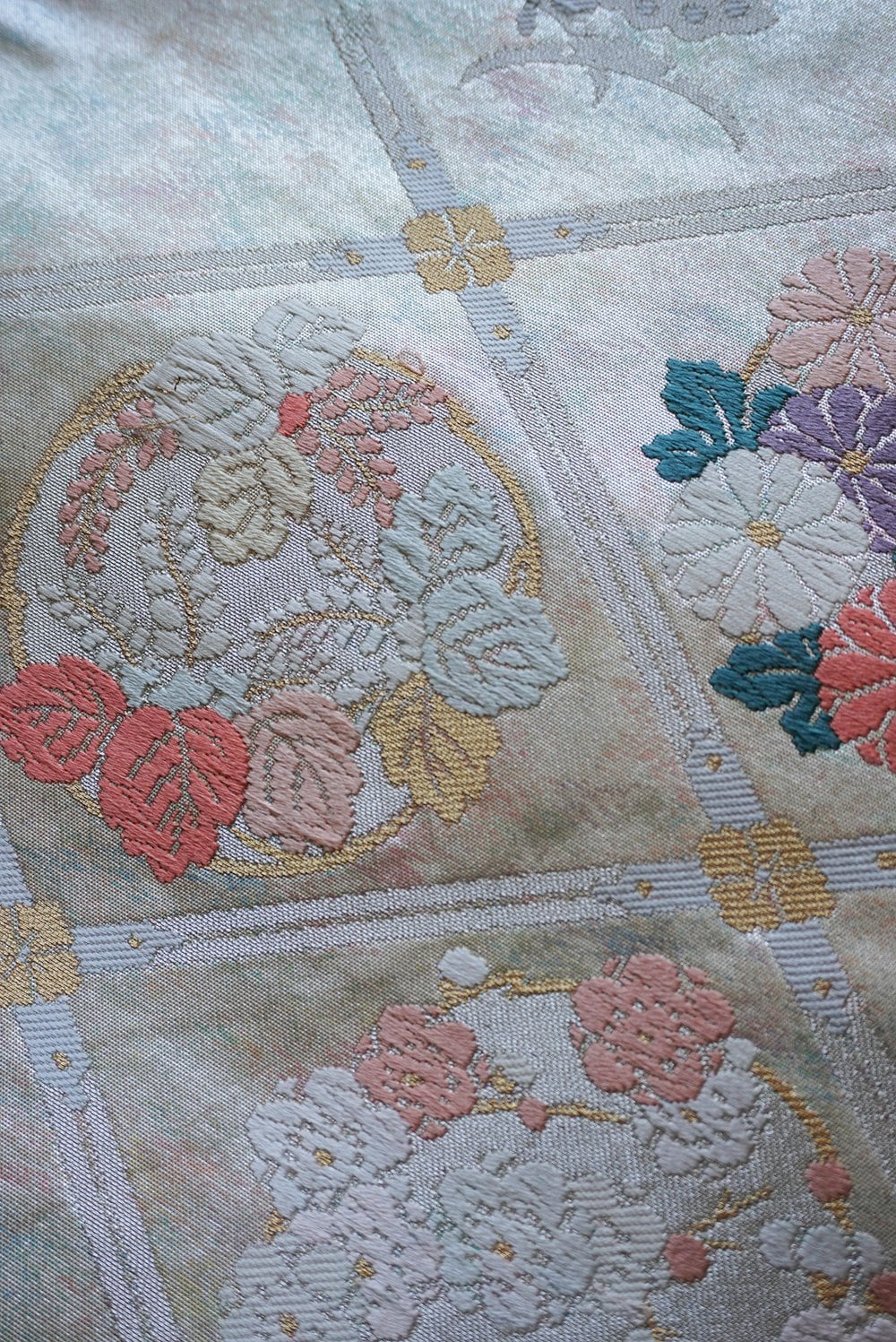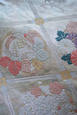 四季の花丸文に蝶々などが織り込まれた箔帯。