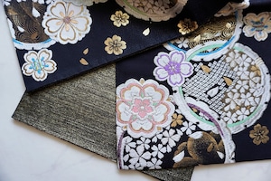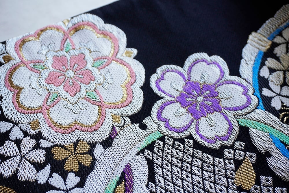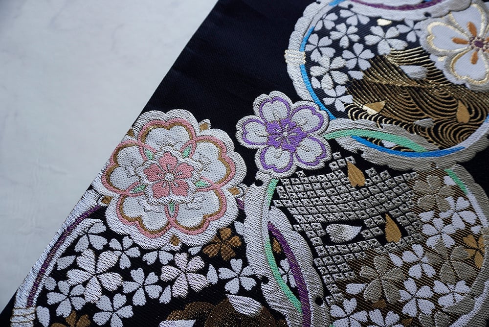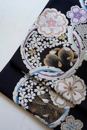 黒地に雪輪繋ぎ、桜の文様の可憐なお柄です。