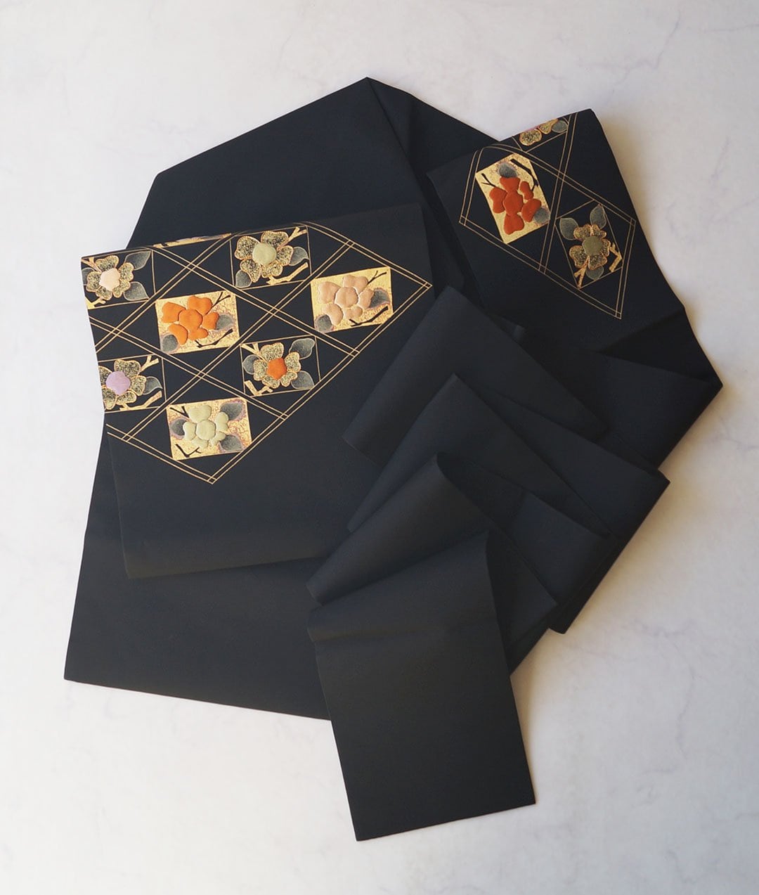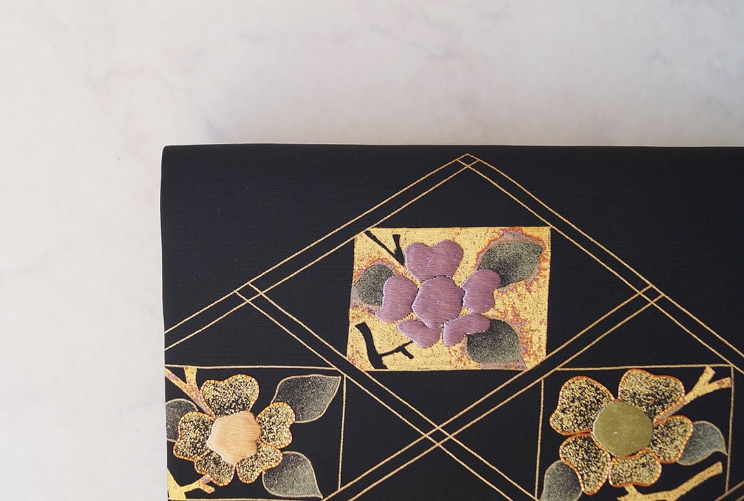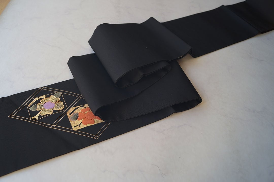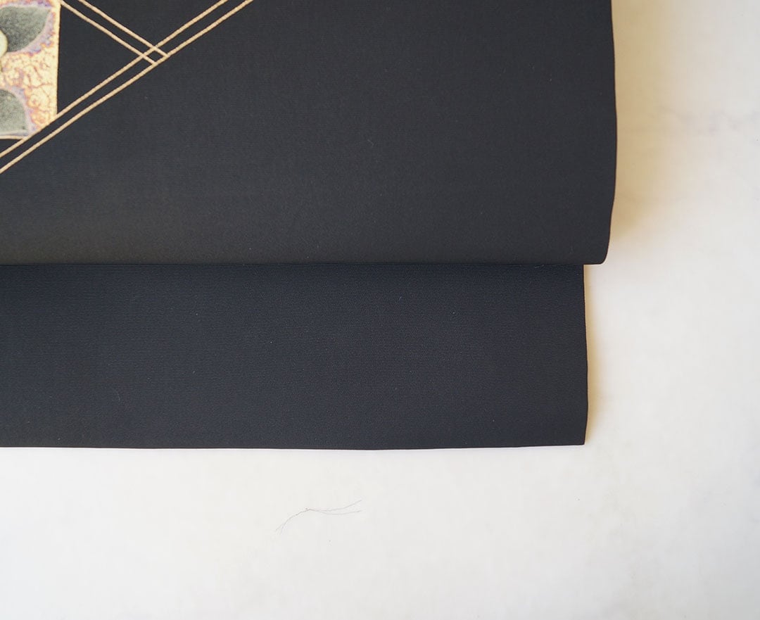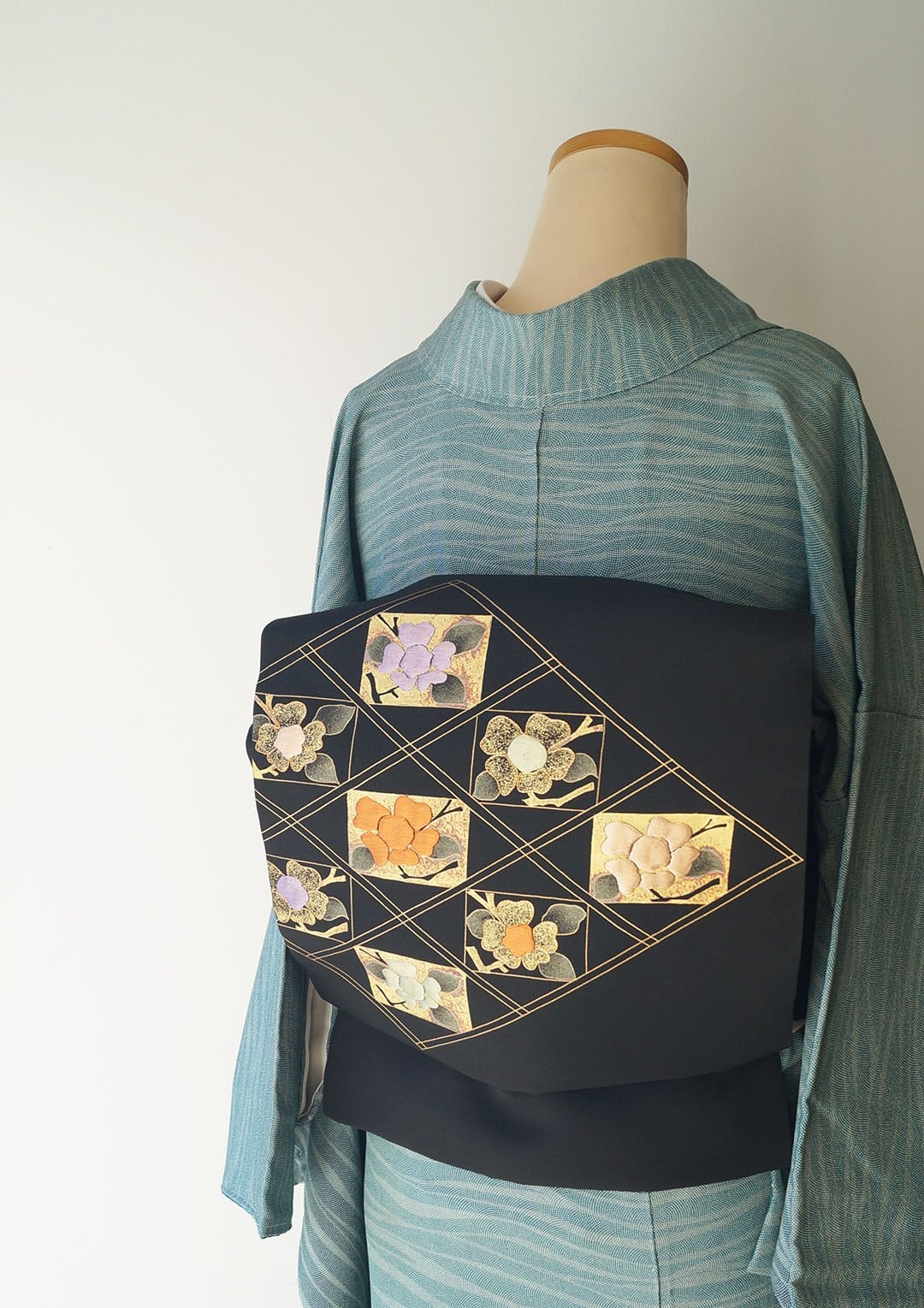 【なごや帯】黒色地 菱に椿文 塩瀬なごや帯