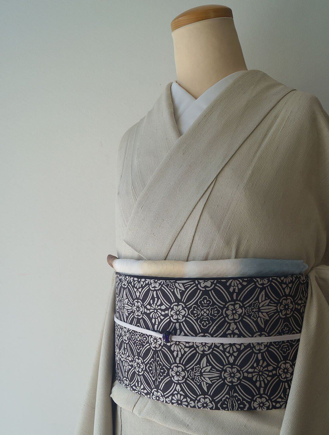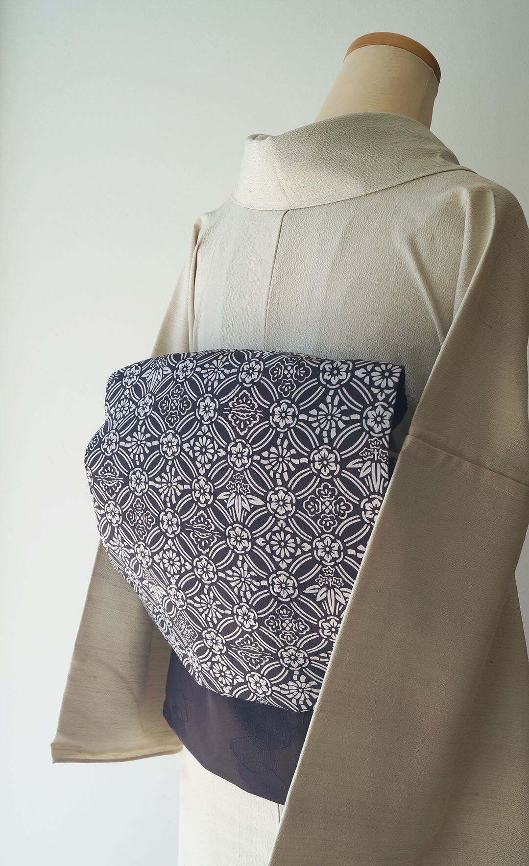 白梅鼠色の七宝繋ぎ文のなごや帯です。