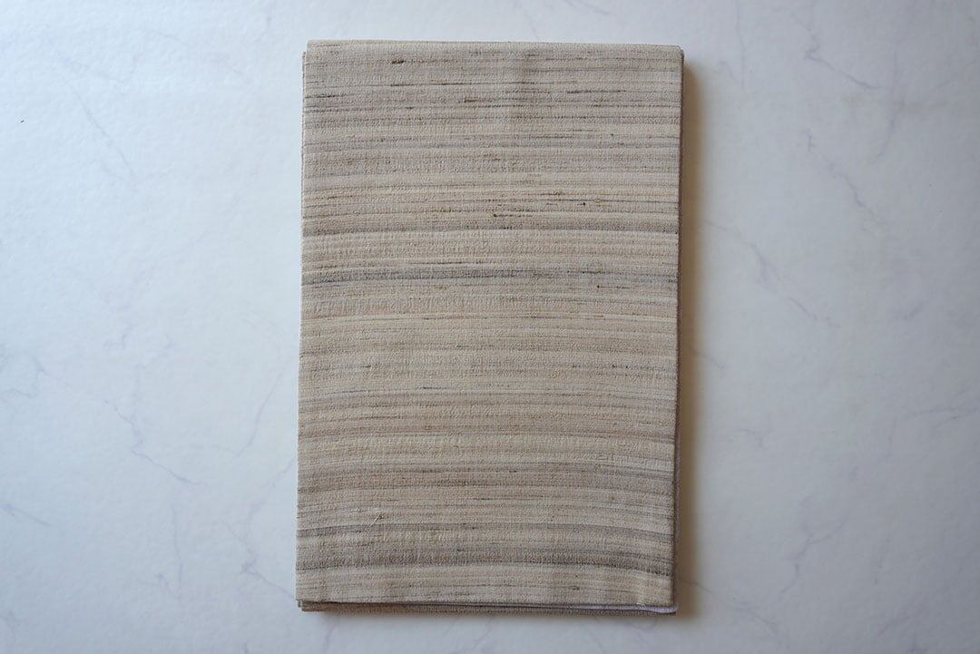 ベージュ系紬地、橫縞の開きなごや帯です。