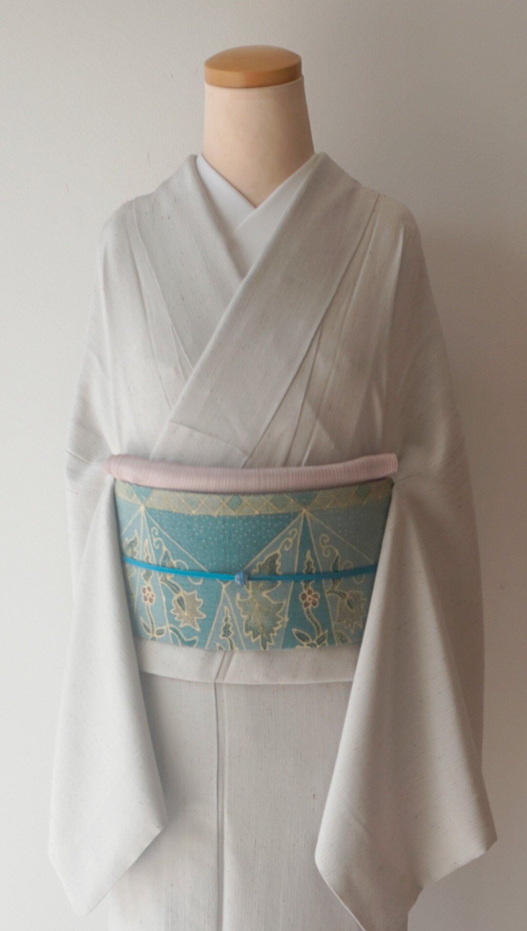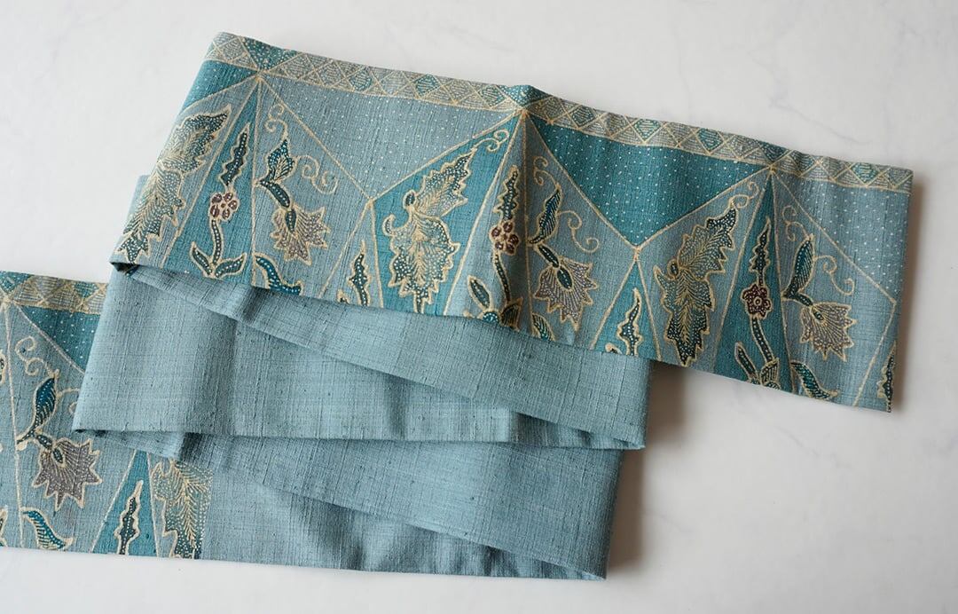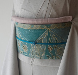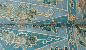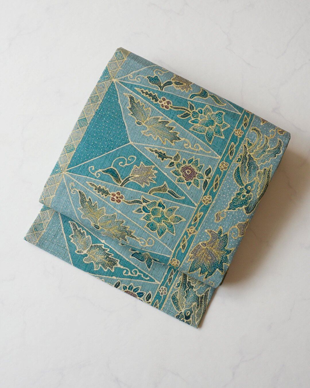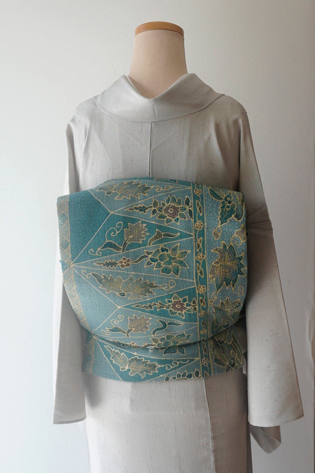 【なごや帯】浅縹地 抽象植物文 紬地なごや帯