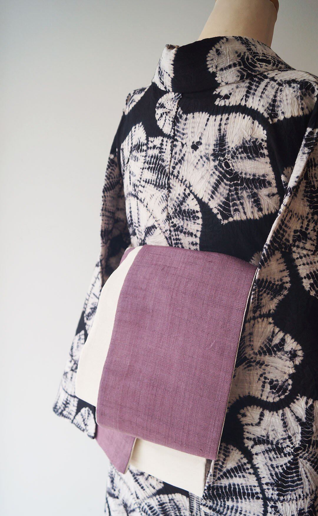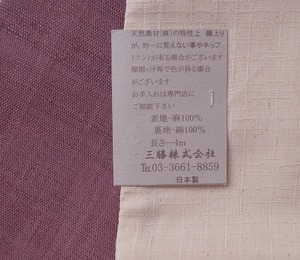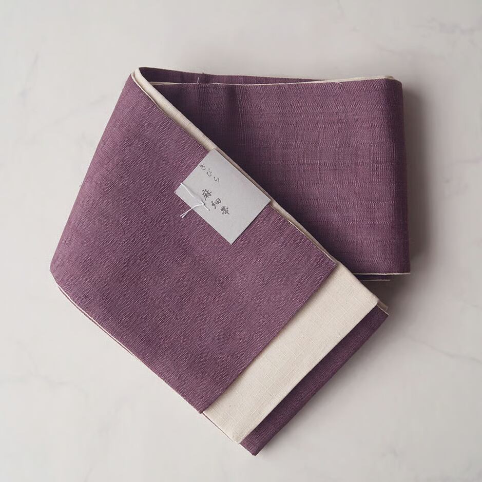 【三勝・半幅帯】薄蒲葡色 × 生成り色 麻きびら 半幅帯