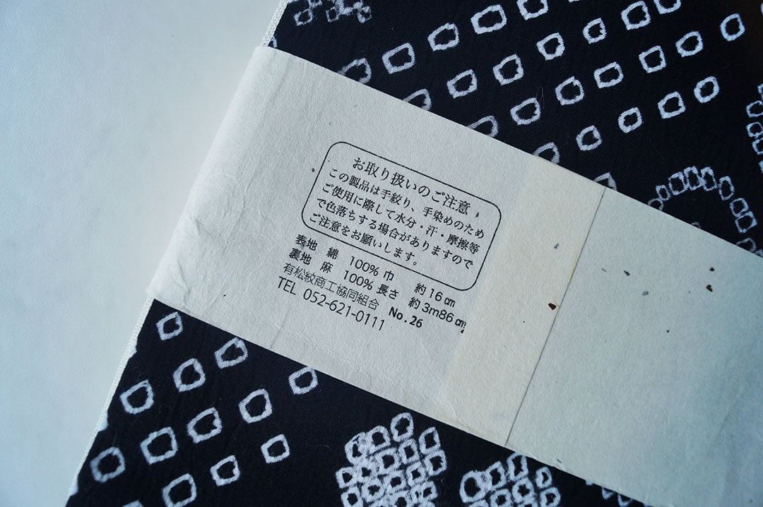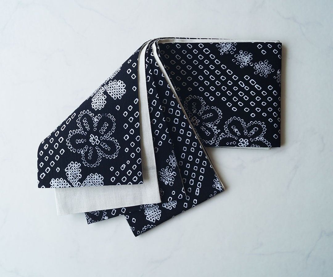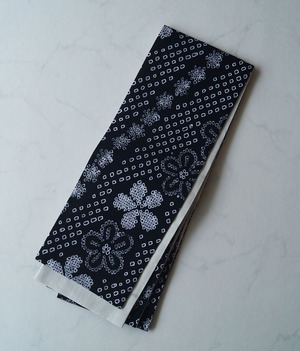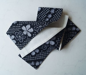 【半幅帯】黒色×白色 花文に斜め四角文 手絞り半幅帯 2501⑥
