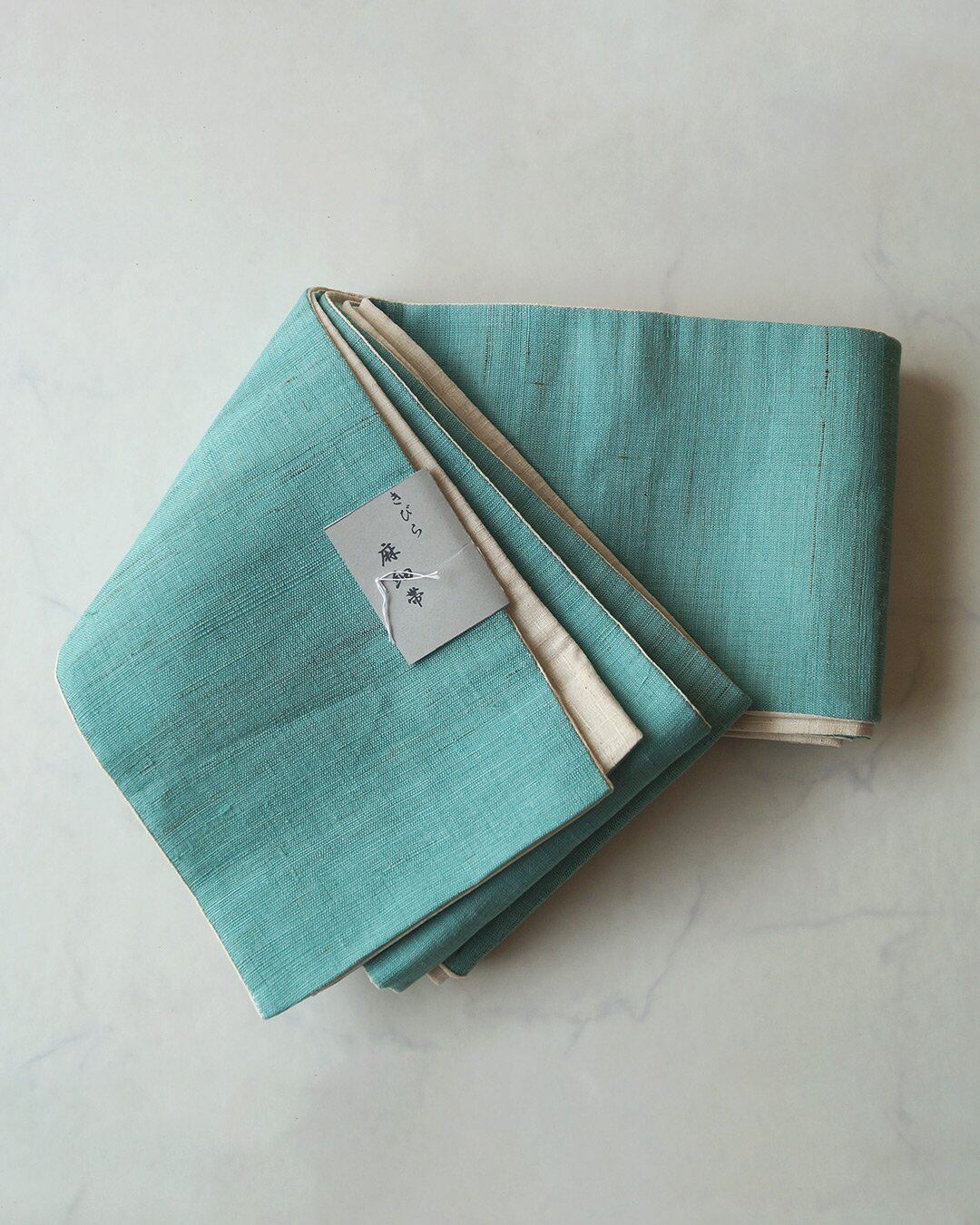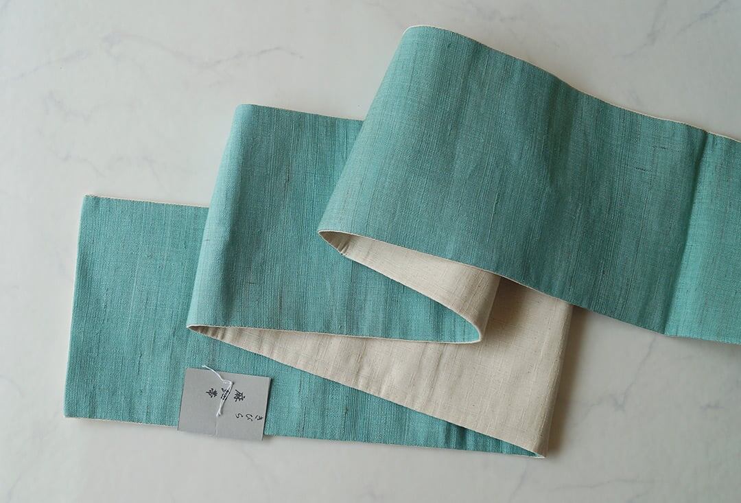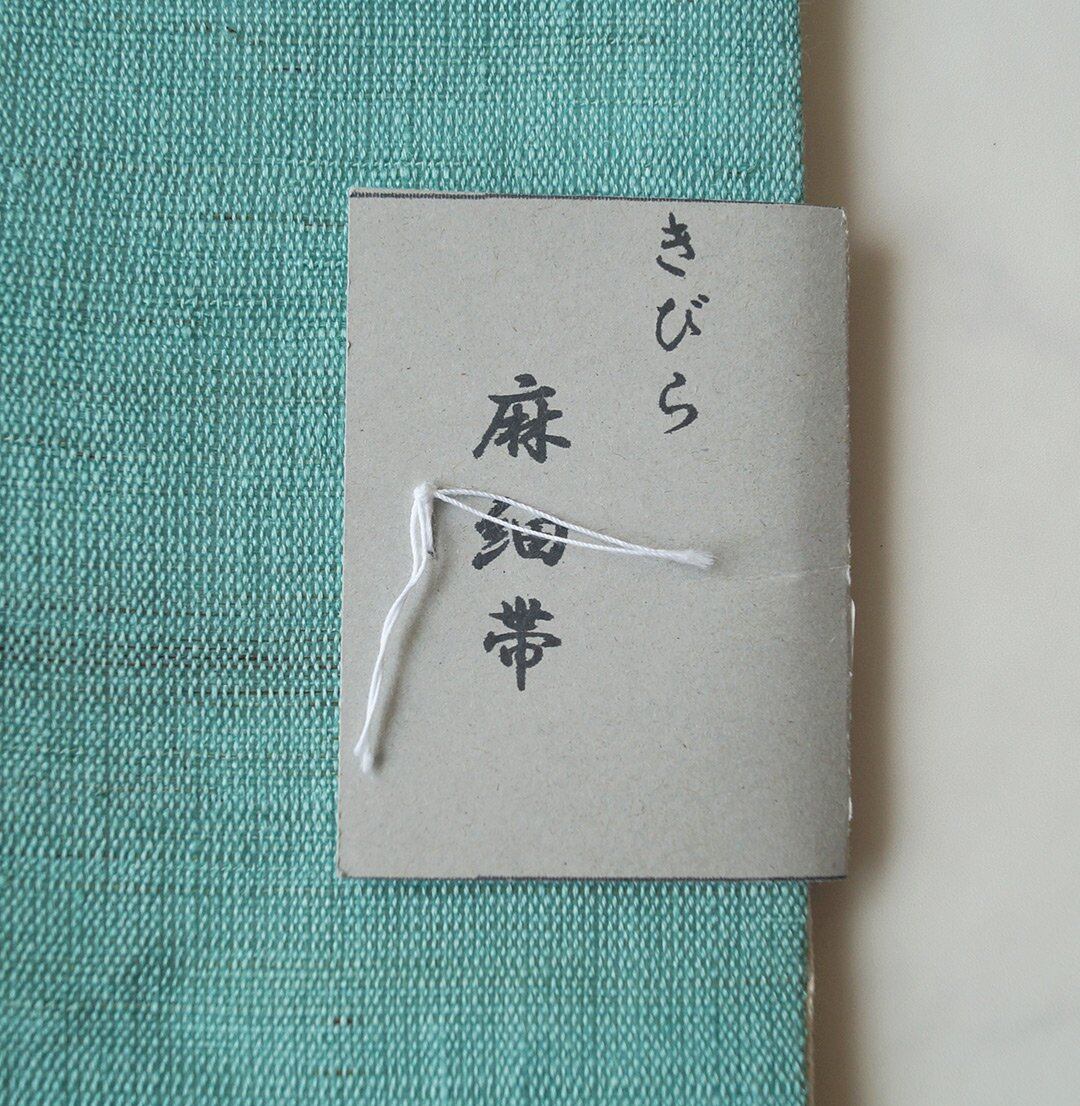 【三勝・半幅帯】ナイルブルー × 生成り色 麻きびら 半幅帯 250722⑤