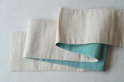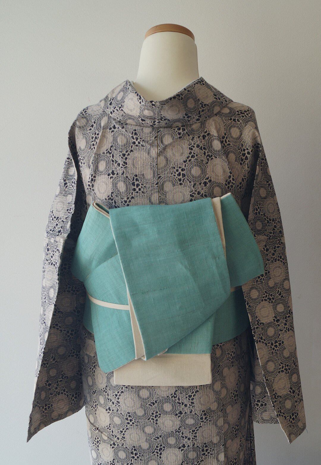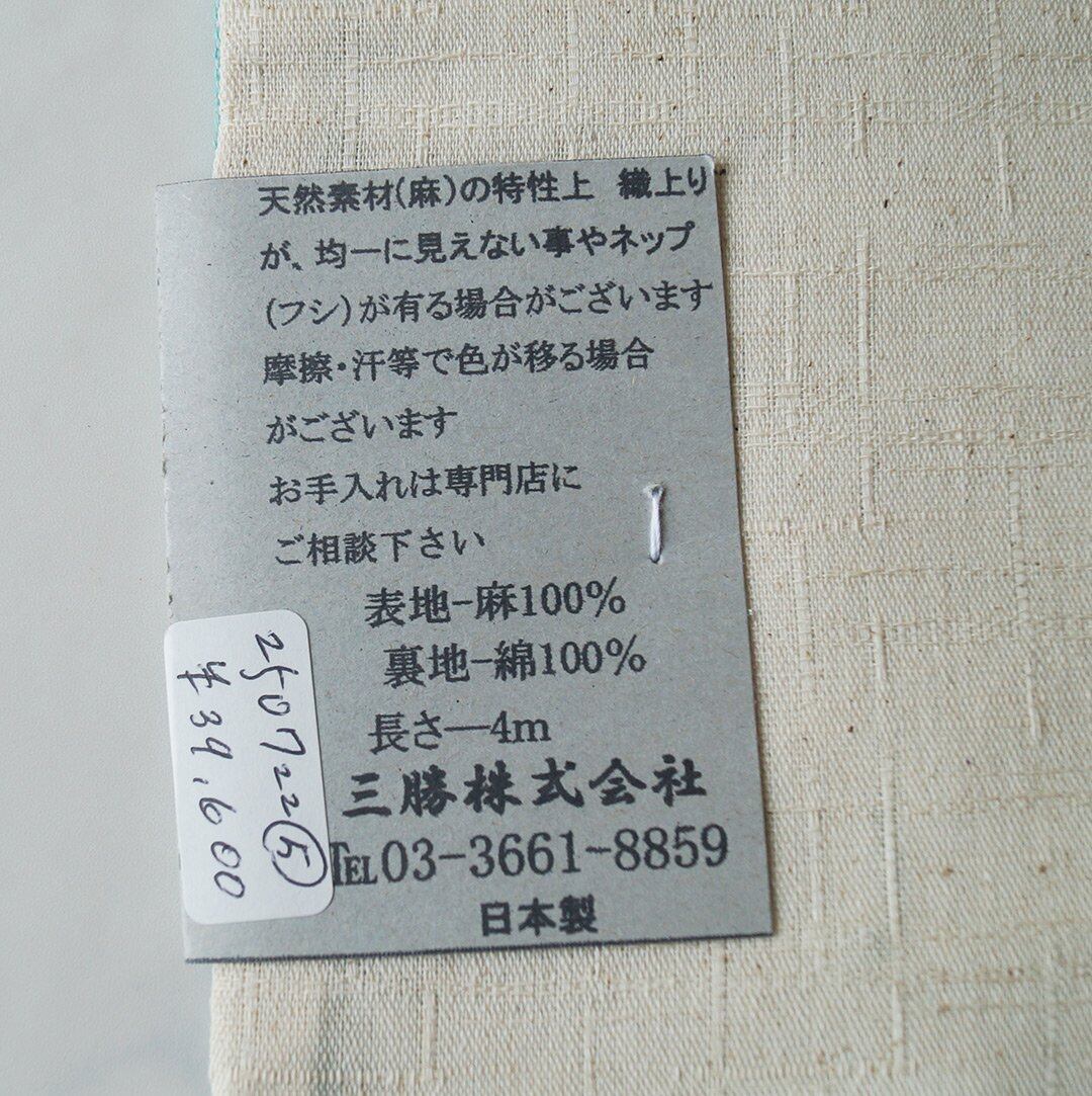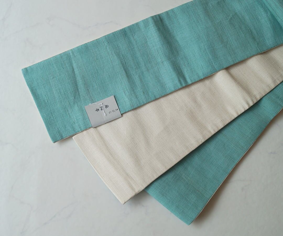 【三勝・半幅帯】ナイルブルー × 生成り色 麻きびら 半幅帯 250722⑤