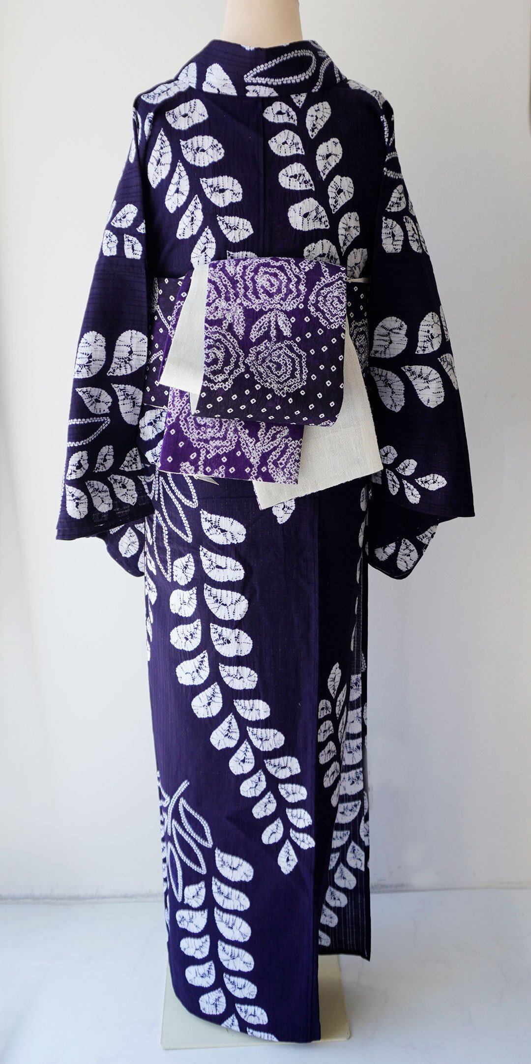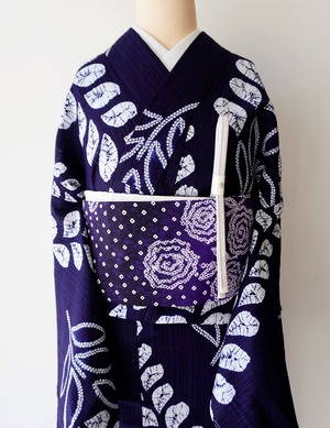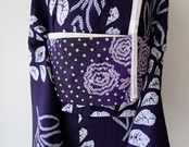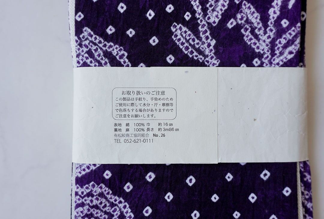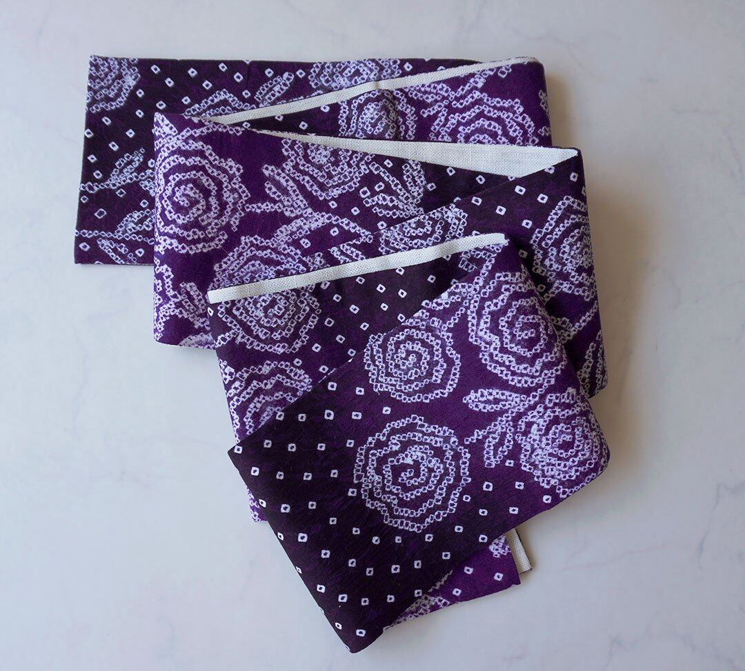 【半幅帯】紫黒色×紫紺色×白色 花文 手絞り半幅帯 2501⑦