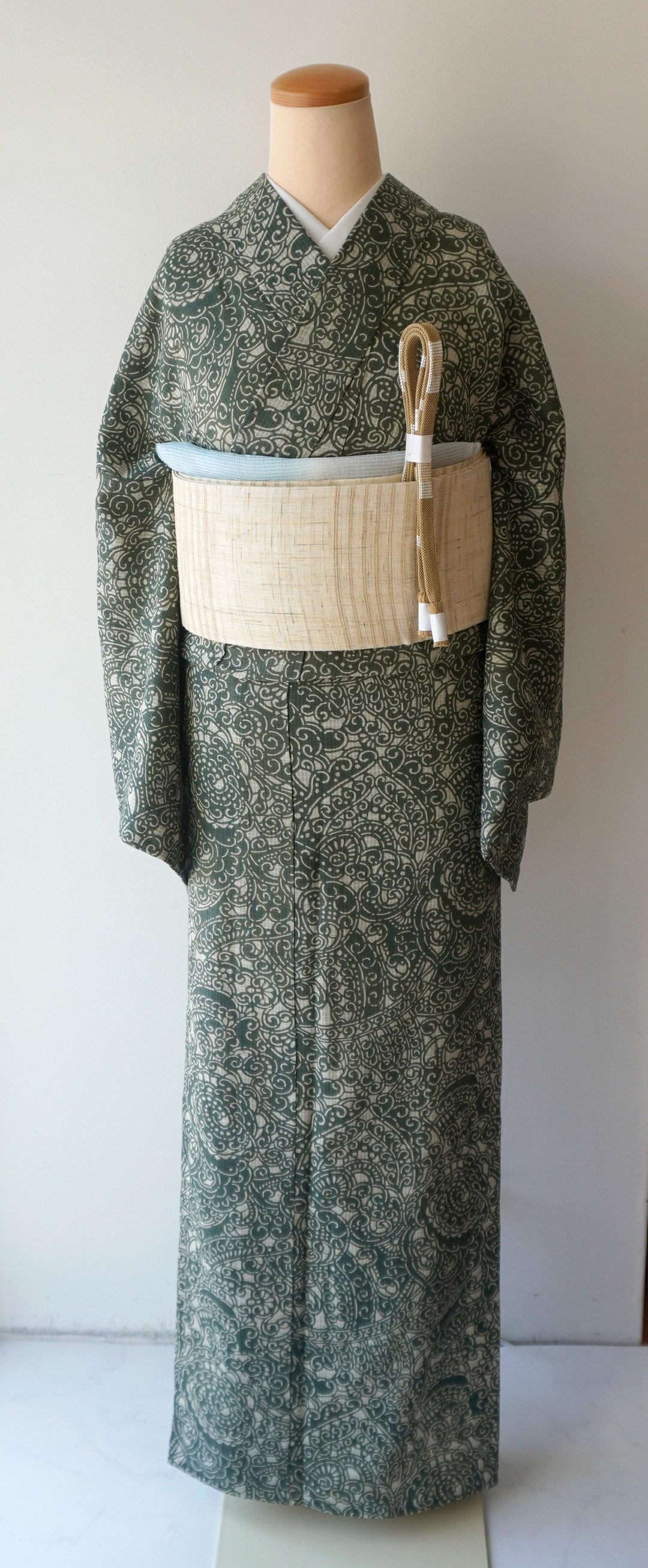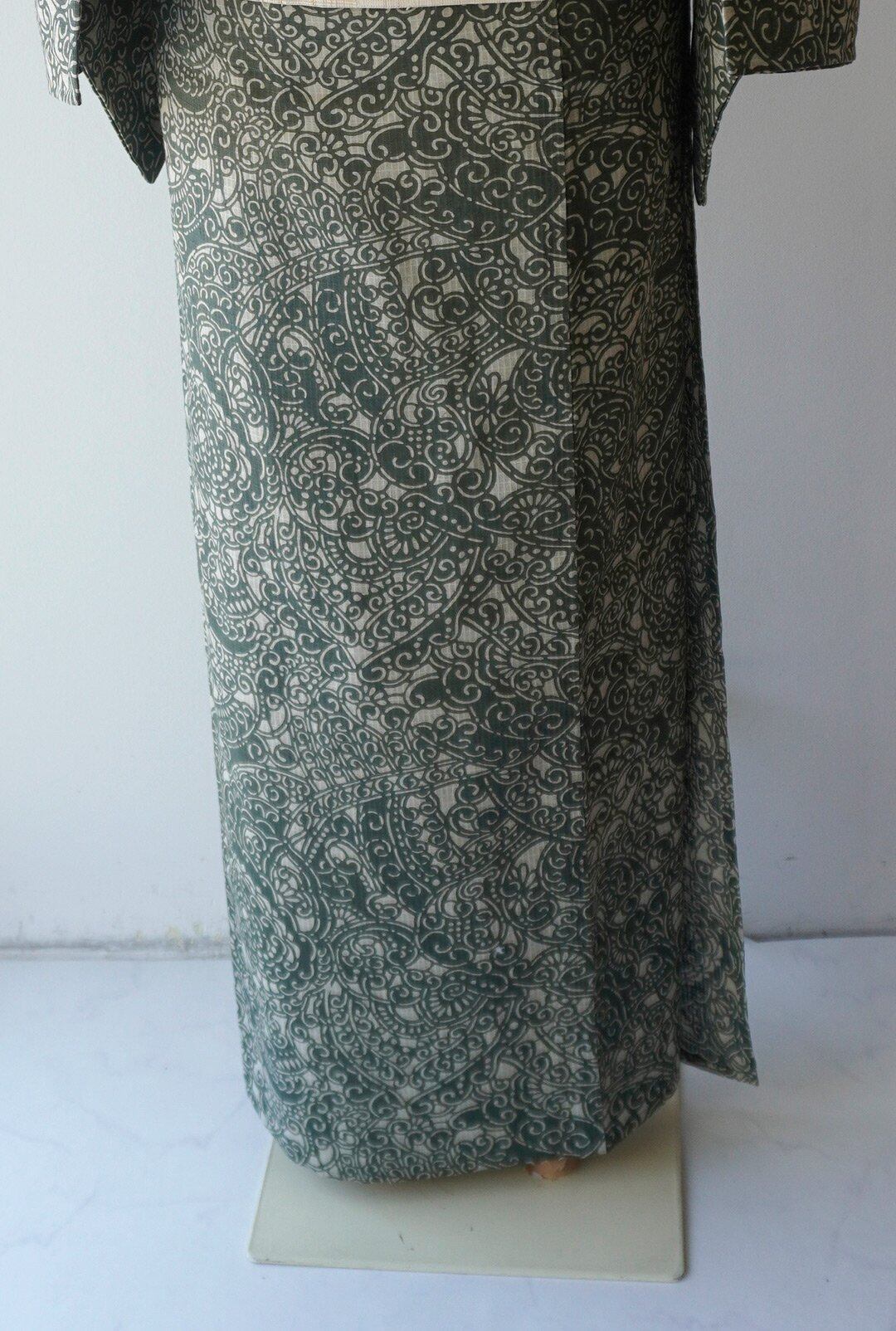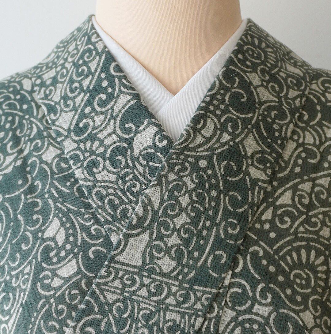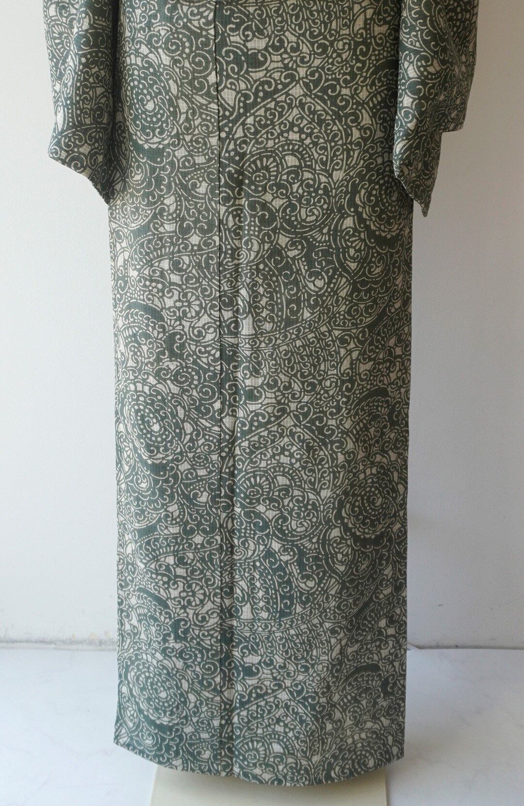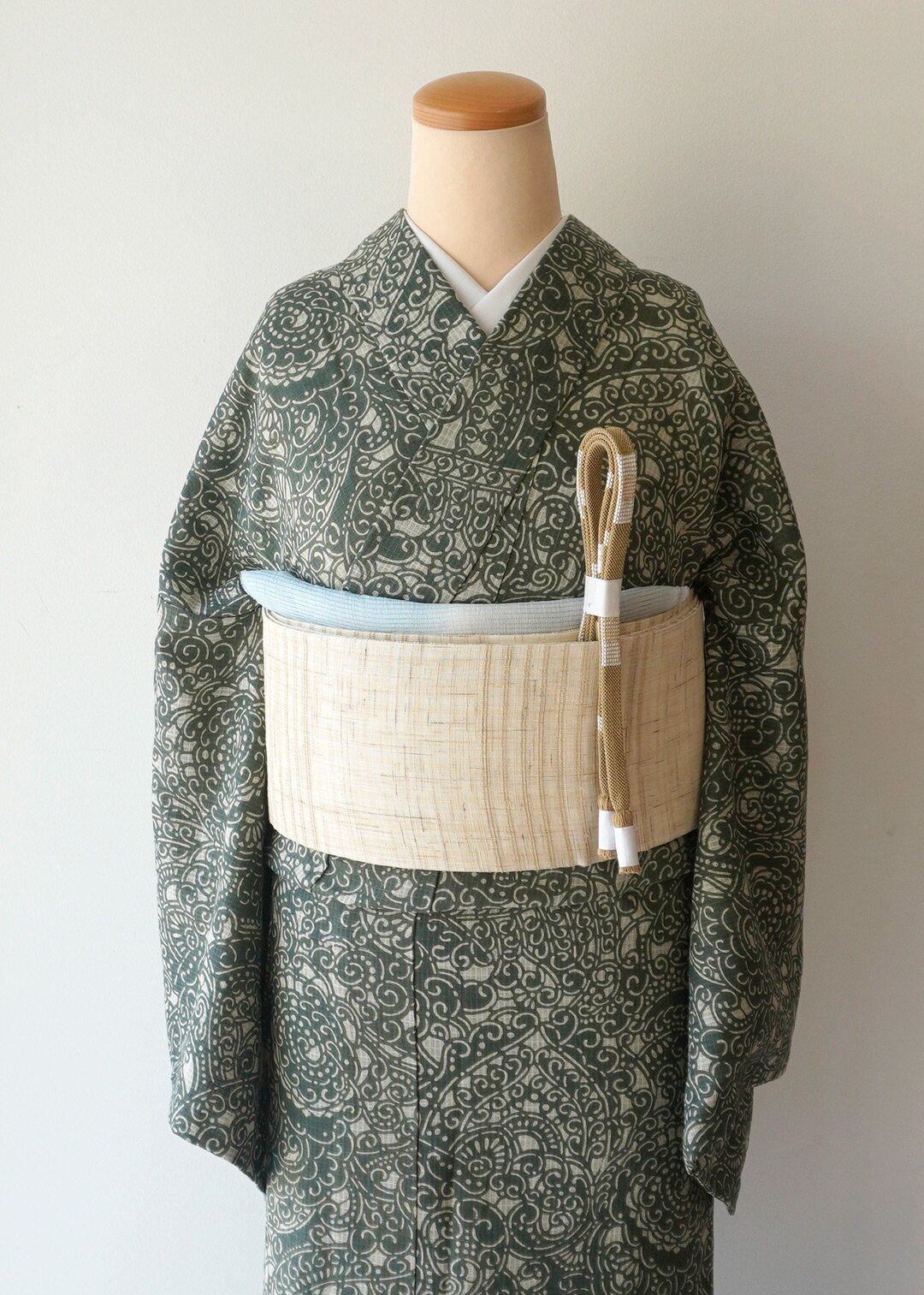 【浴衣】小千谷織物 綿麻紅梅 越後型染浴衣 アラベスク文