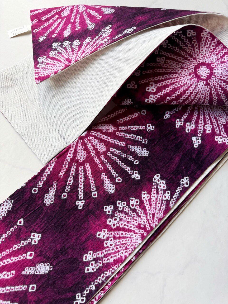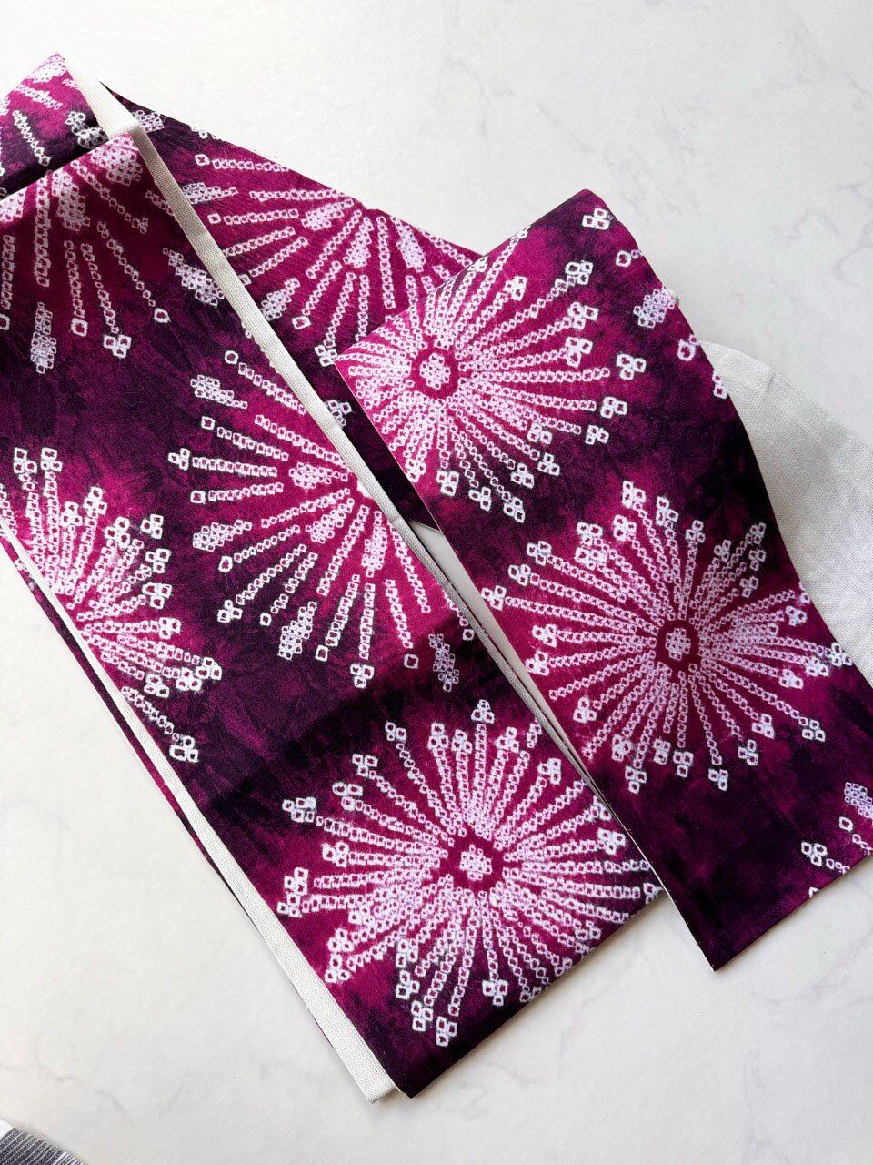 【半幅帯】中紅×葡萄色 花文 手絞り半幅帯 No.240821⑩