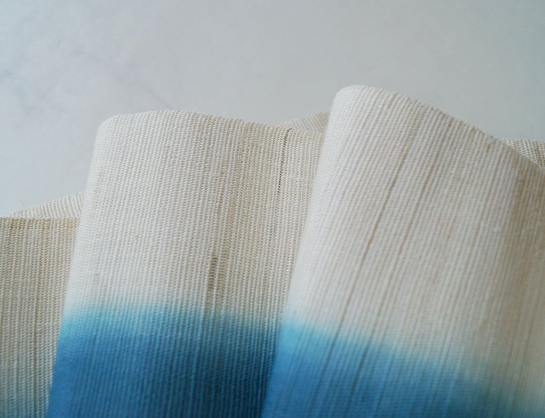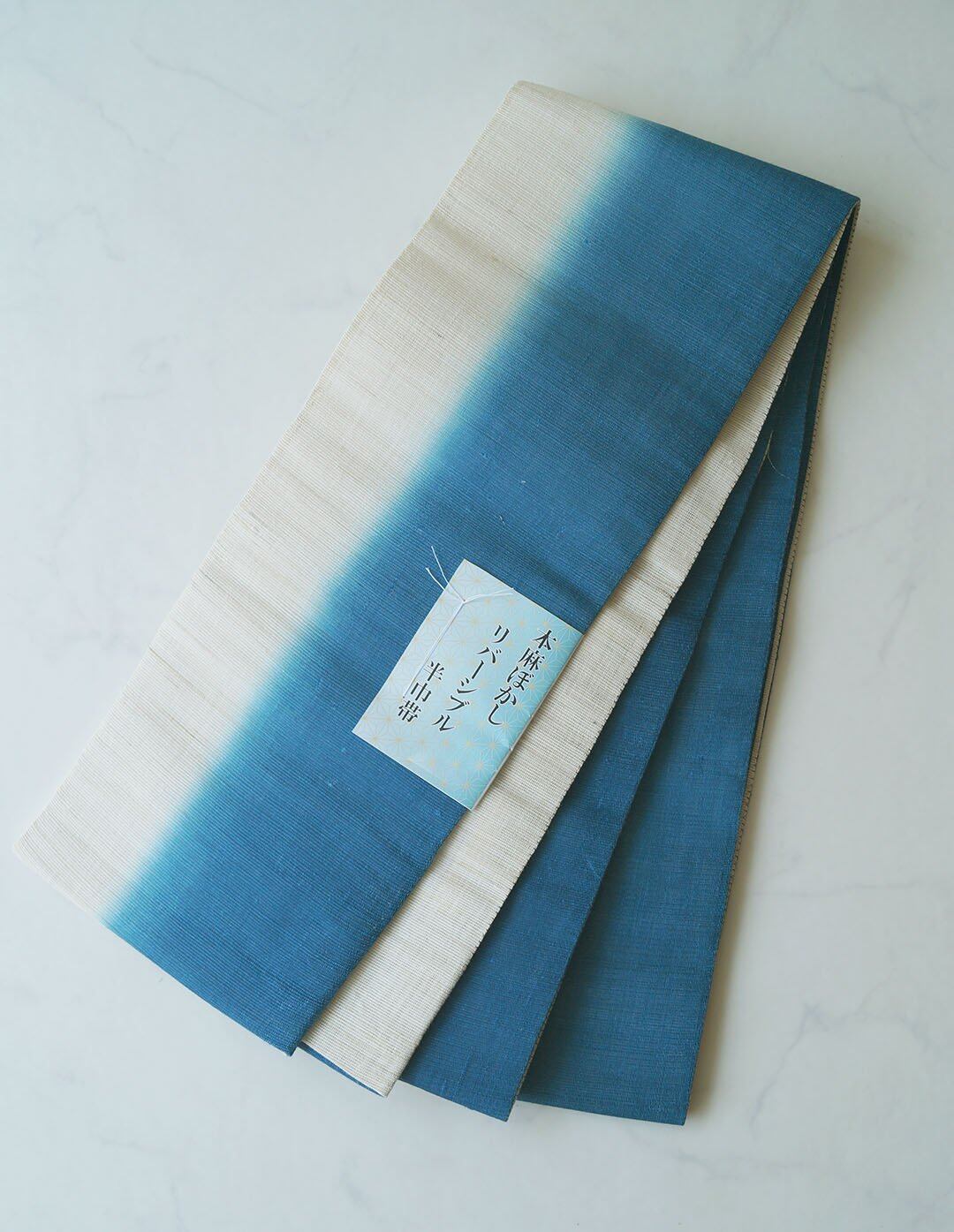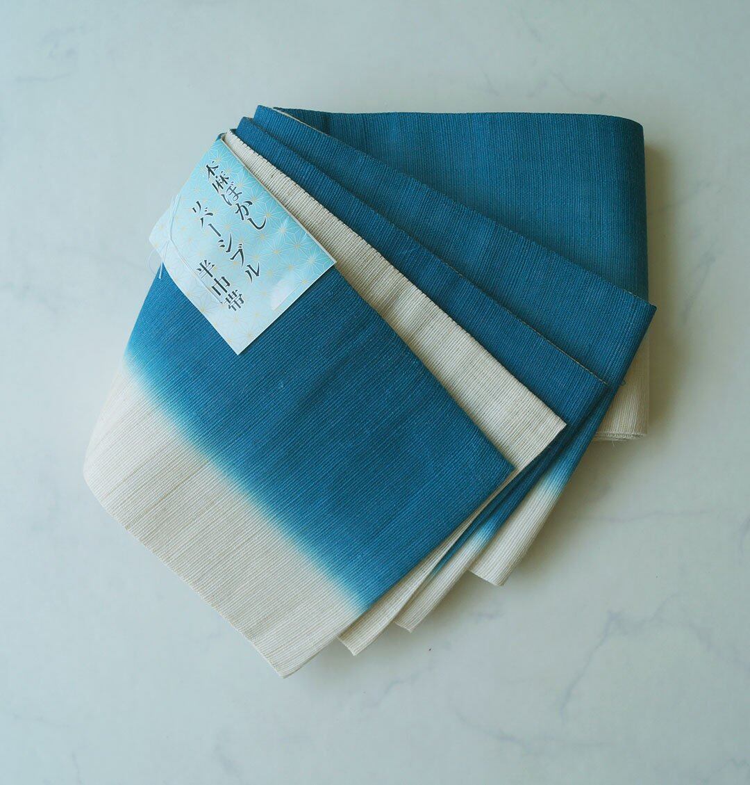 【衿秀・半幅帯】本麻ぼかし リバーシブル 半巾帯 緑花浅葱色×生成り色 No.250314④