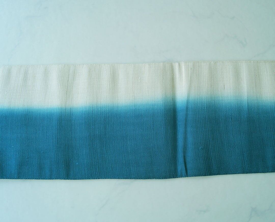 緑花浅葱色のぼかしの本麻半幅帯です。