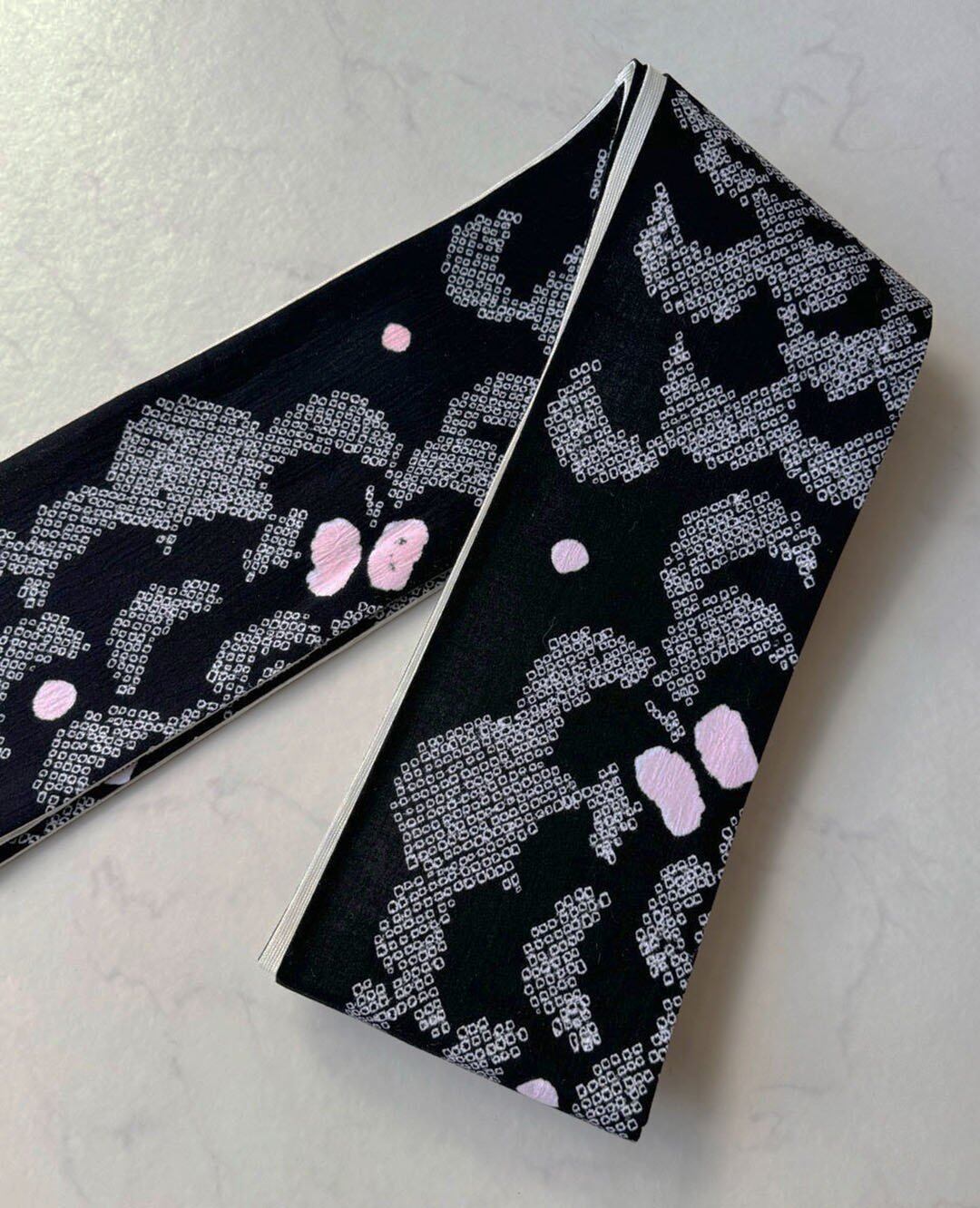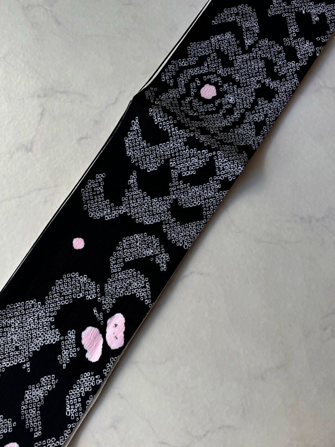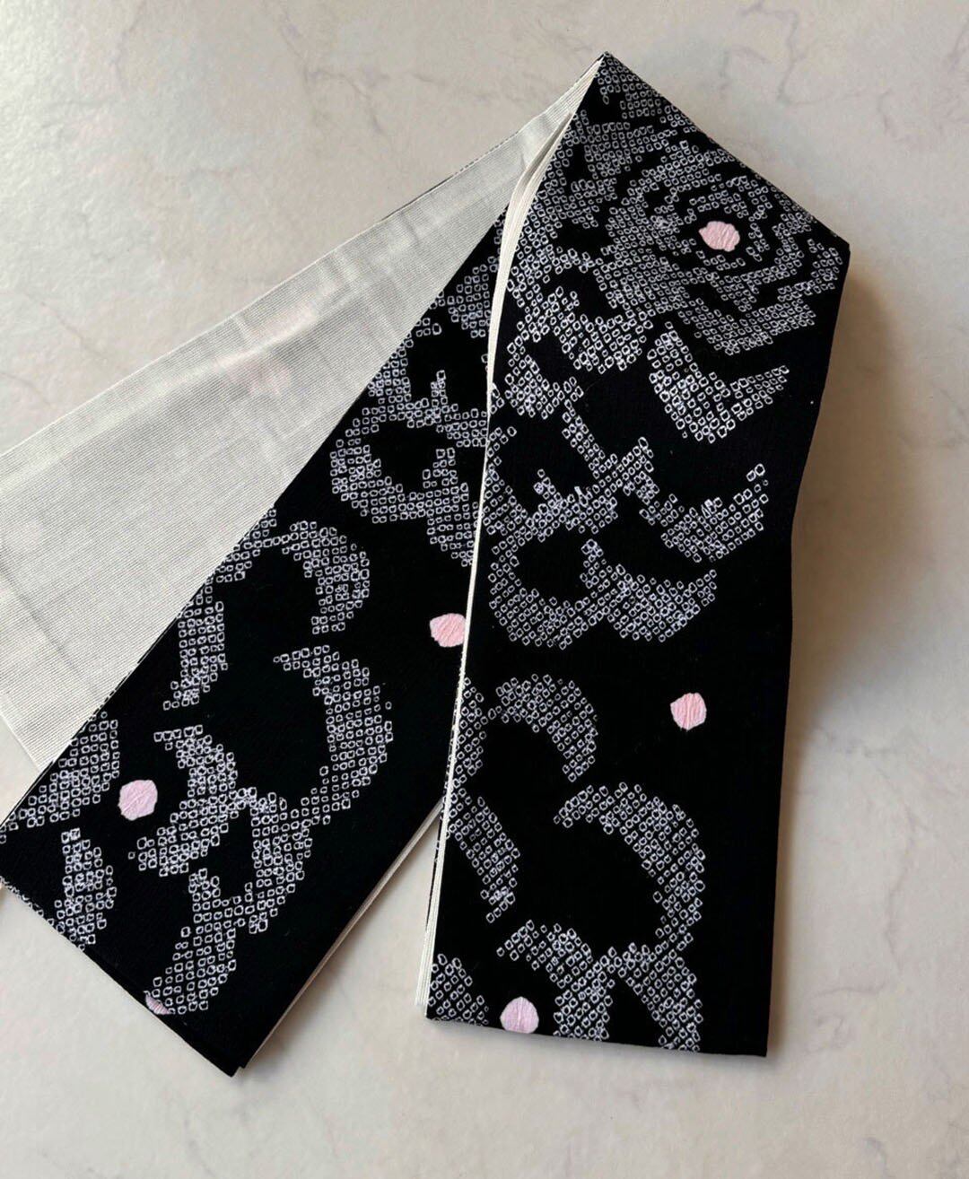 【半幅帯】黒色×白色 抽象文 手絞り半幅帯 240821⑯