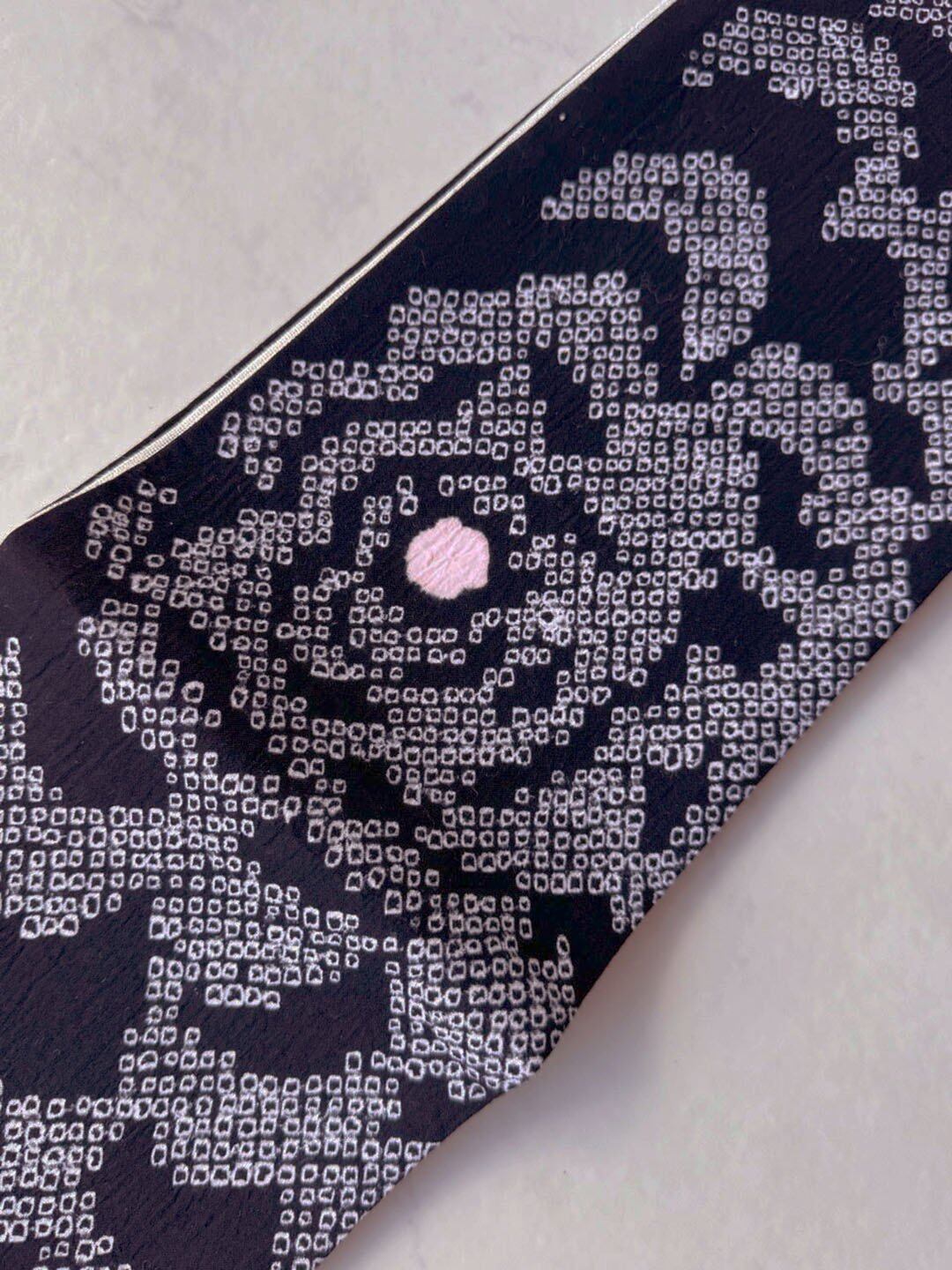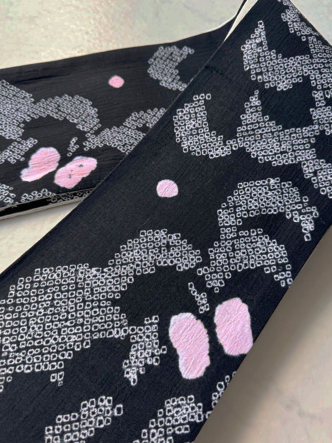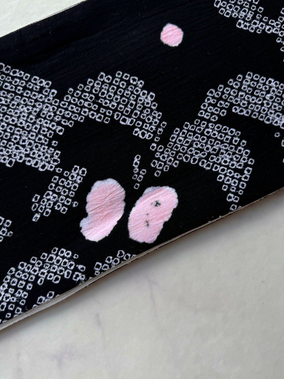【半幅帯】黒色×白色 抽象文 手絞り半幅帯 240821⑯