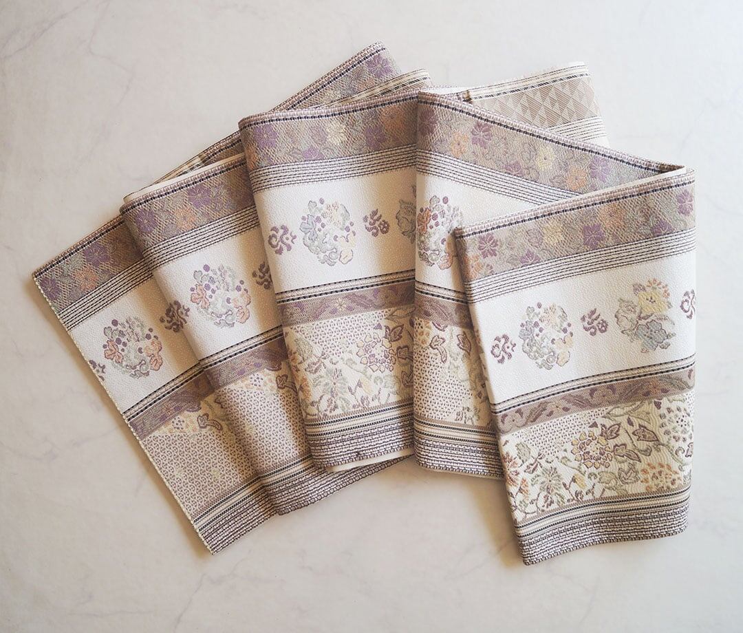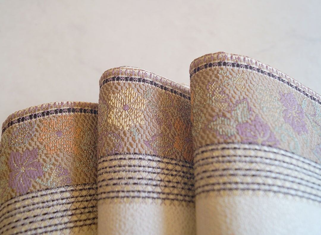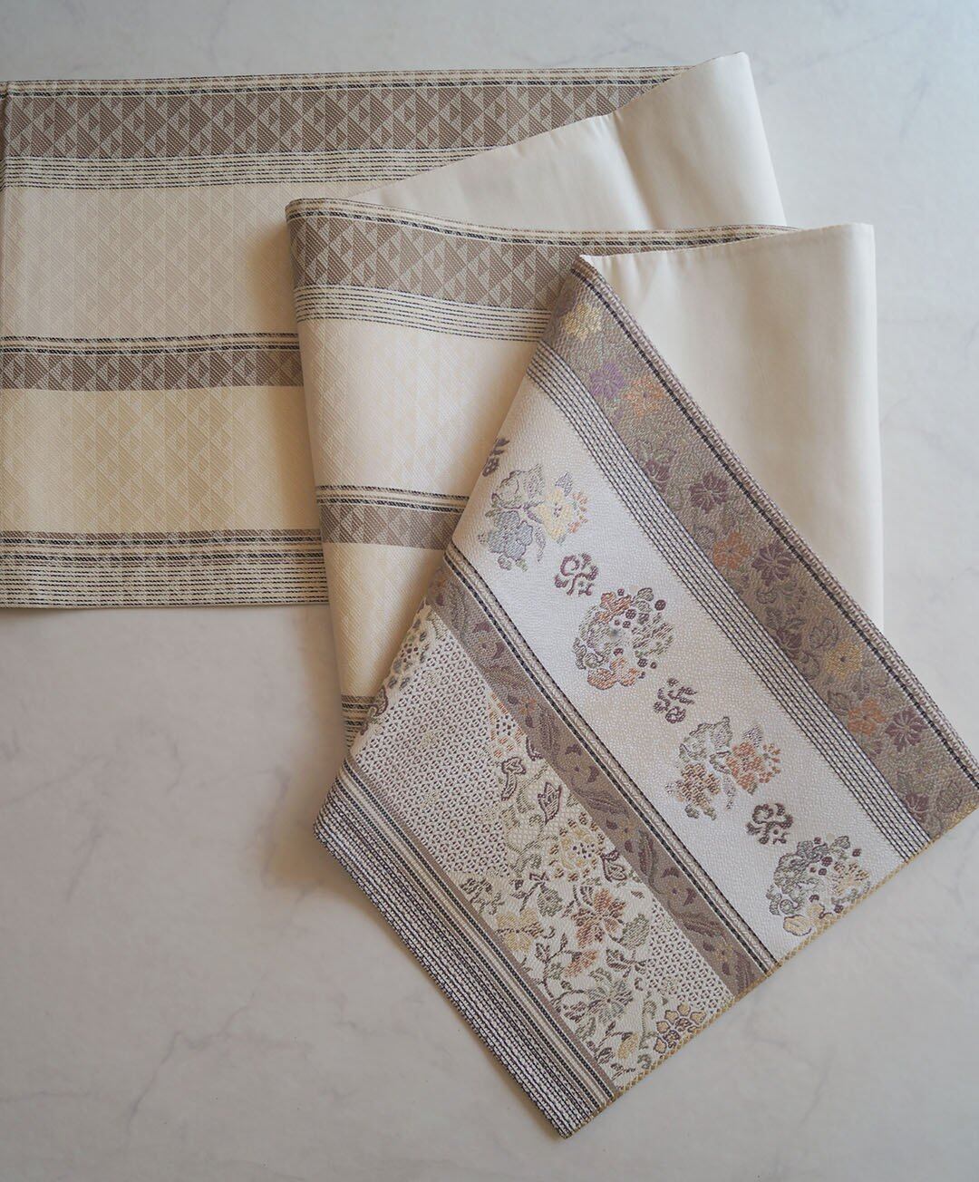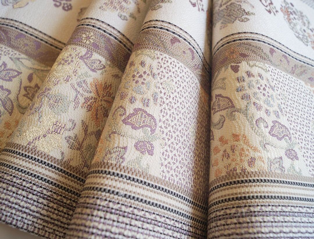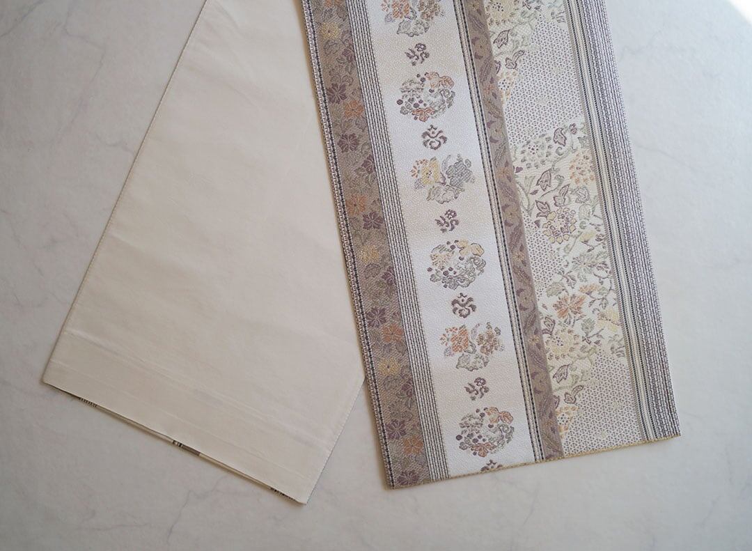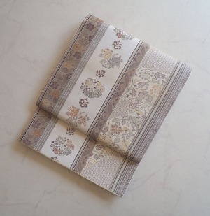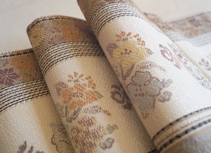 【ふくろ帯】生成り色地 縞に抽象草花文 ふくろ帯