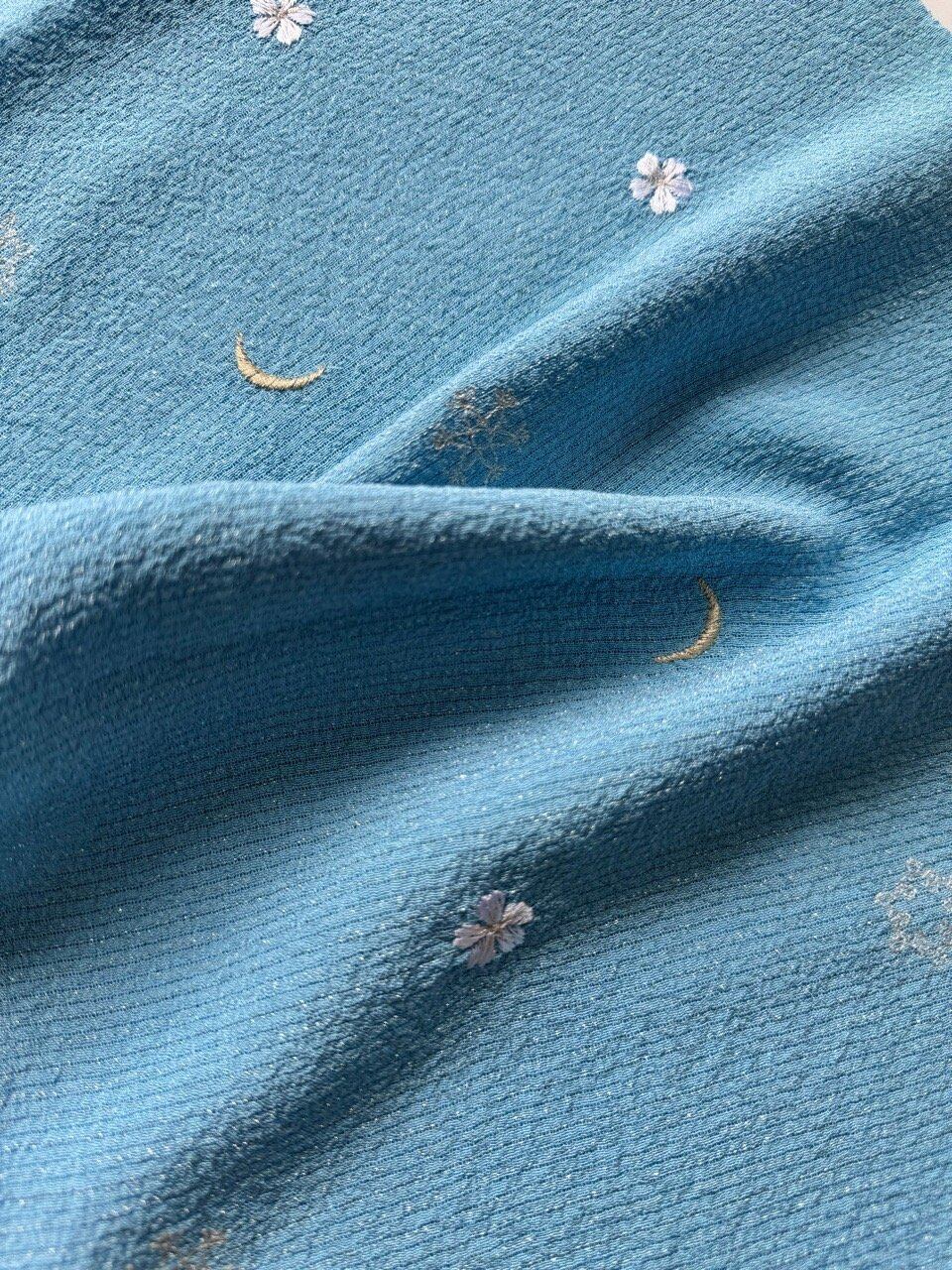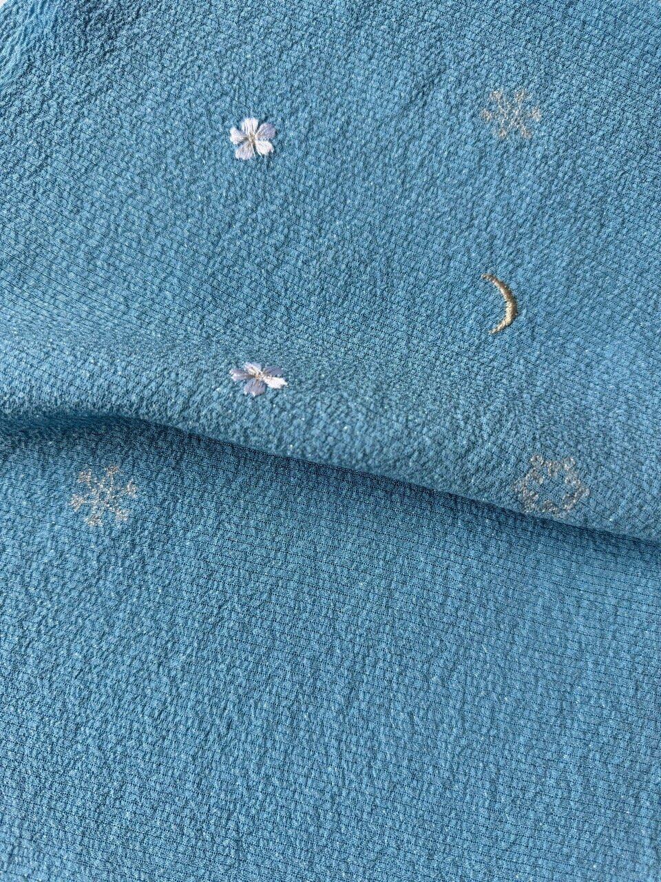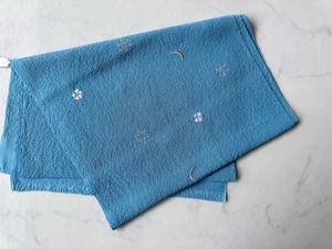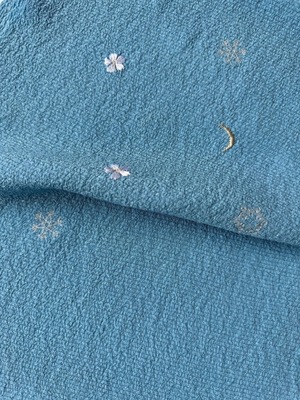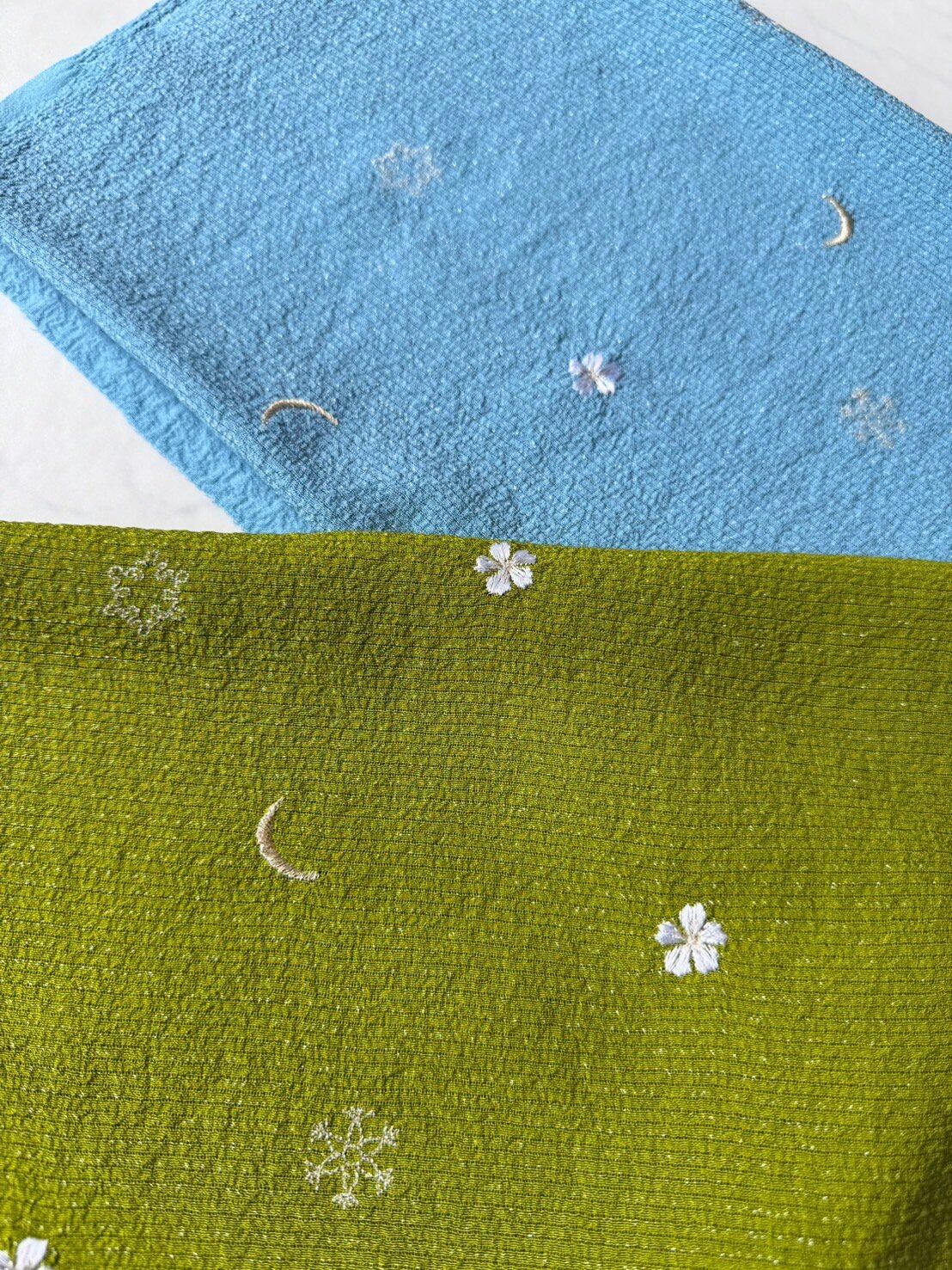 【帯揚げ】月・雪の結晶・花の刺繍入り 新橋色 絽ちりめん帯揚げ 250403③