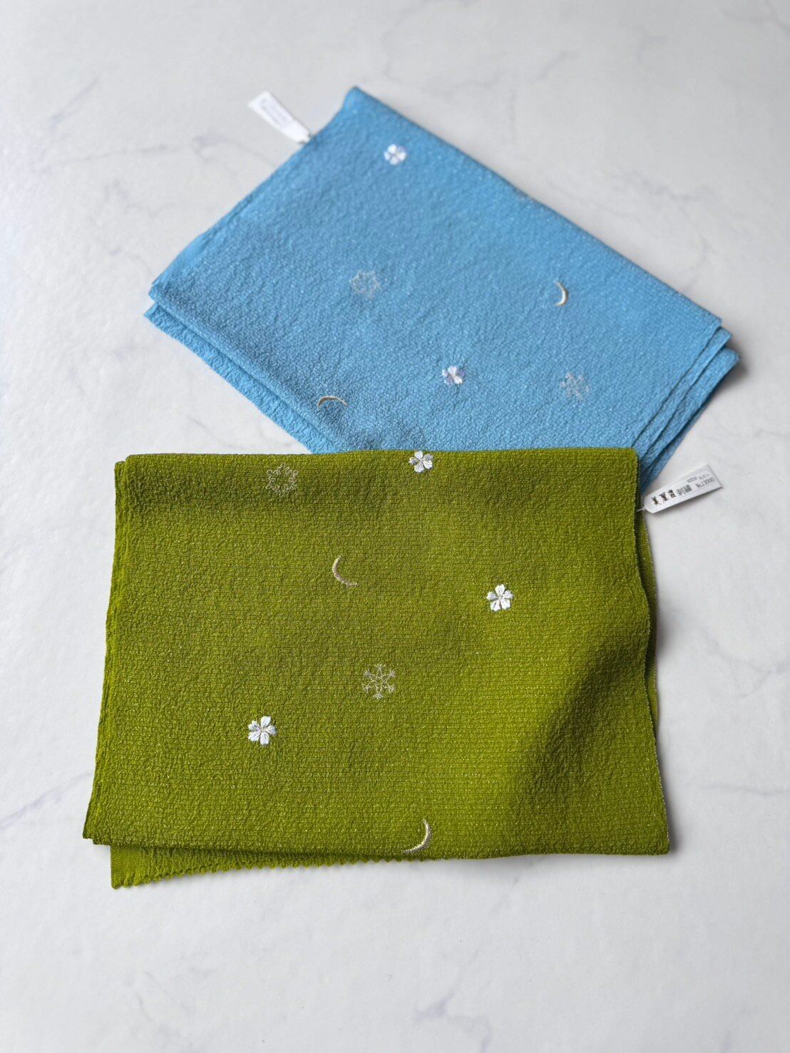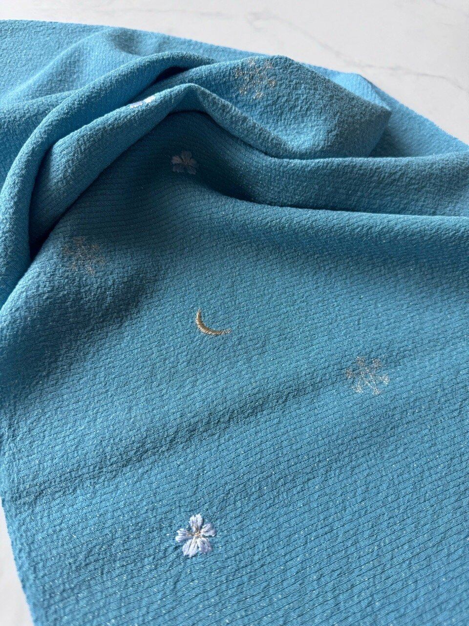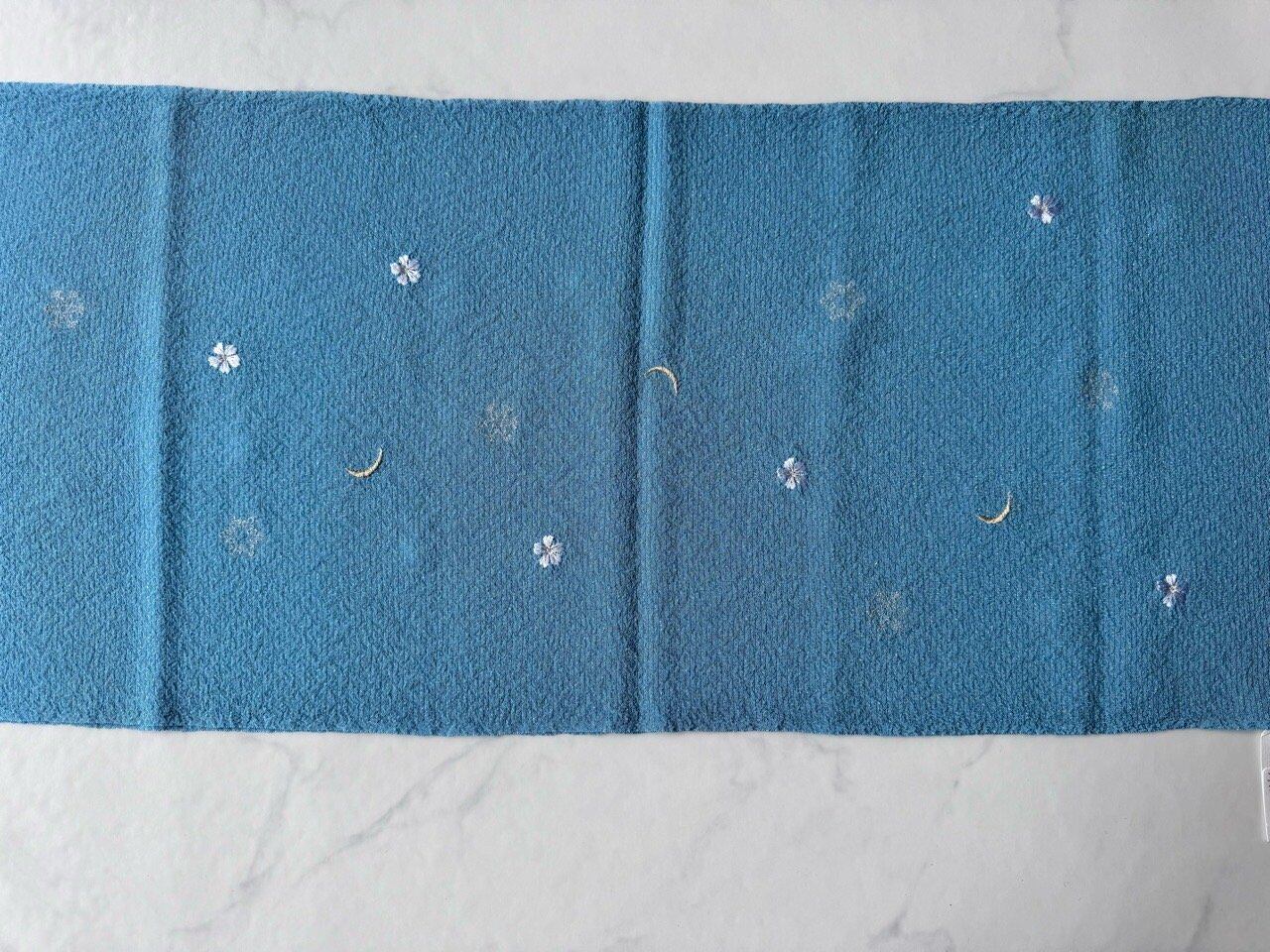 【帯揚げ】月・雪の結晶・花の刺繍入り 新橋色 絽ちりめん帯揚げ 250403③