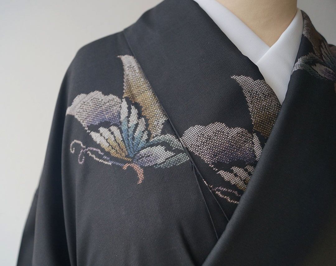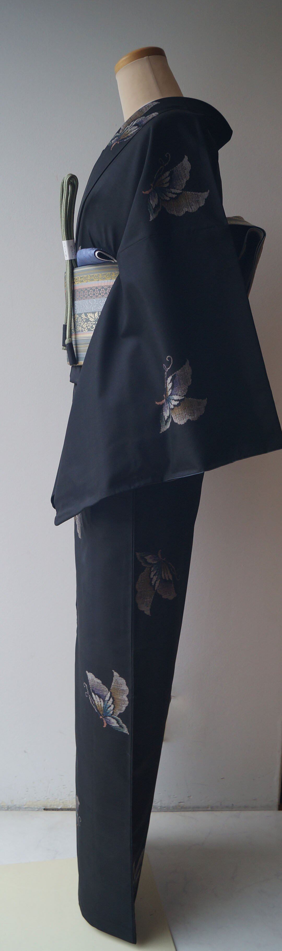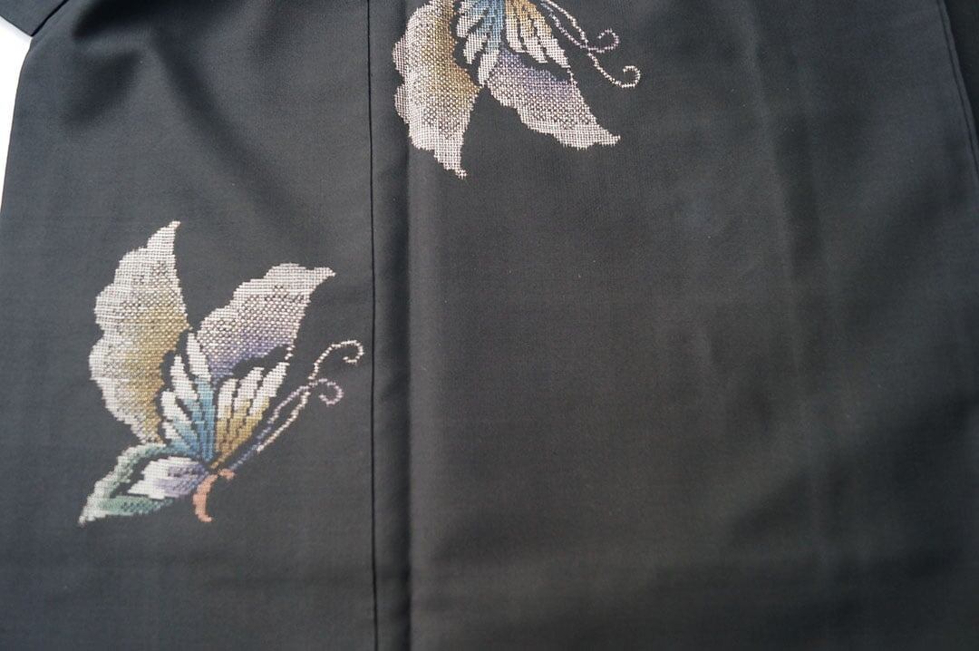 【袷】山内マリコ様ご着用 黒色地 蝶文 大島紬