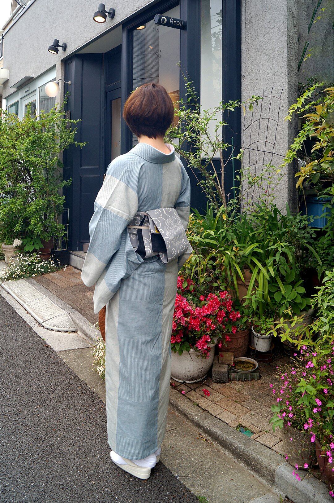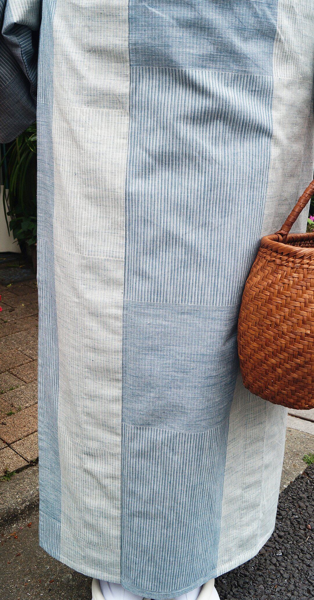 【単衣】紺仁工房 草木染綿紬 片貝木綿 ブルー系変わり縞 仕立上がり品