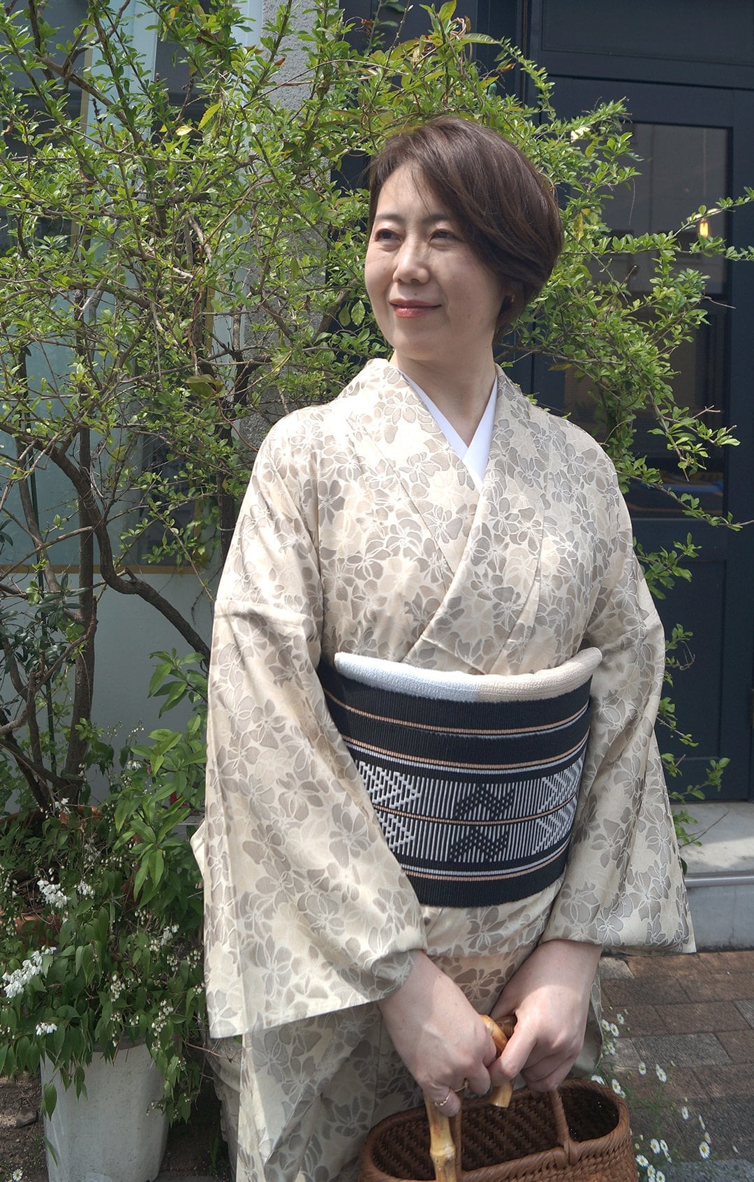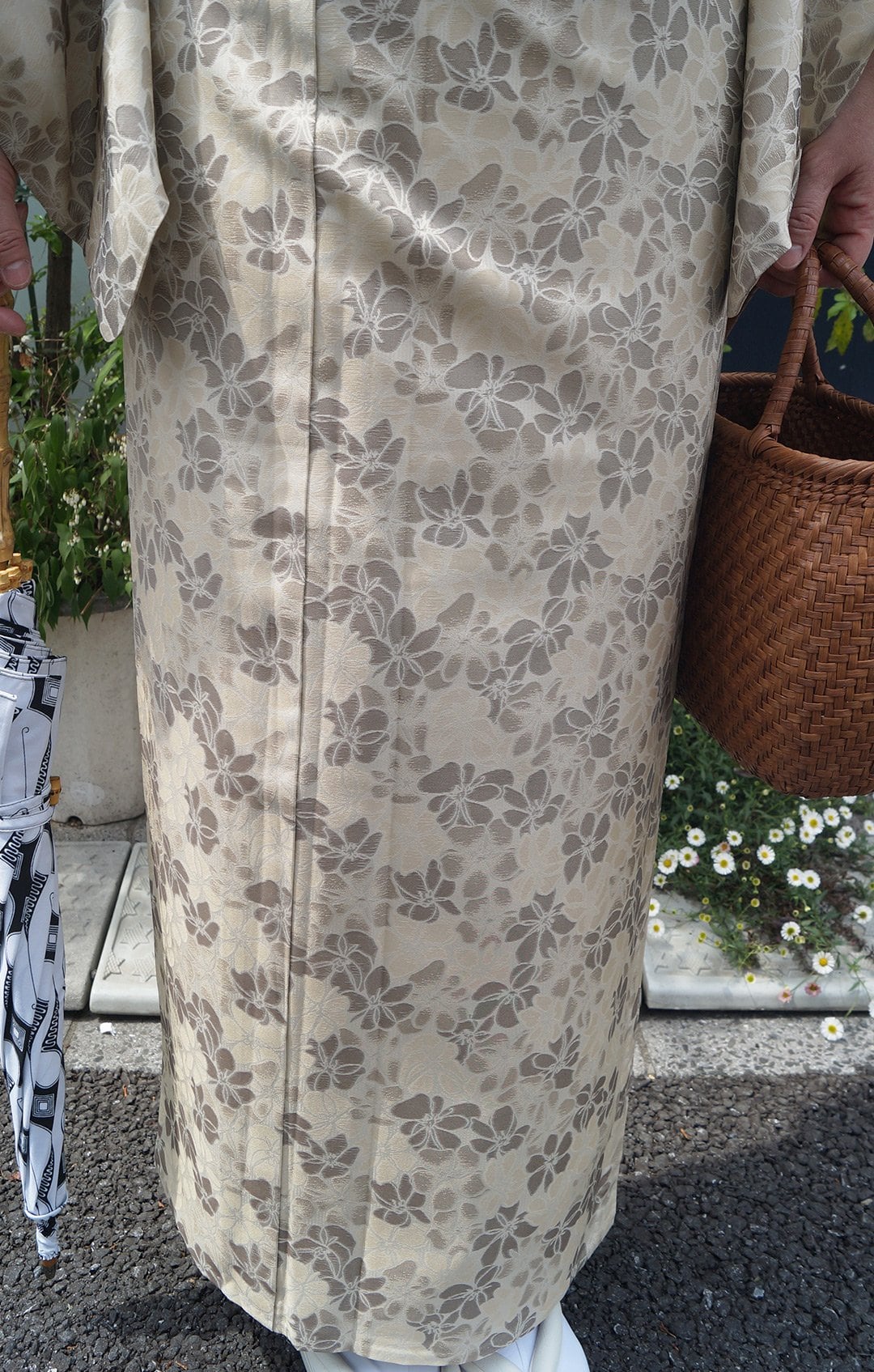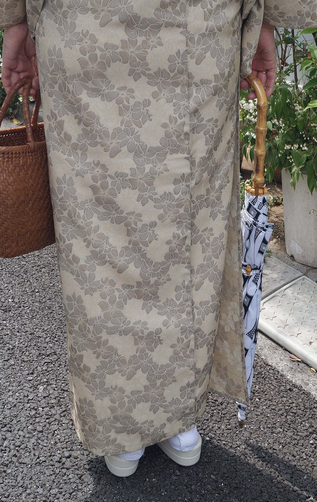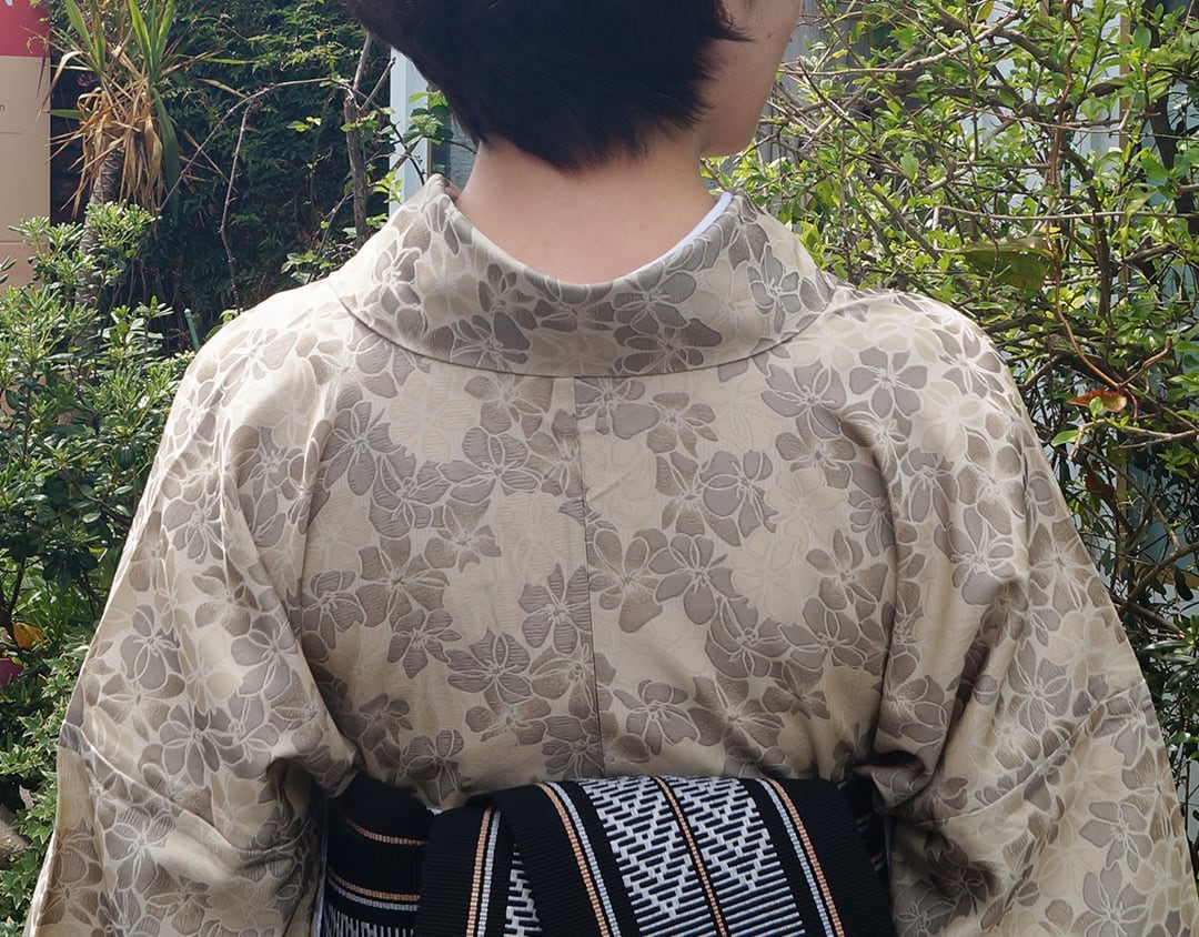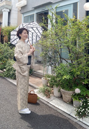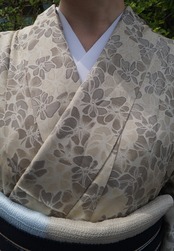 サンドベージュ系の花文単衣お召しです。