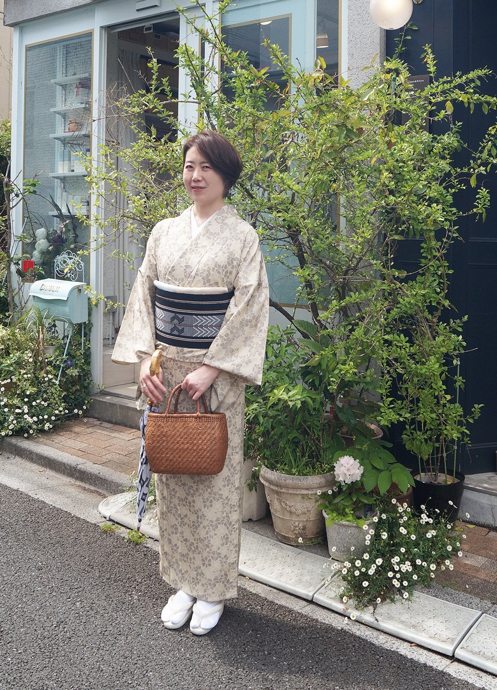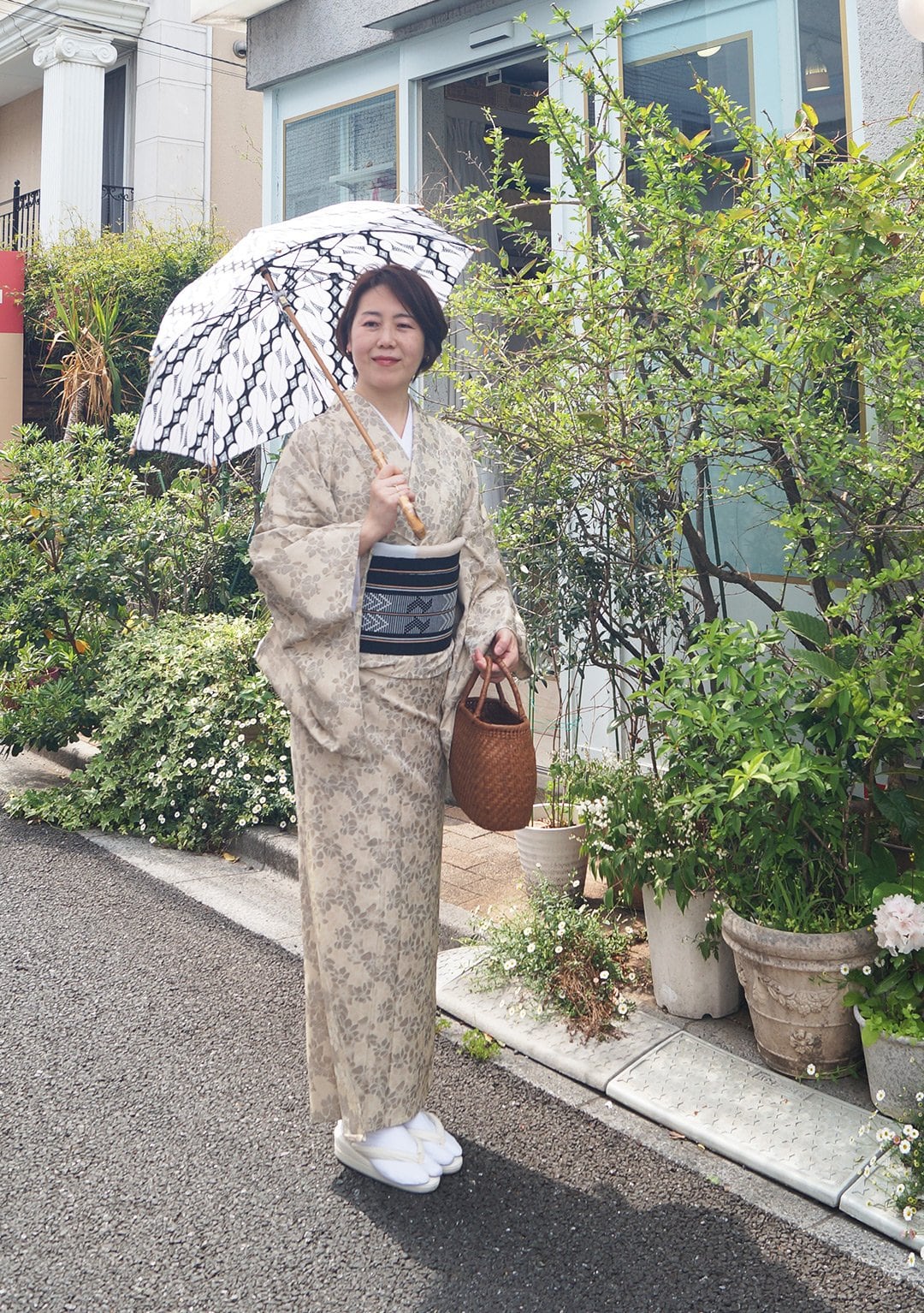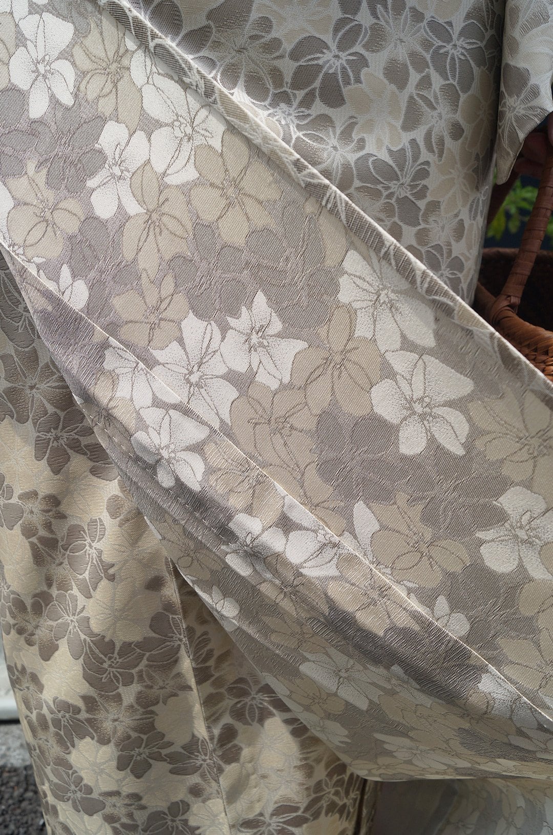 サンドベージュ系の花文単衣お召しです。