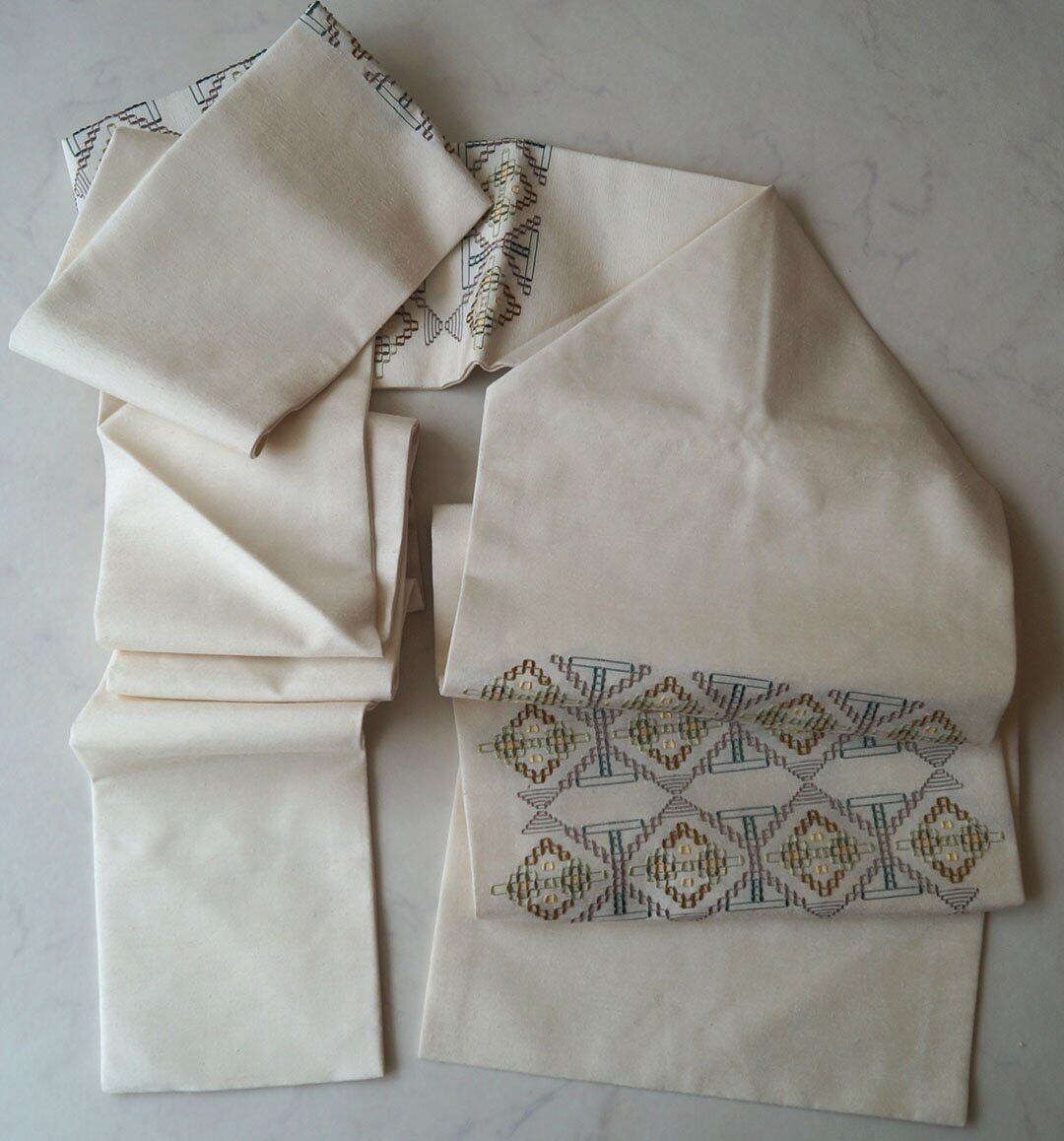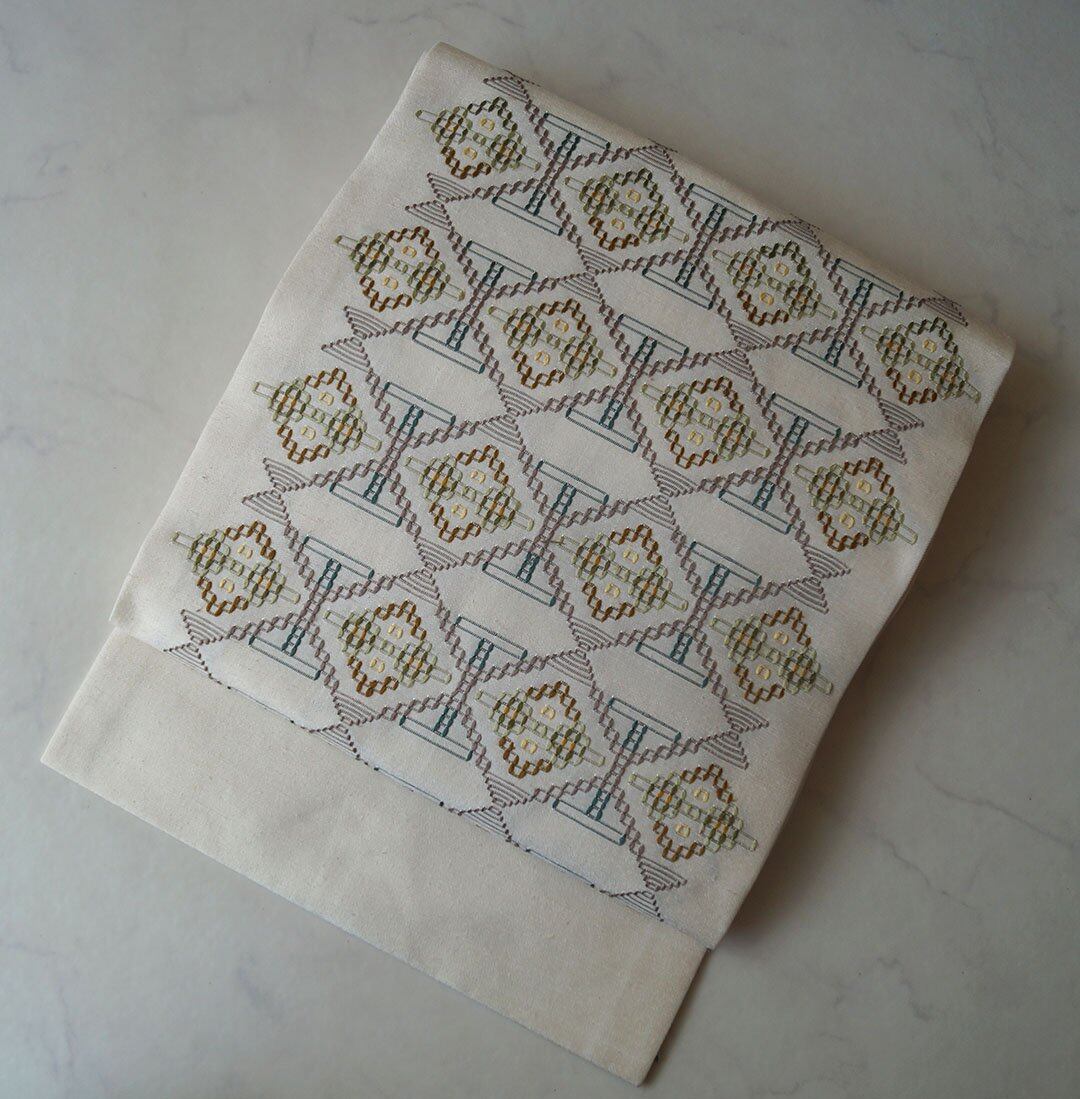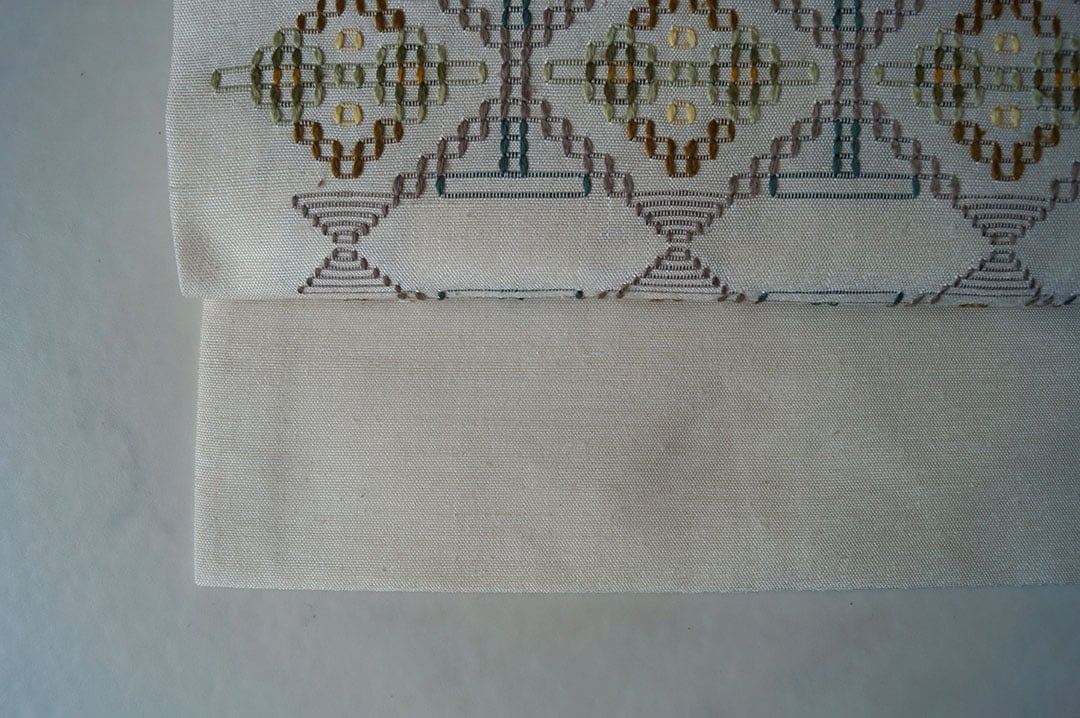 生成り系の地に、花織りの文様が