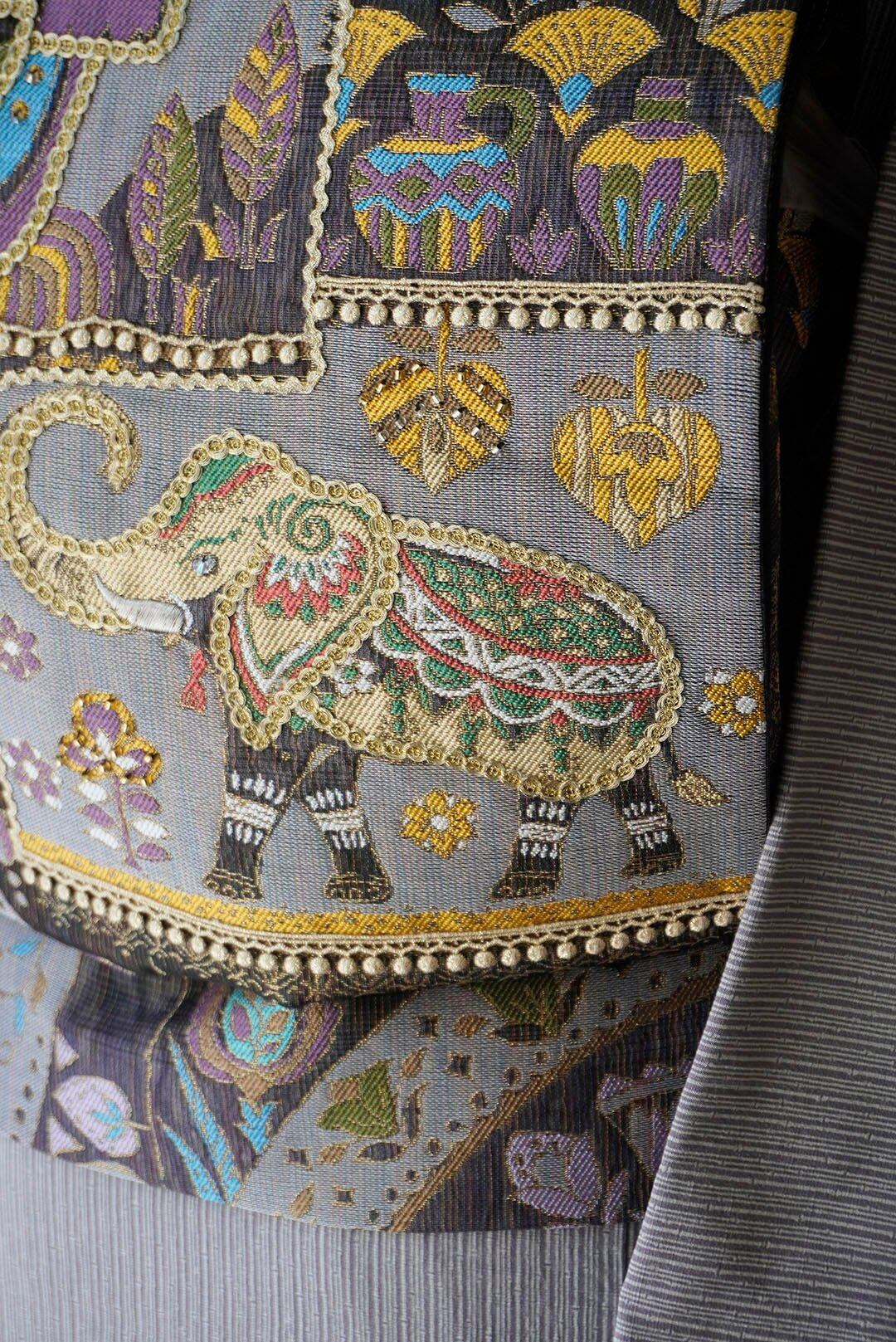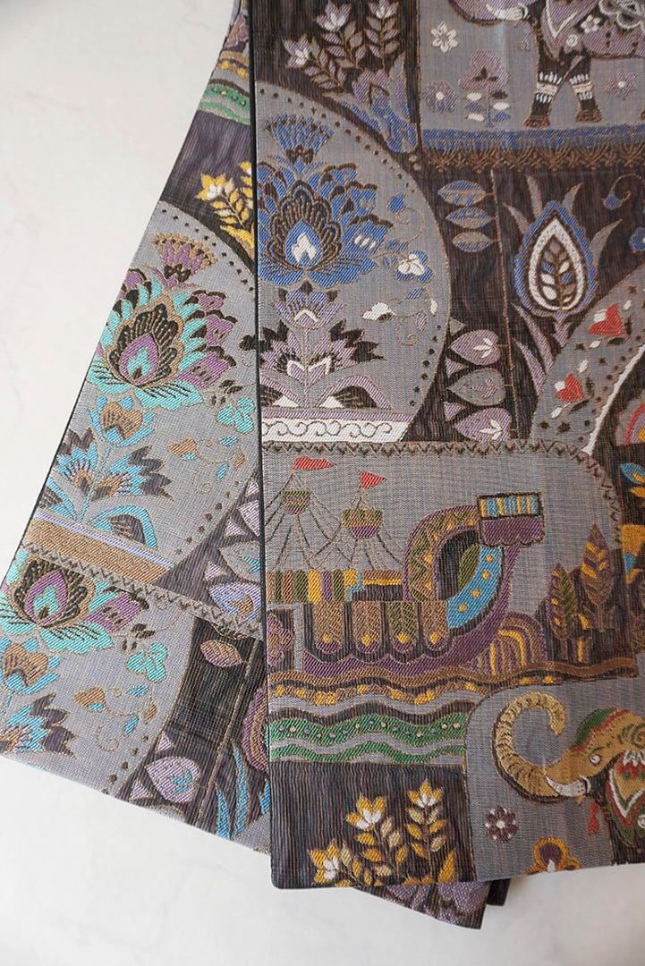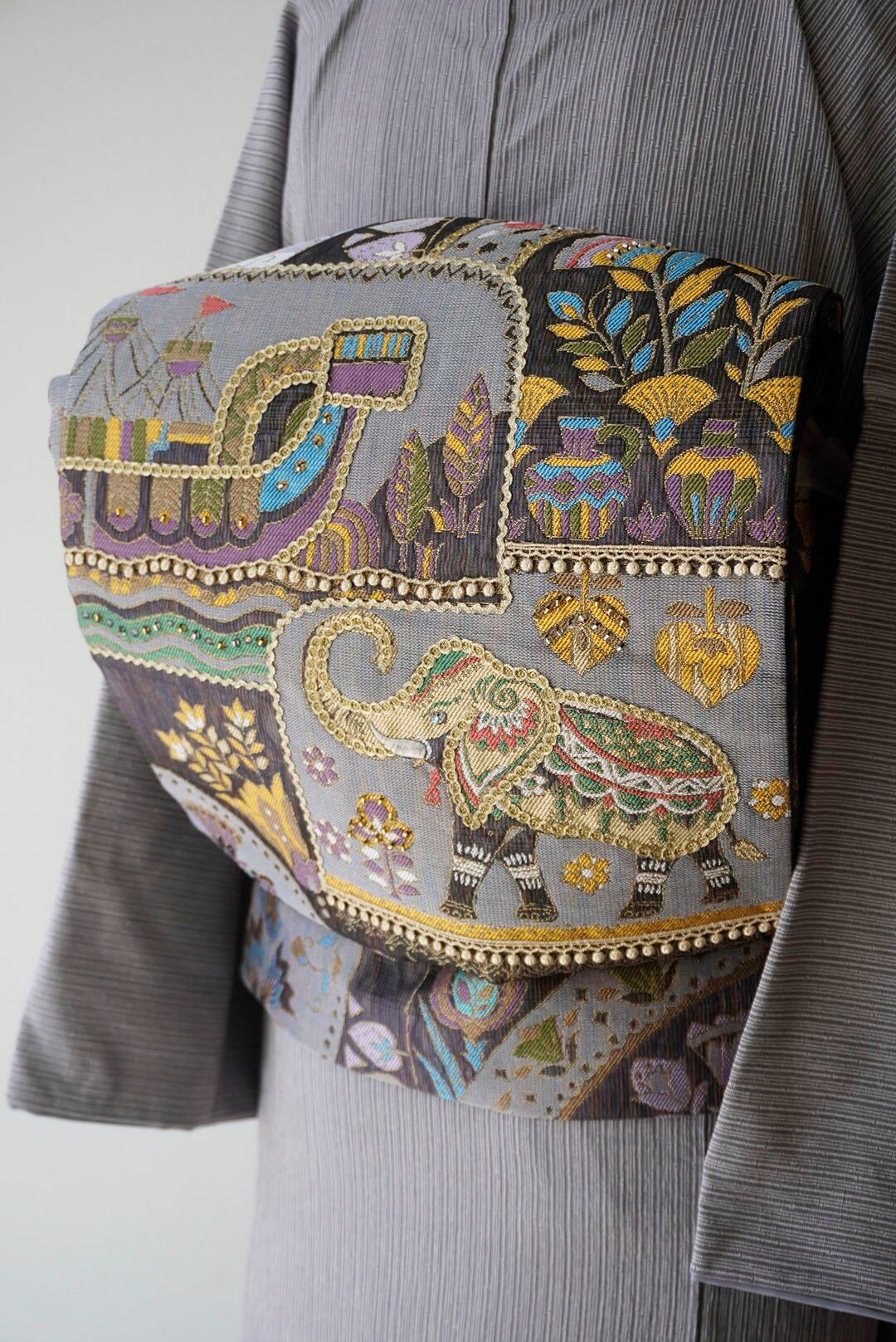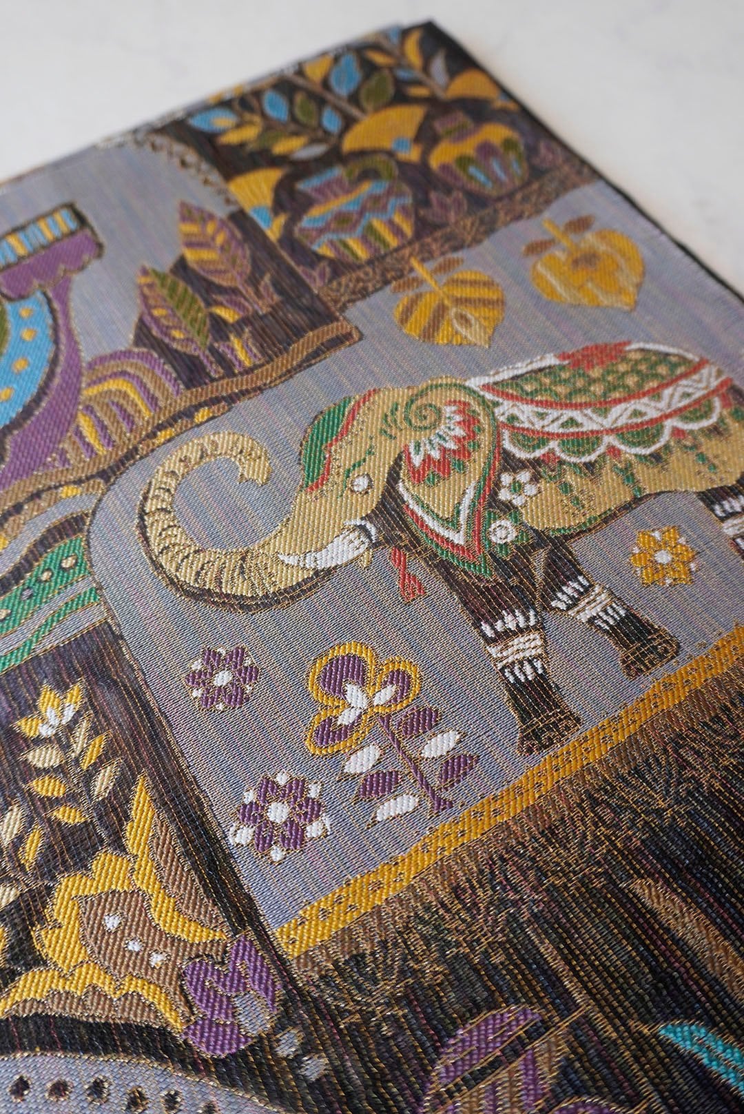 【ふくろ帯】象に船、草花のダークトーン洒落ふくろ帯