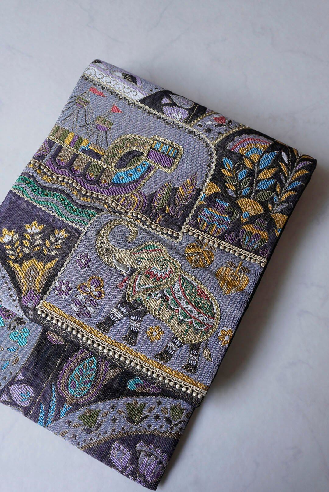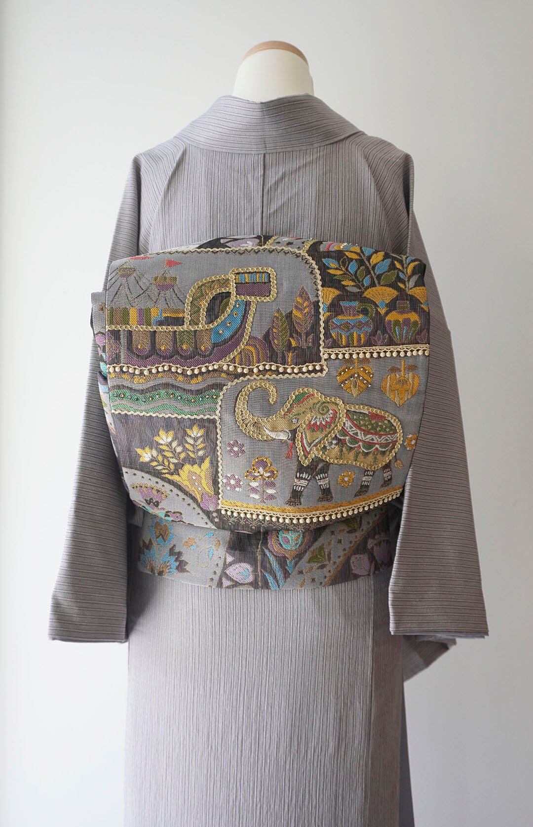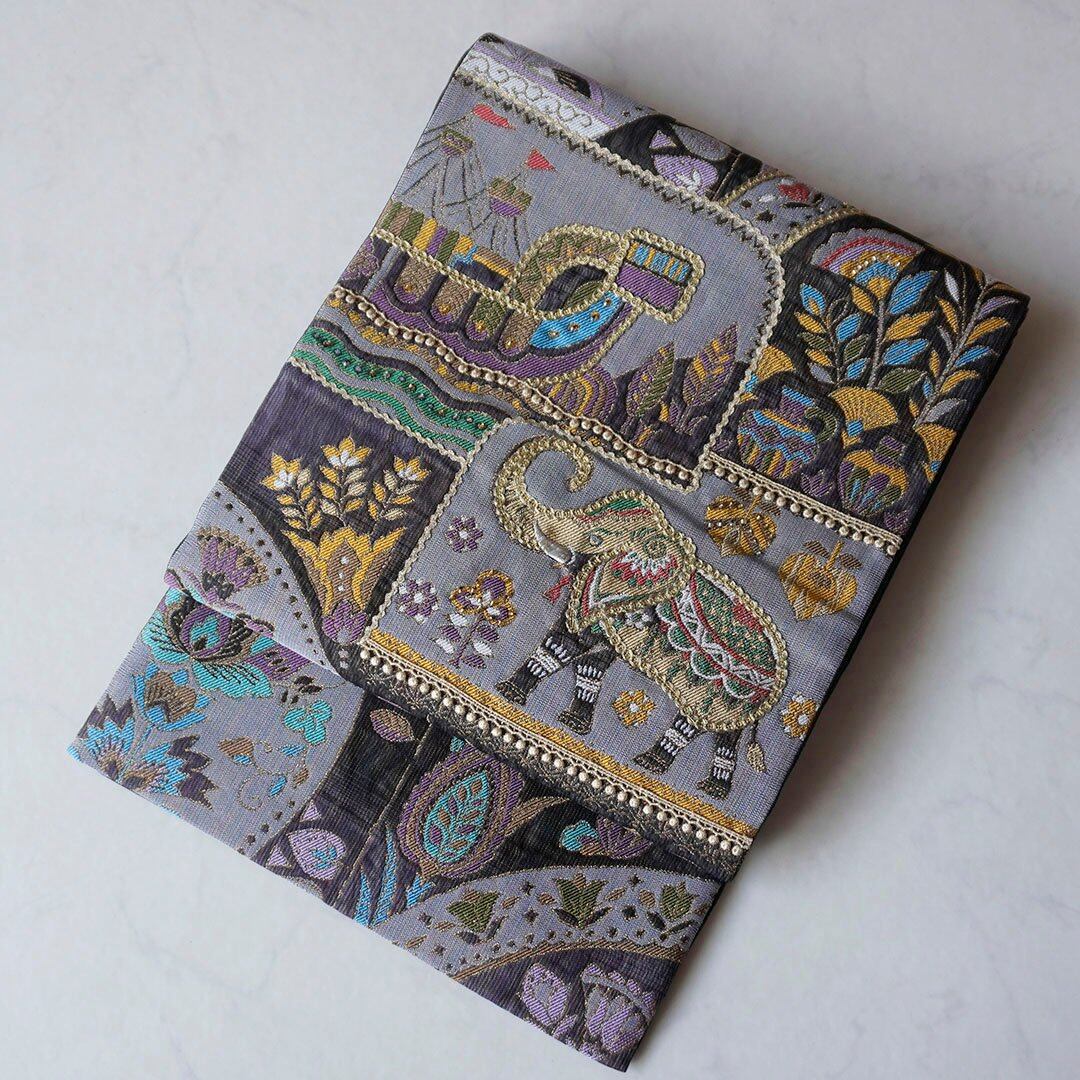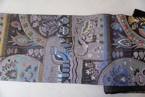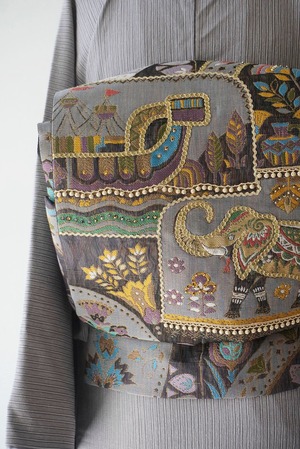 【ふくろ帯】象に船、草花のダークトーン洒落ふくろ帯