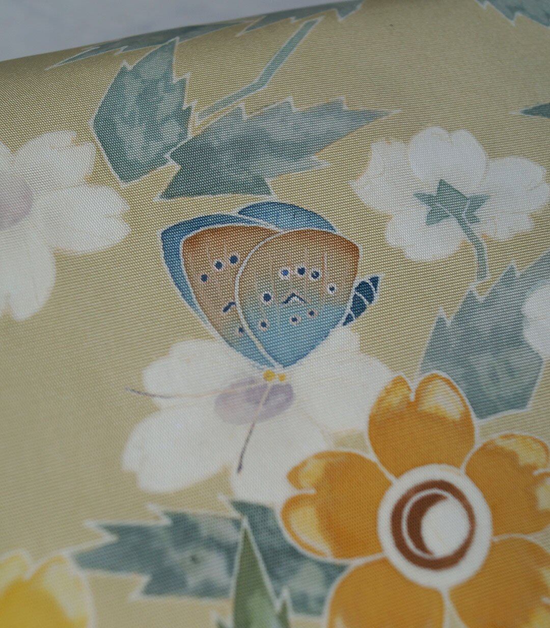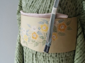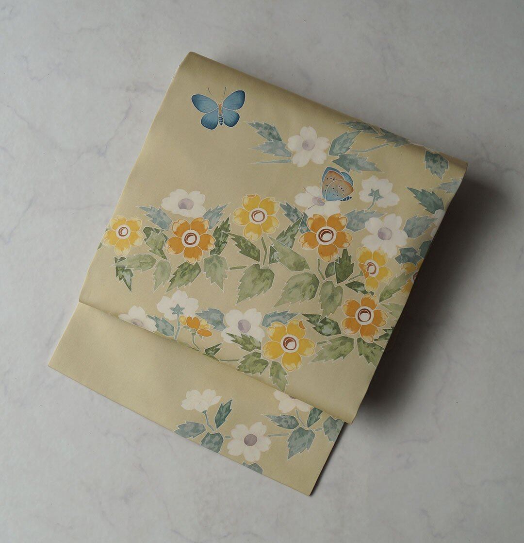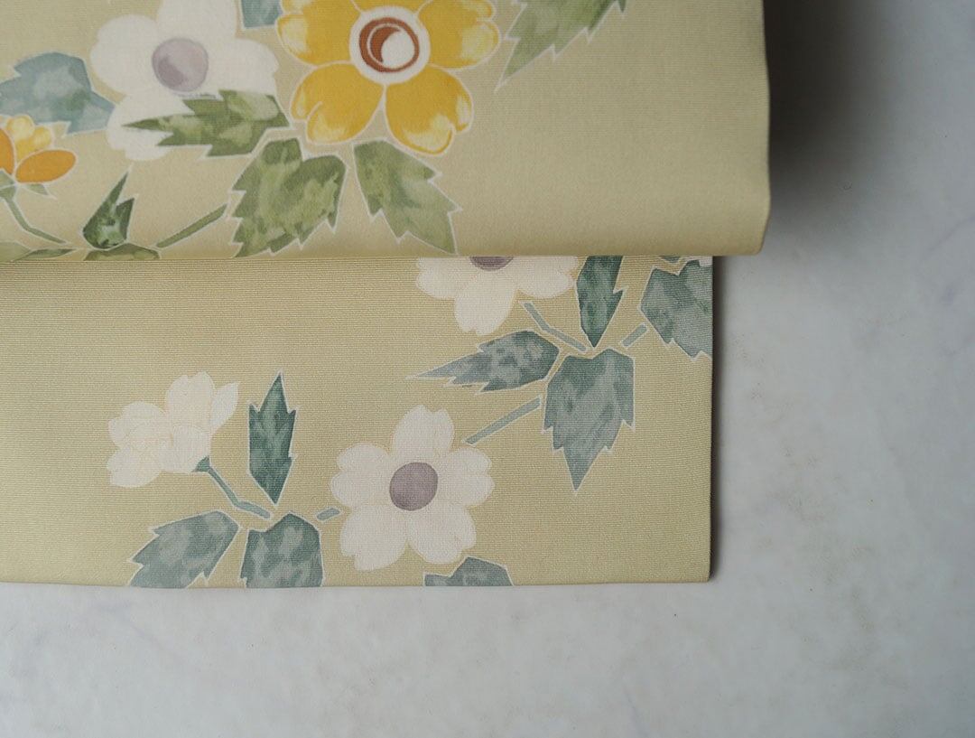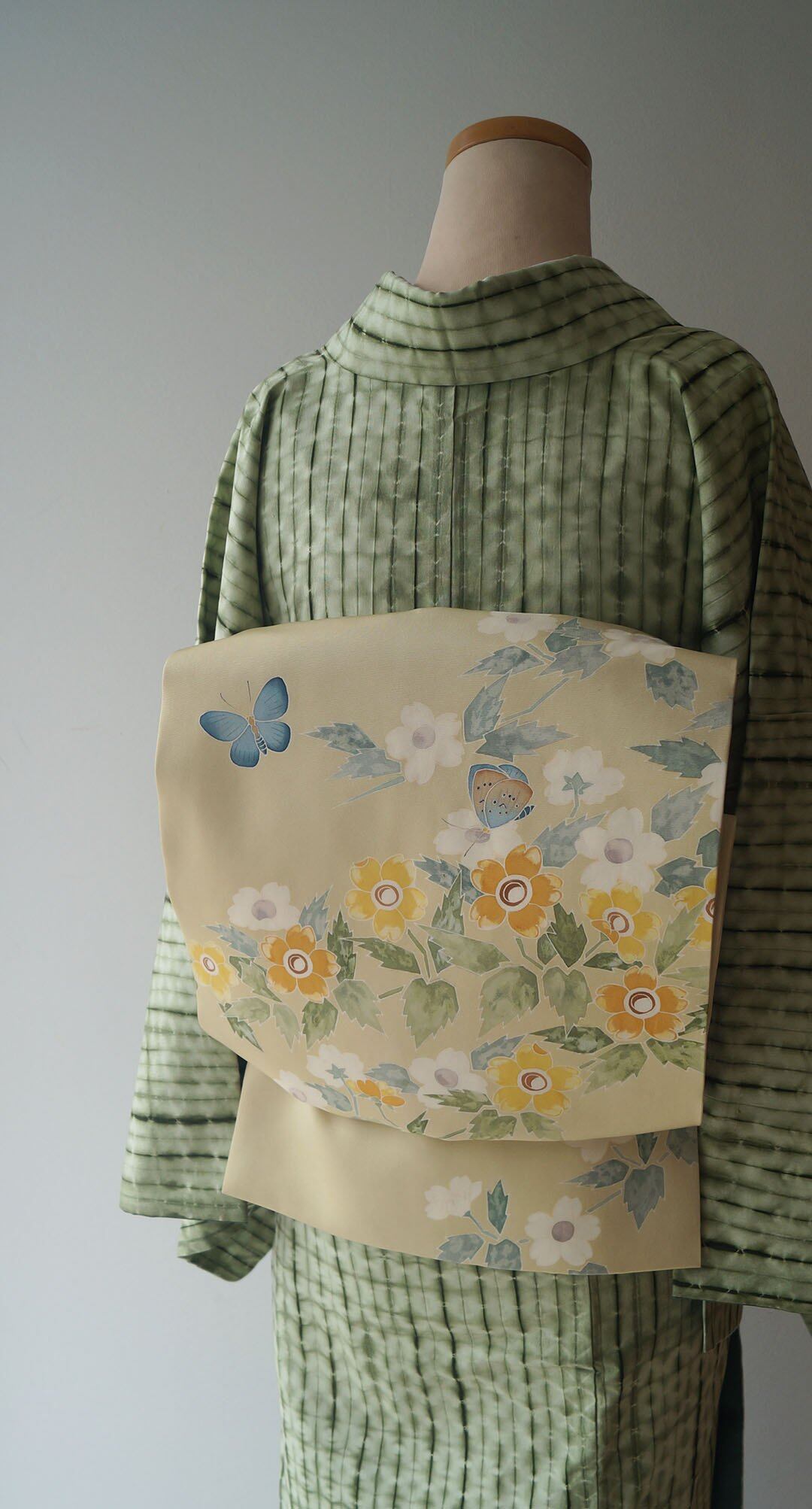 【なごや帯】 若芽色 抽象花に蝶々文 塩瀬なごや帯