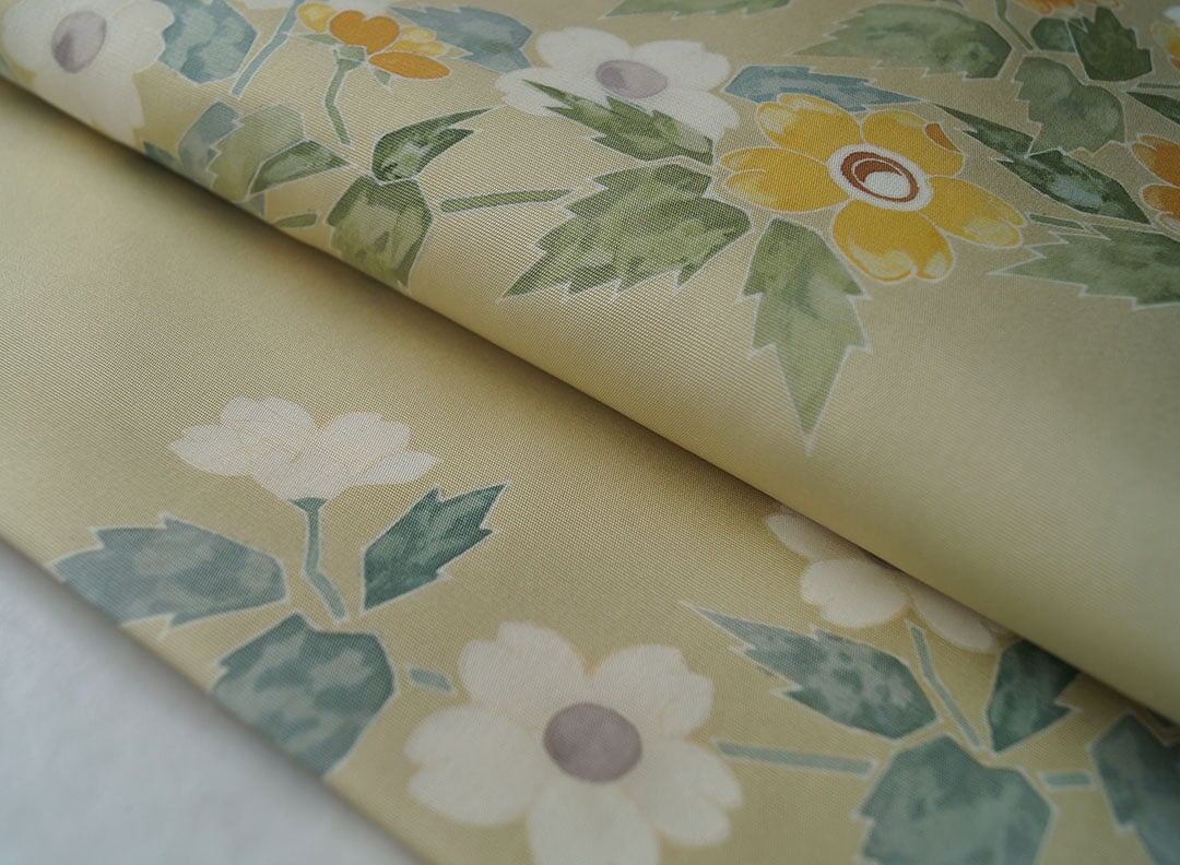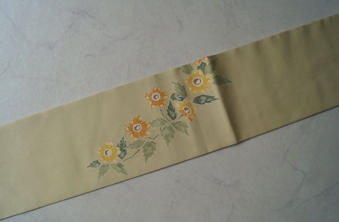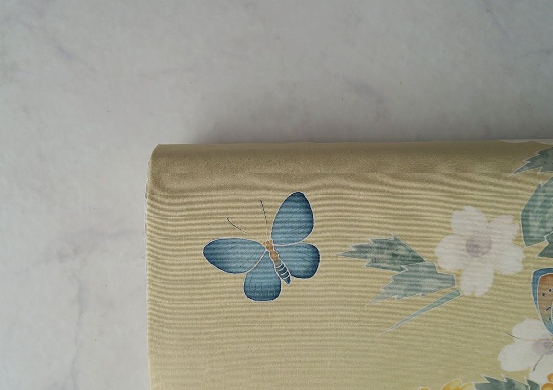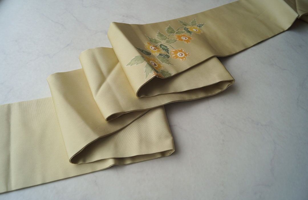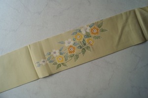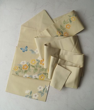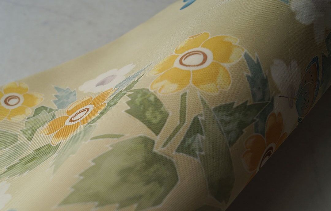 【なごや帯】 若芽色 抽象花に蝶々文 塩瀬なごや帯
