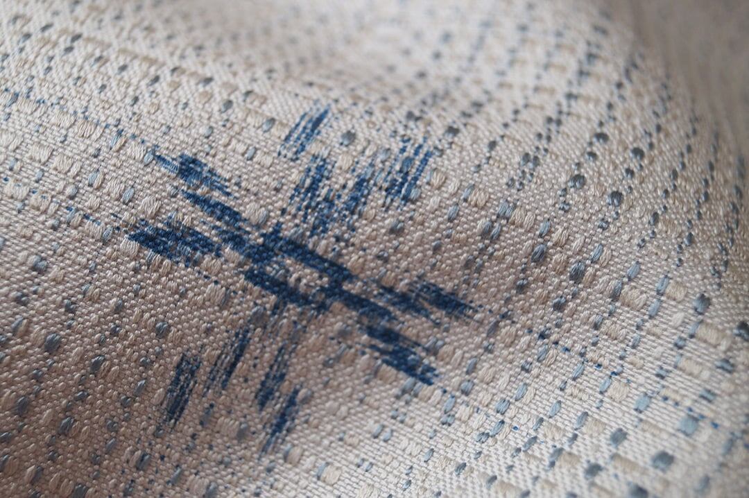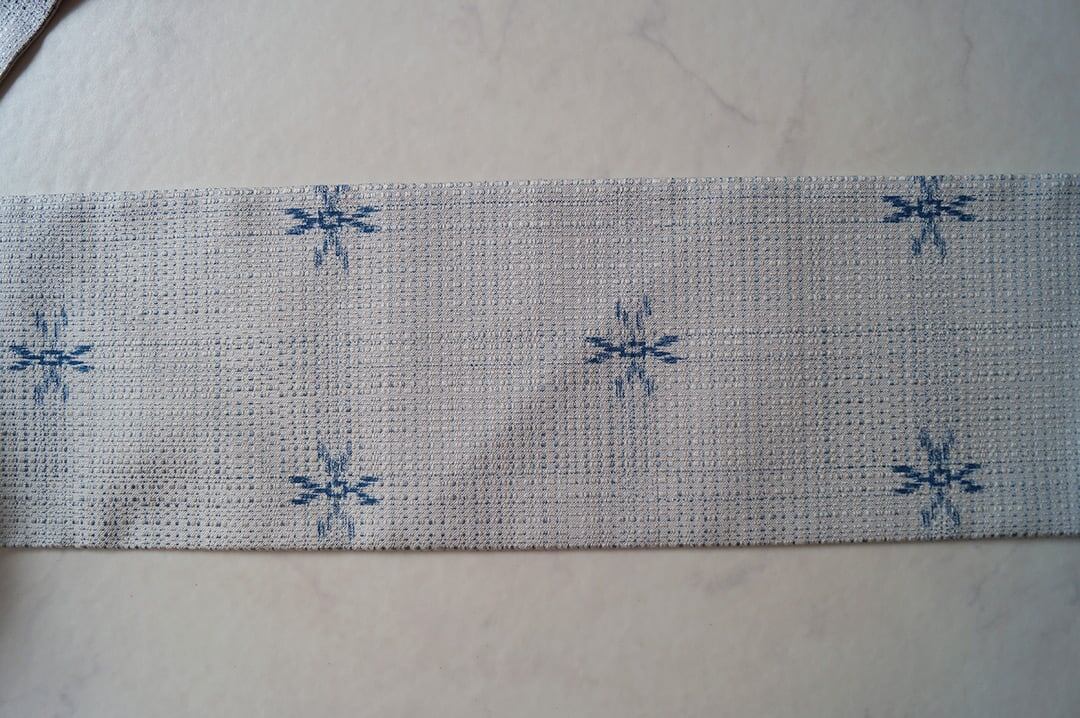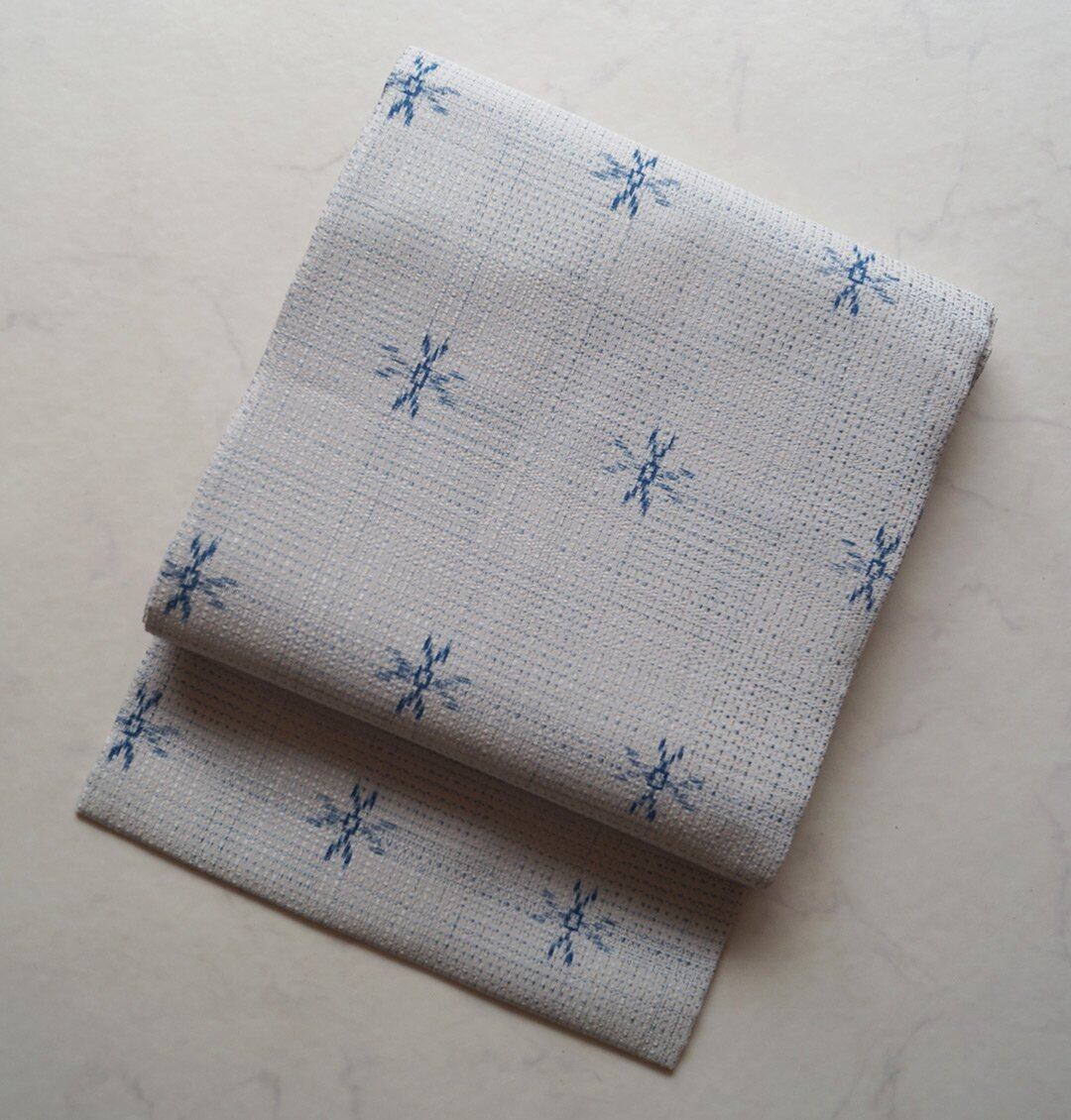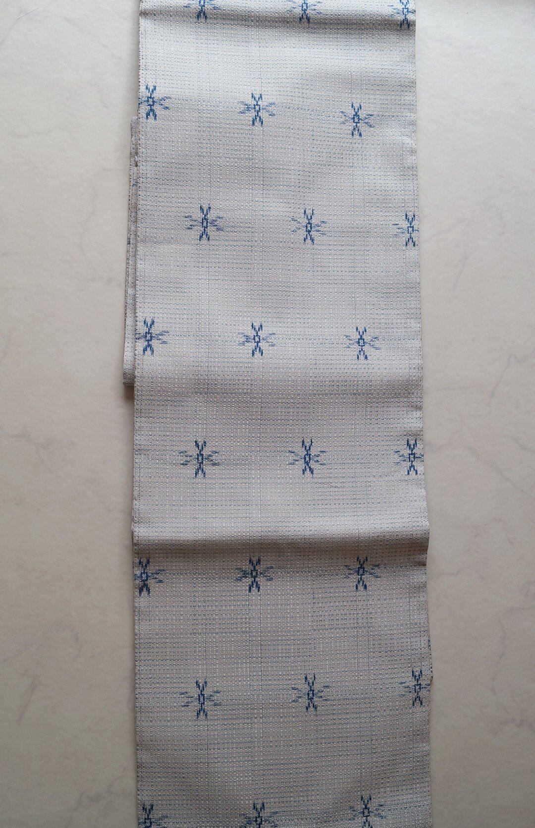 【なごや帯】白練色×ブルー系 格子に絣柄 なごや帯