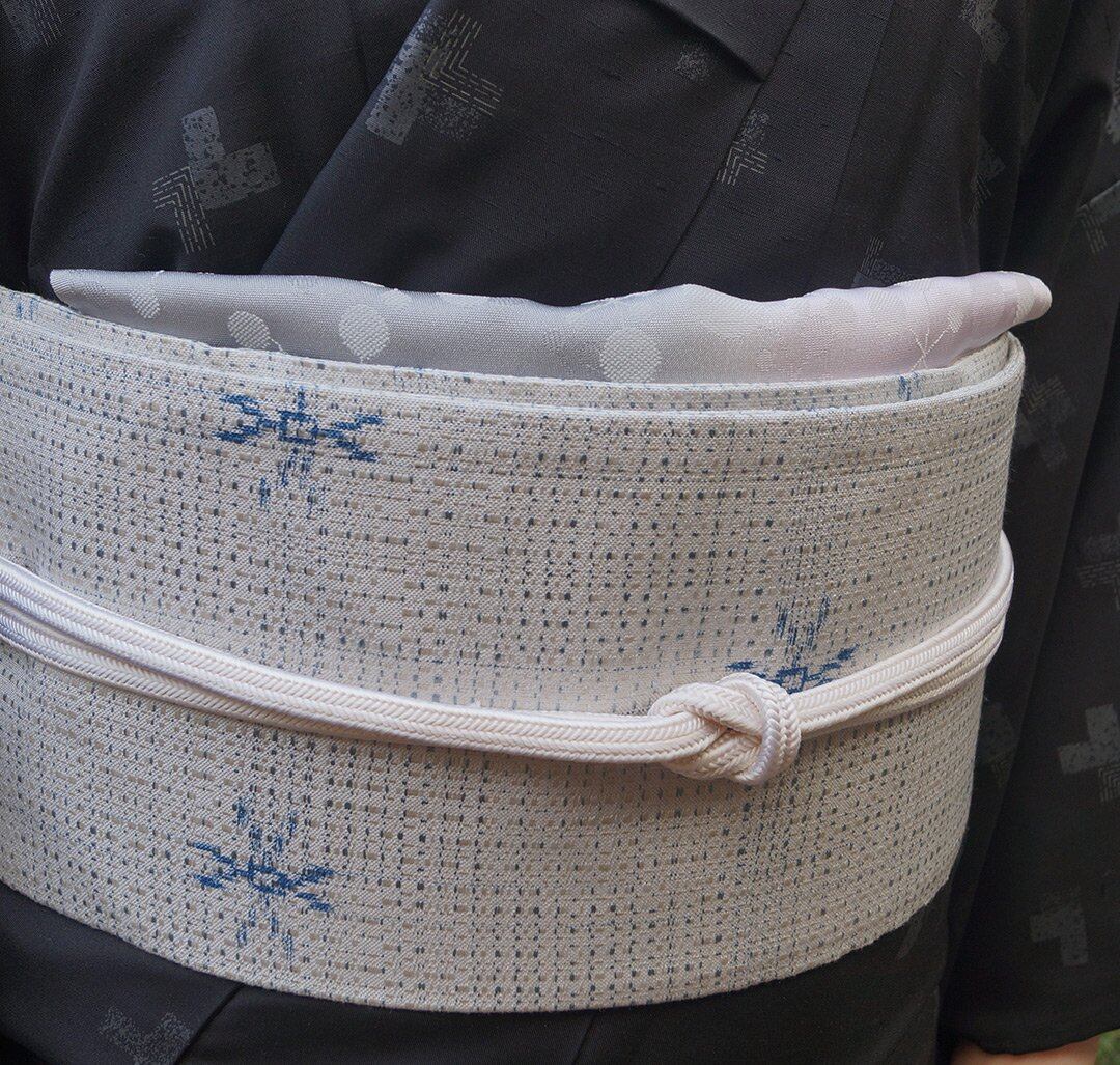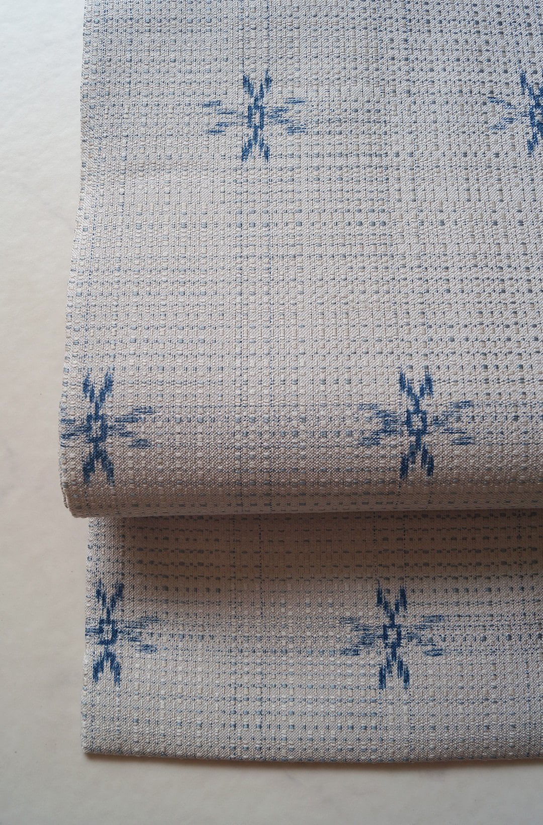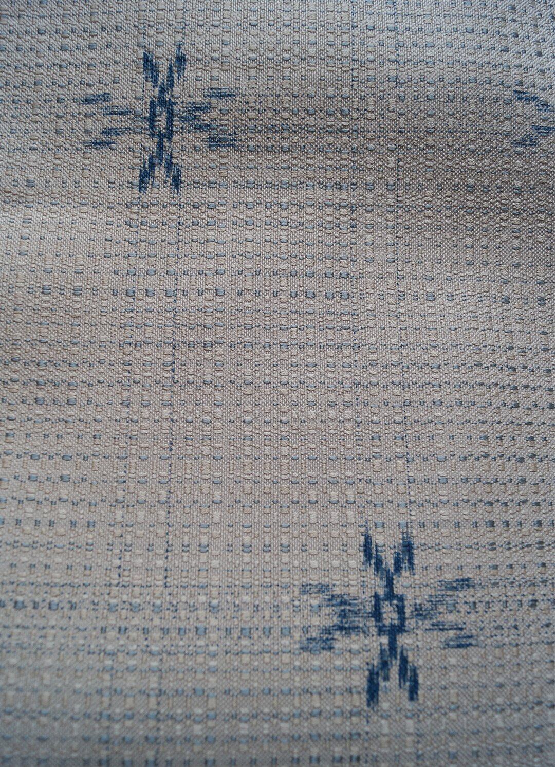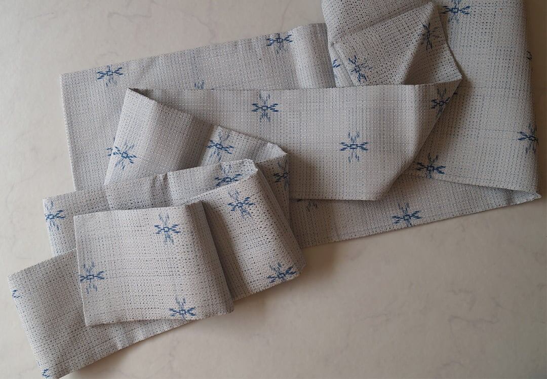 【なごや帯】白練色×ブルー系 格子に絣柄 なごや帯