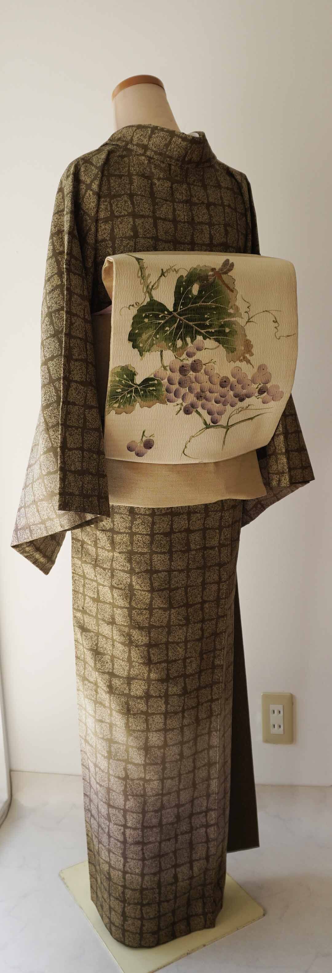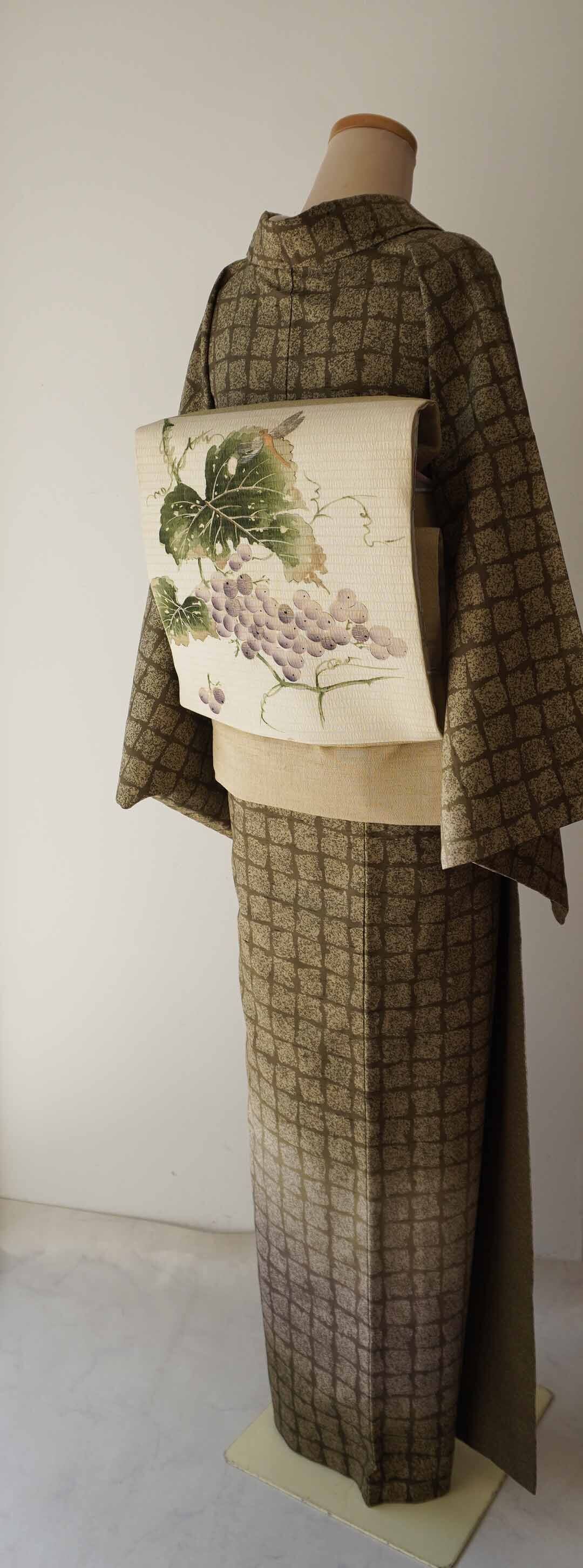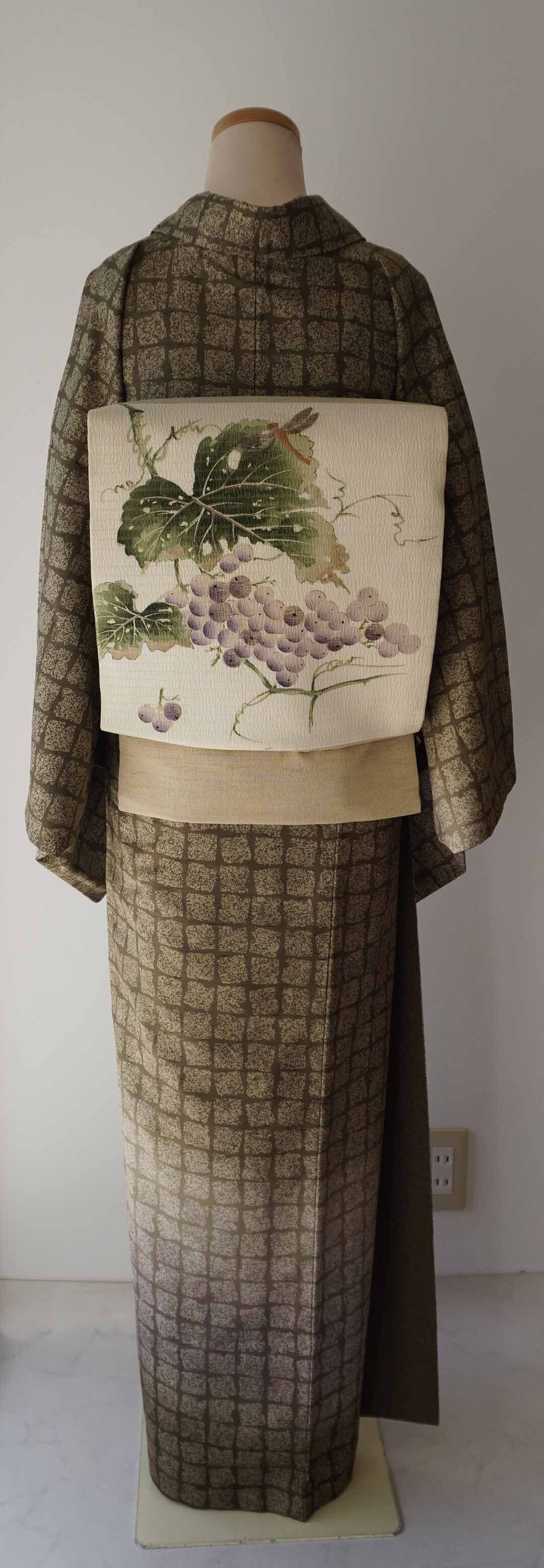 着装画像では葡萄文様の帯を
