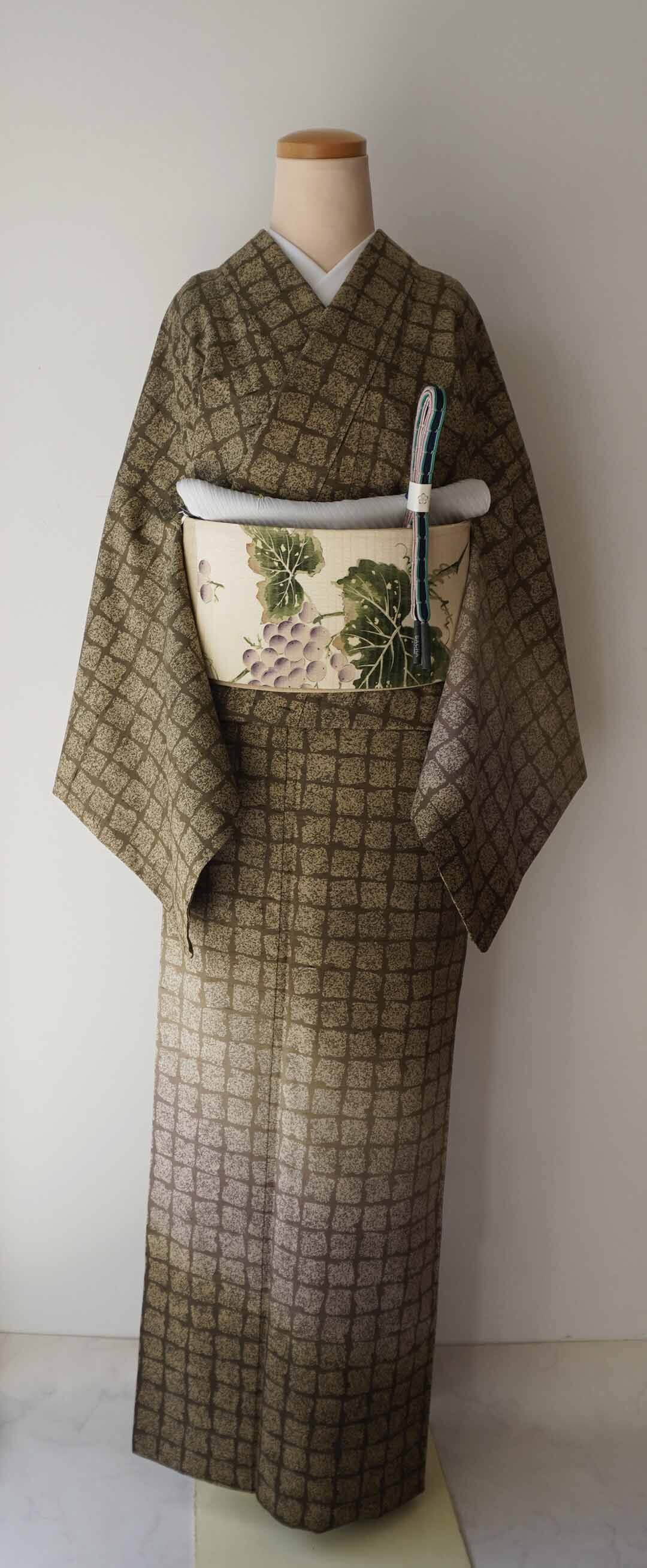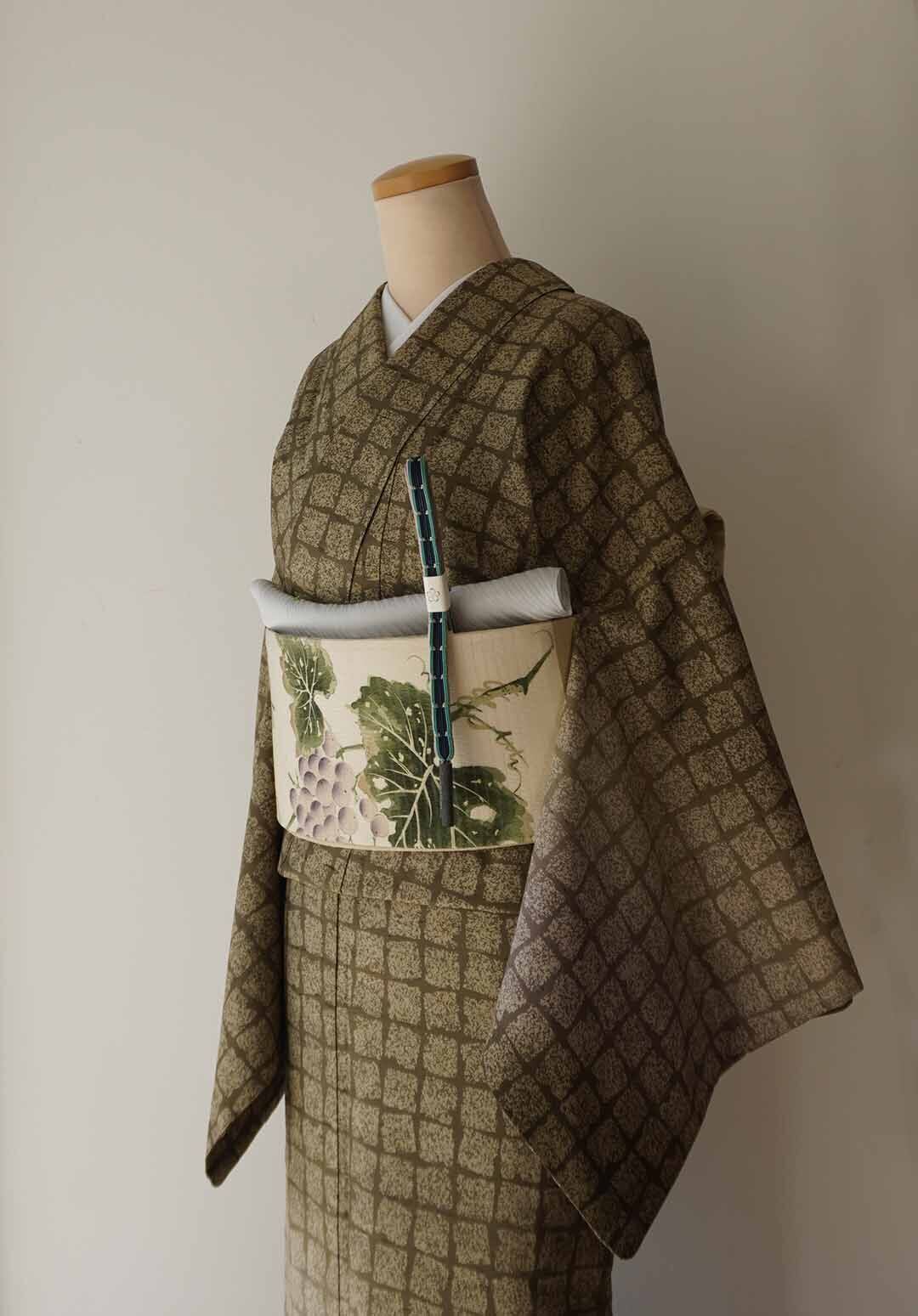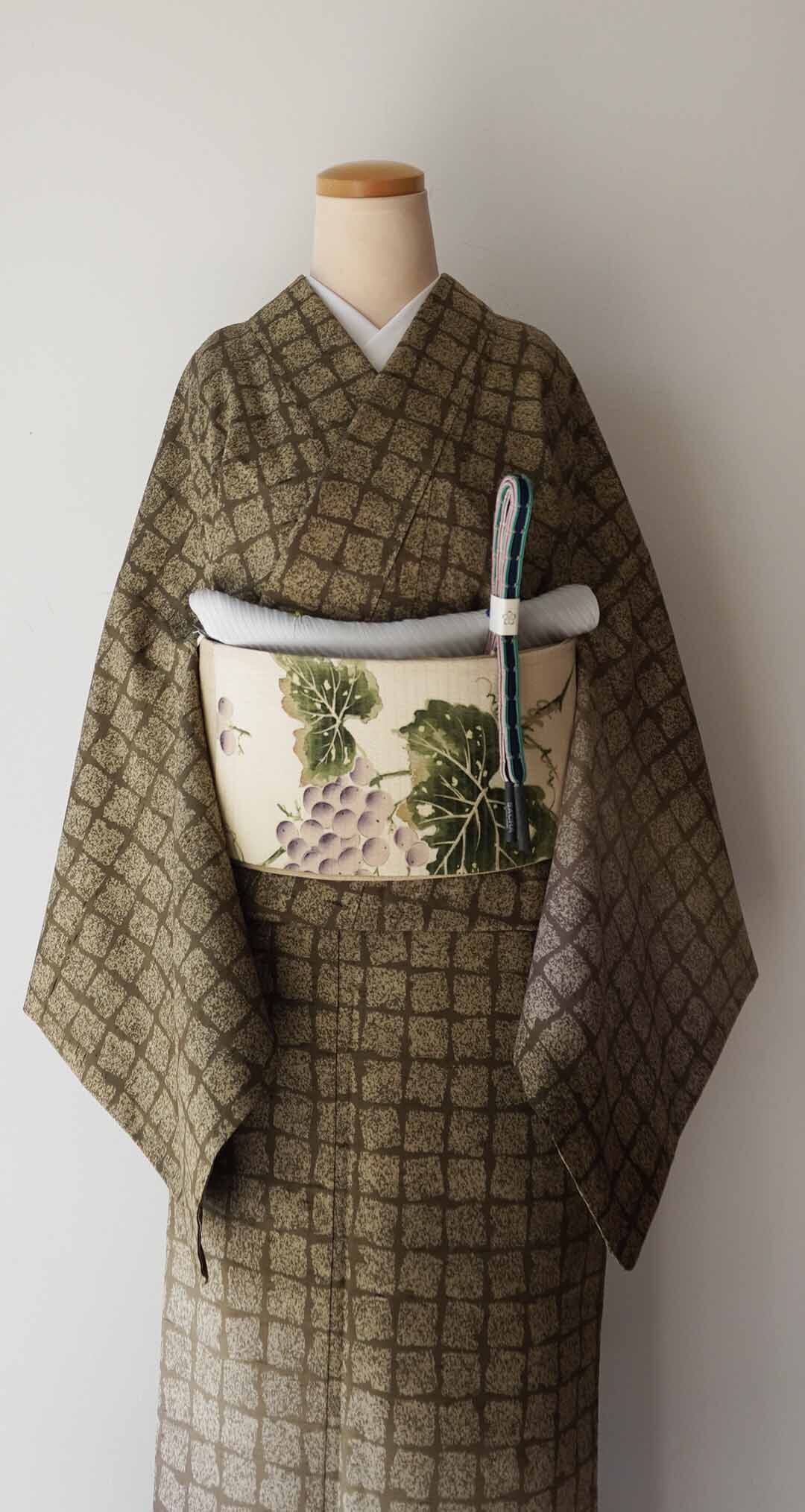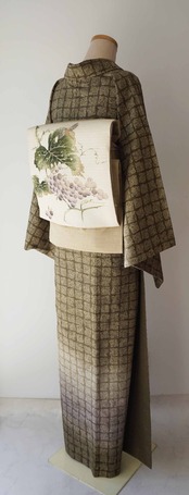 着装画像では葡萄文様の帯を