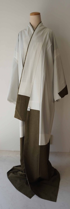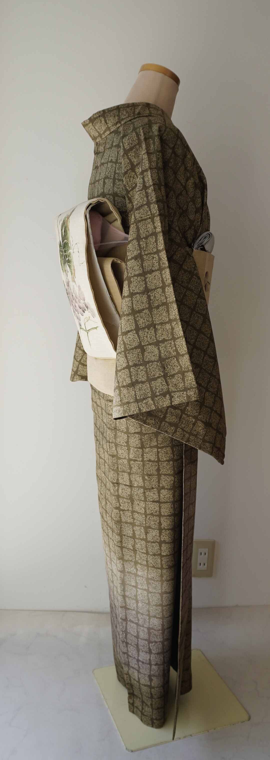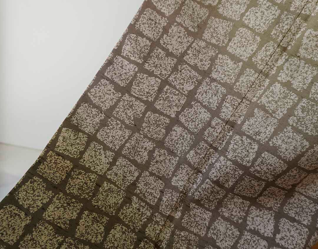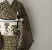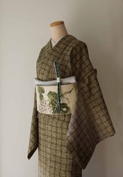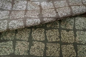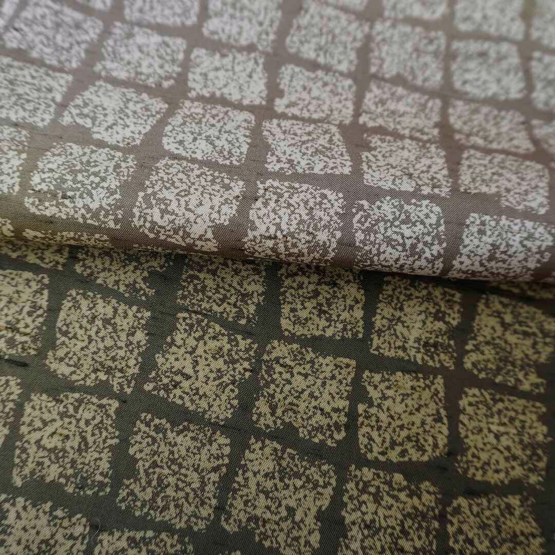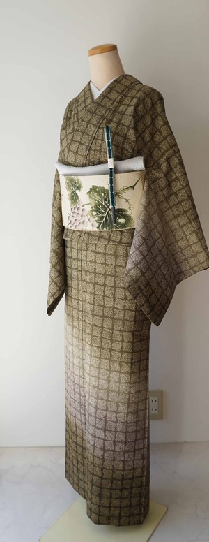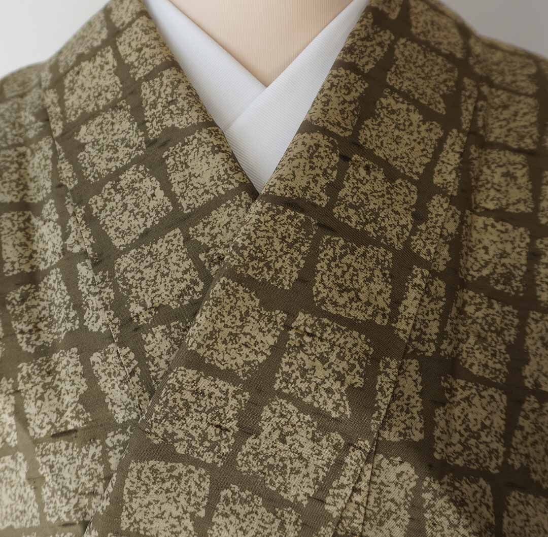 【袷】アースカラーグラデーション 変わり格子文 牛首紬 附下