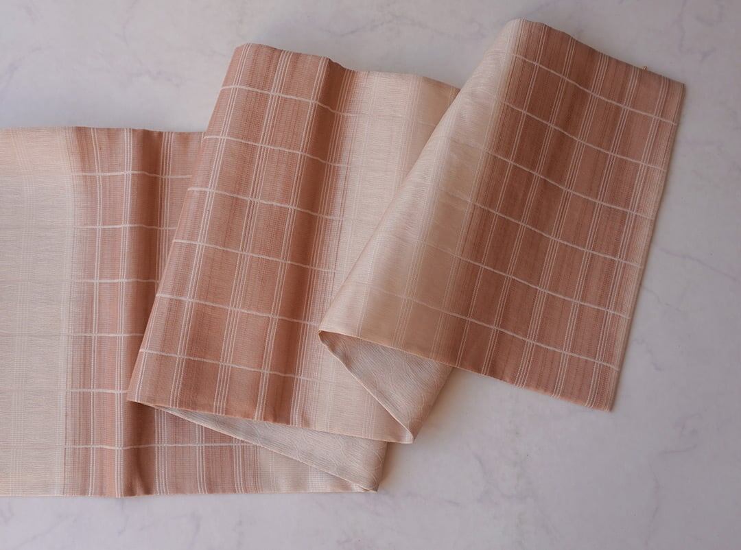 【ふくろ帯】薄桃色×珊瑚色 横段暈かしに格子文 ふくろ帯