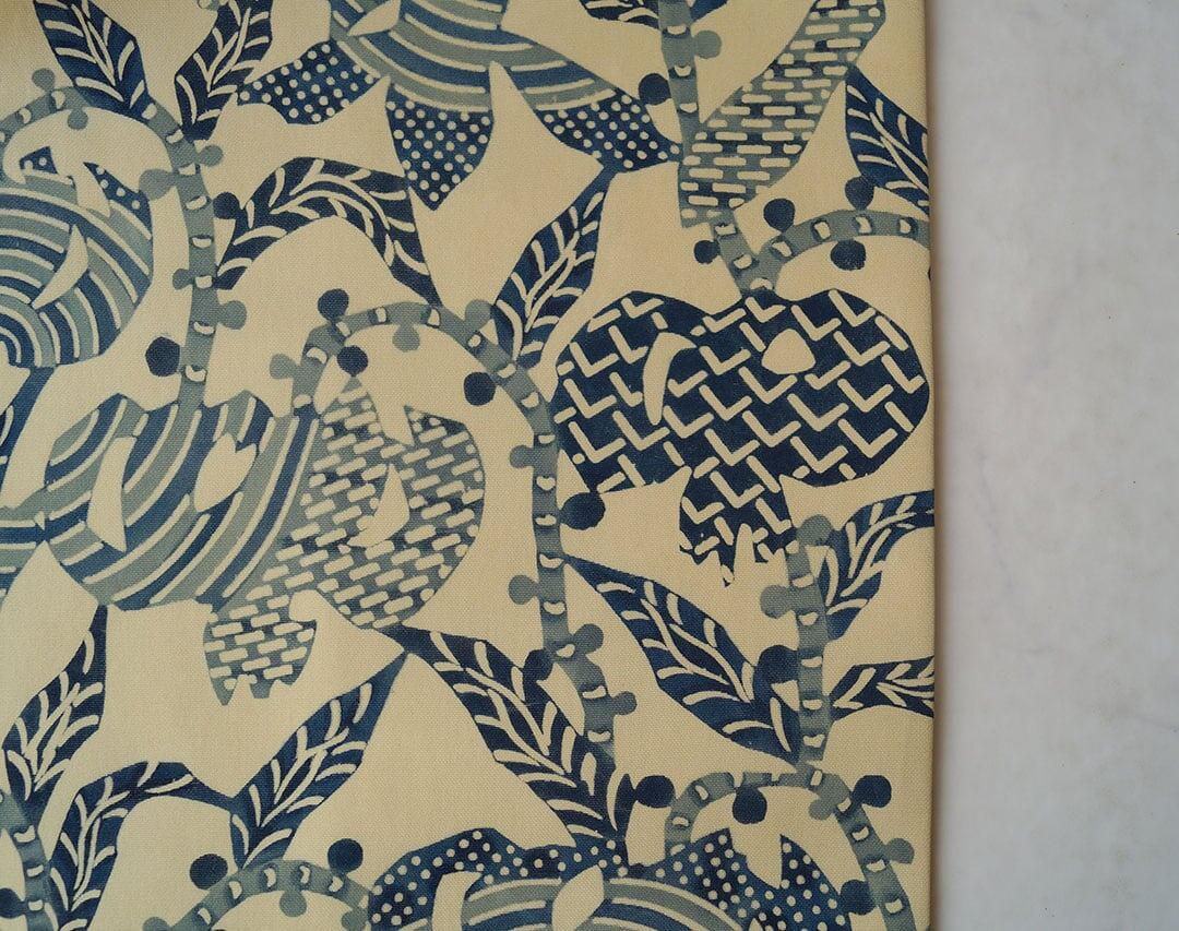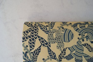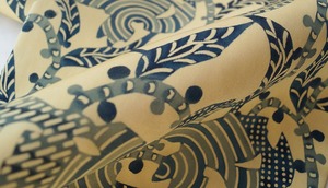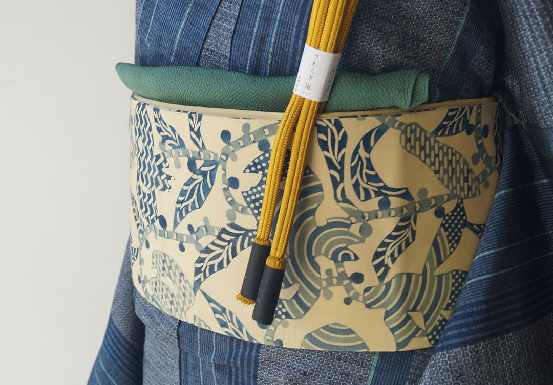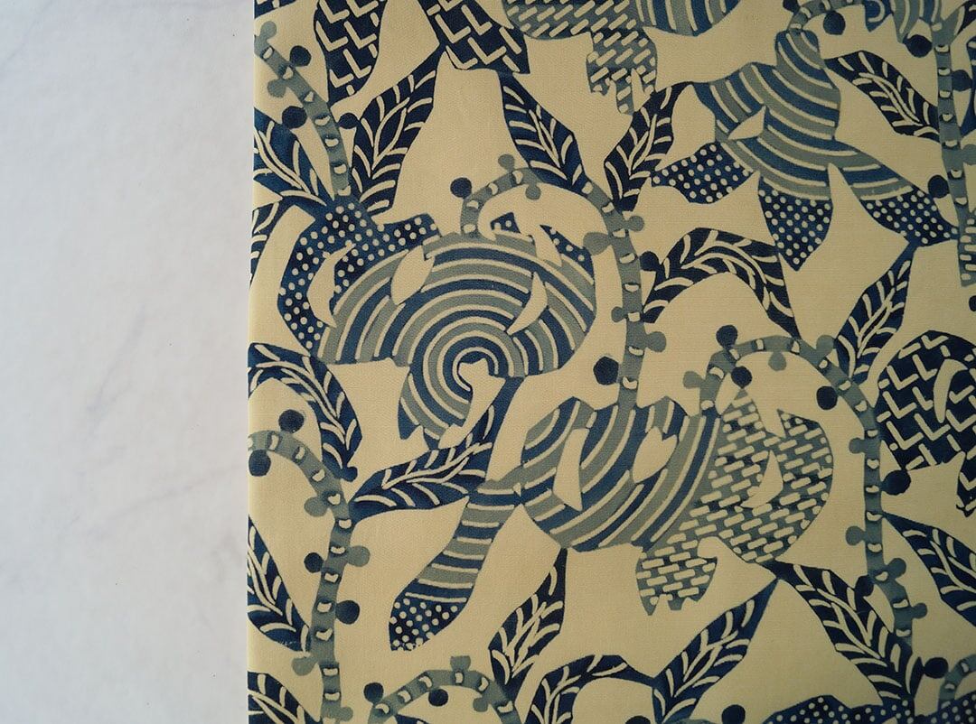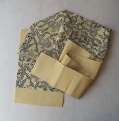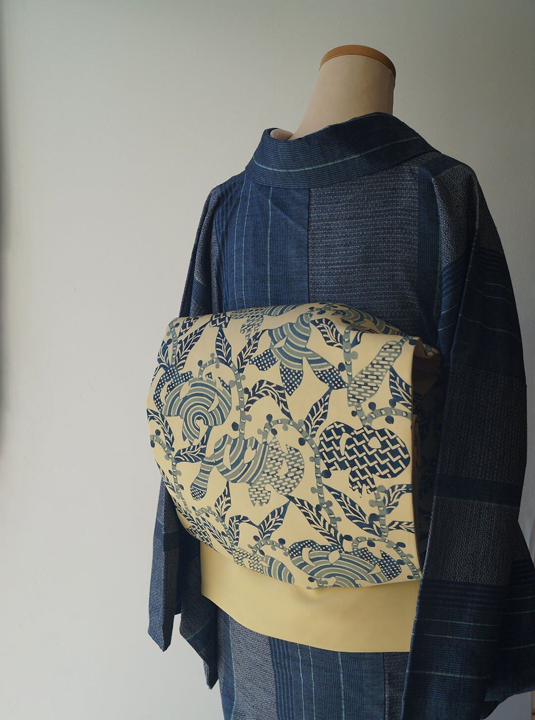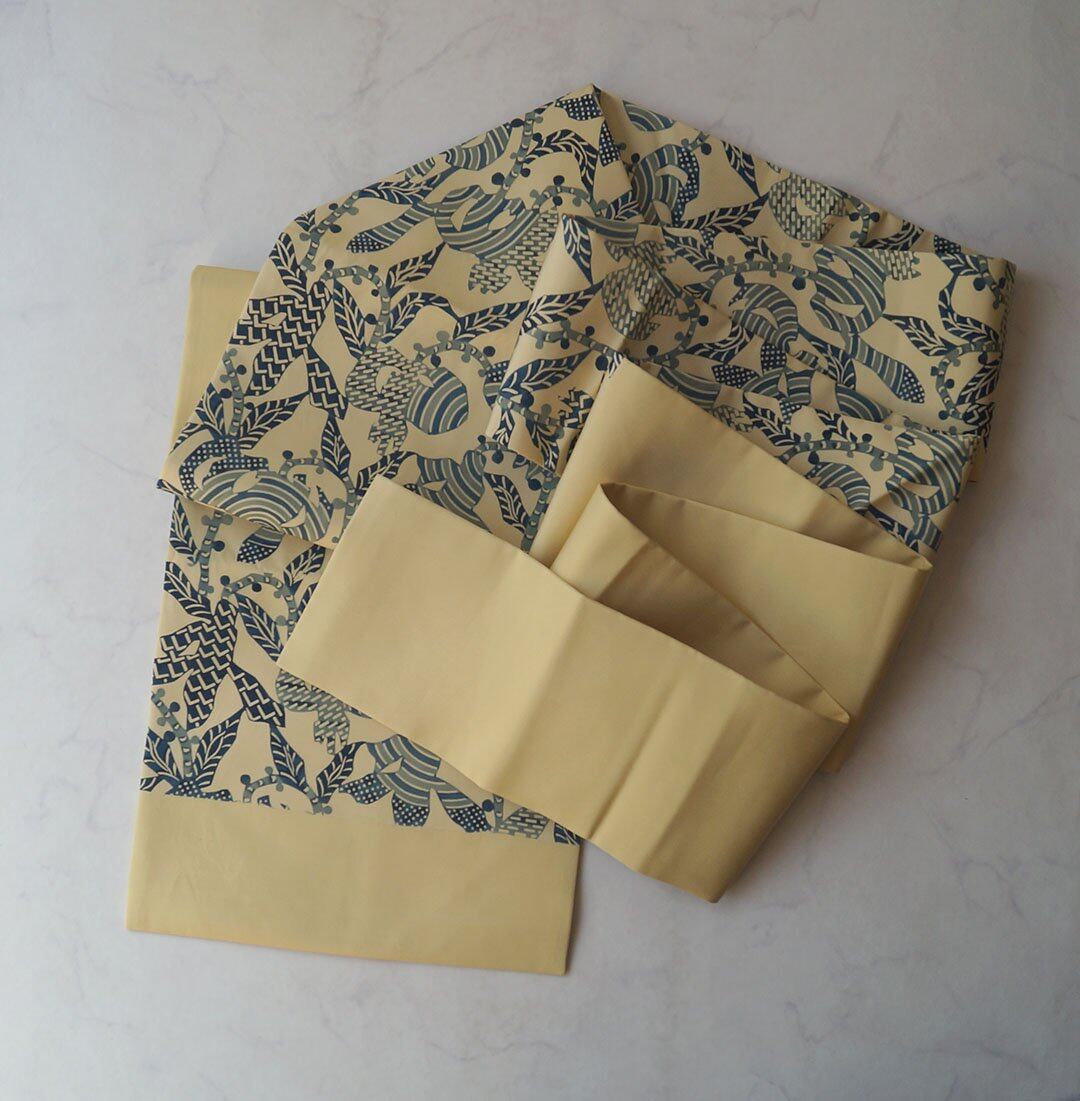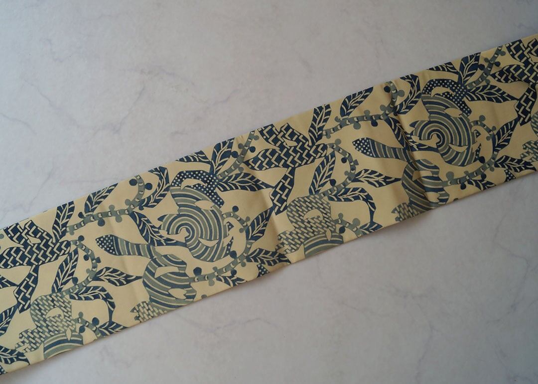 【なごや帯】淡黄色 抽象植物文 型染め 塩瀬なごや帯