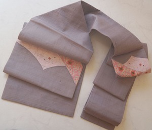 【なごや帯】江戸茶鼠色 切り嵌め風に抽象草花 紬なごや帯