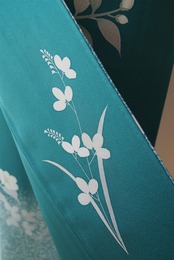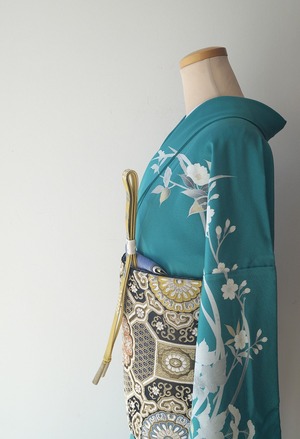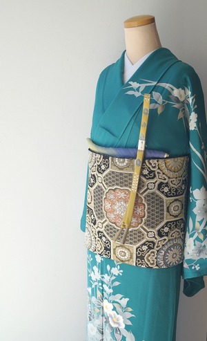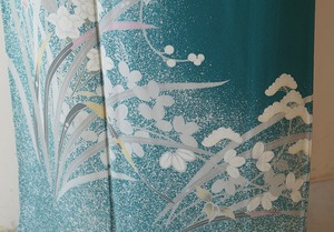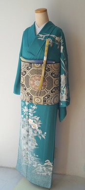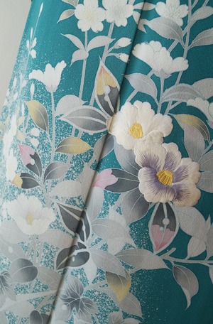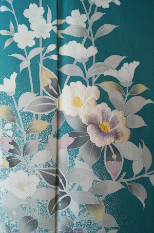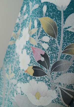 青緑色に吉祥花々文の訪問着です。