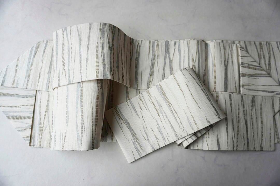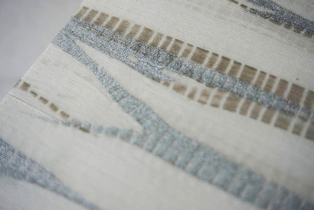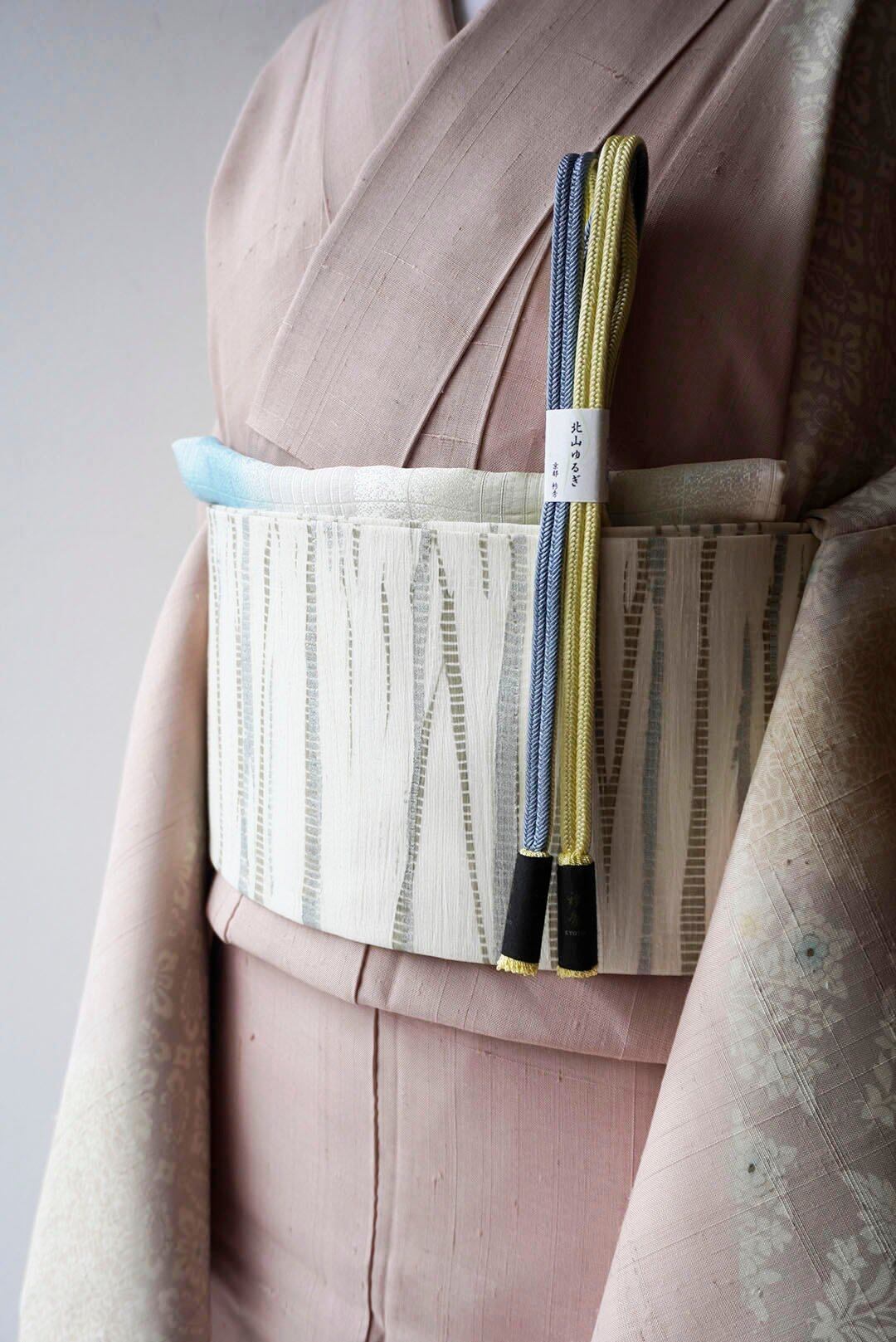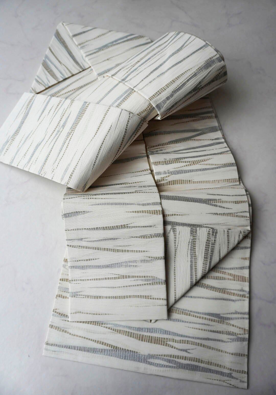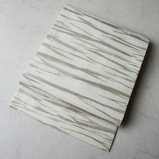 白い紬地にマットな金・控えめなラメ感のある銀の三色使い。